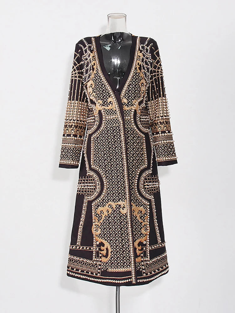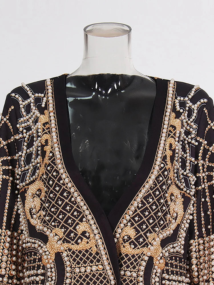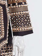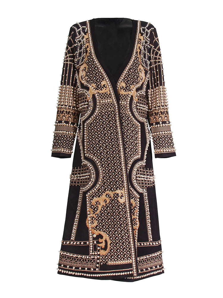 Step into timeless elegance with the Trend4us Luxe Embellished Longline Pearl Beaded Jacket. This exquisite piece is meticulously crafted with intricate pearl beadwork and geometric embellishments, designed to make a bold statement. Featuring a flattering longline silhouette, deep V-neckline, and tailored fit, this jacket effortlessly elevates any ensemble. Perfect for evening events, red carpet occasions, or luxurious gatherings, it blends classic sophistication with contemporary glamour.