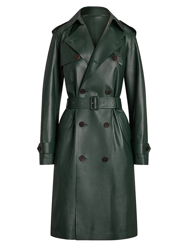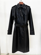 Command attention in the Trend4us Luxe Faux Leather Double-Breasted Trench Coat, a modern reinvention of a timeless silhouette. Crafted from premium smooth faux leather, this longline coat delivers both structure and sophistication with its tailored cut and glossy finish. Featuring a double-breasted front, belted waist, and classic lapel collar, it offers a perfect balance between edgy allure and elegant charm.