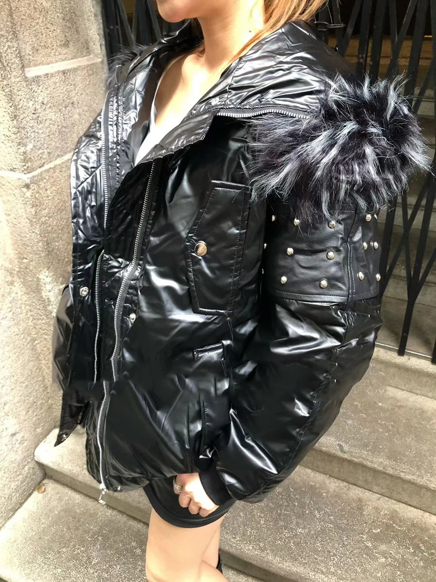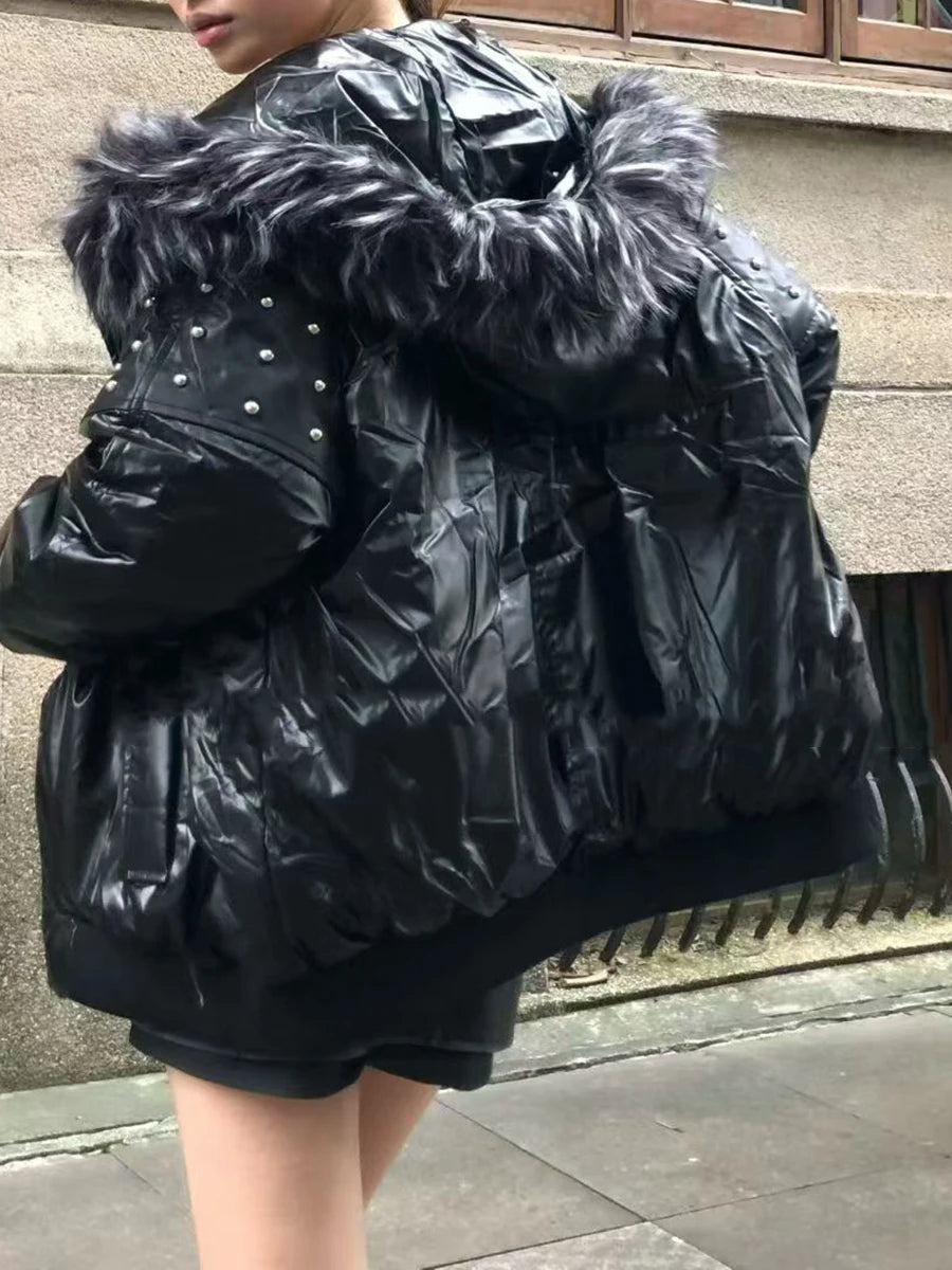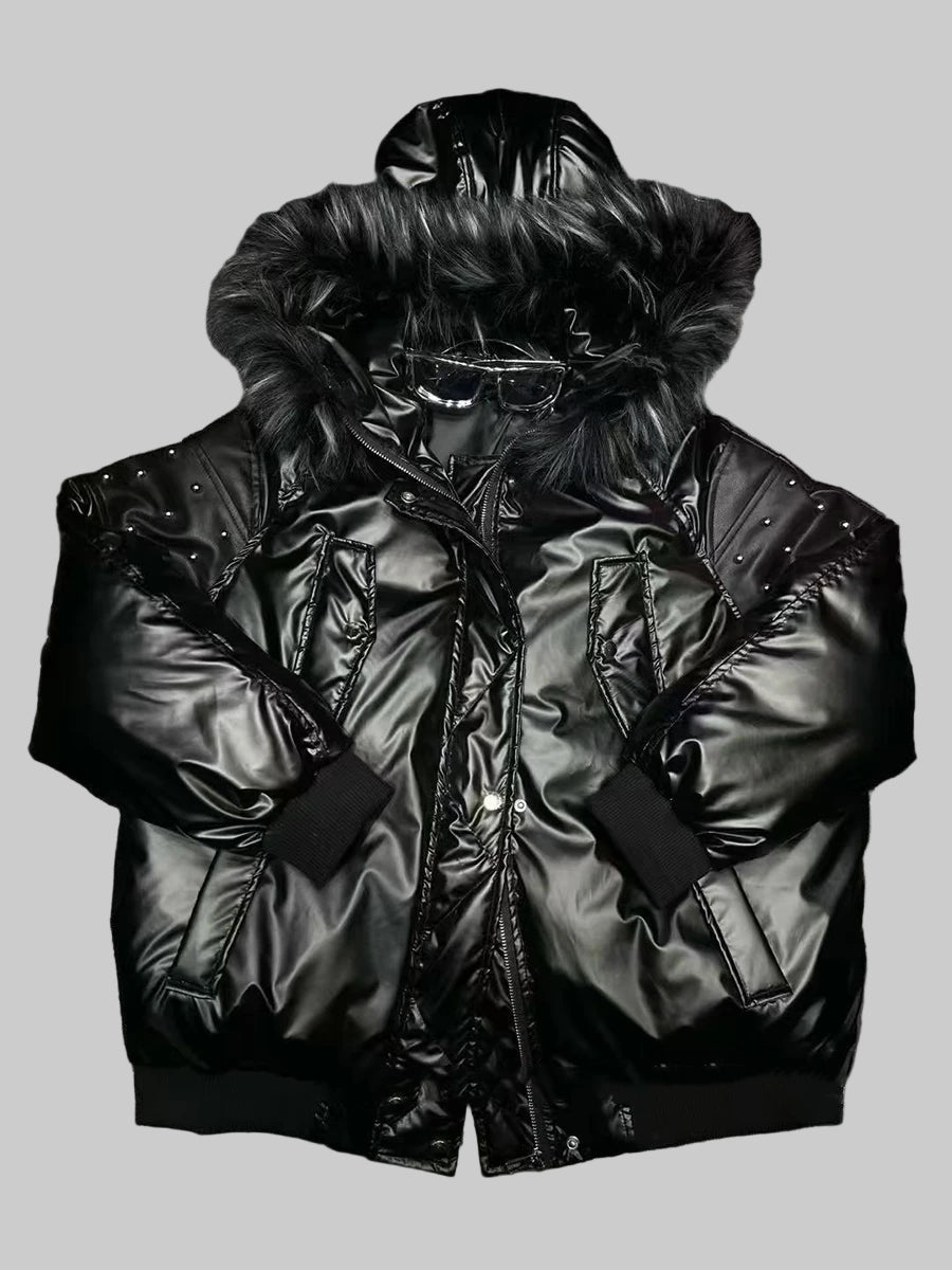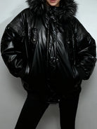 Embrace a bold, street-luxe edge this season with the Trend4us Luxe Faux Leather Hooded Puffer Jacket. Designed for both warmth and attitude, this glossy puffer features a soft faux leather shell with a detachable faux fur-trimmed hood for a chic, modern finish. The oversized silhouette and padded construction ensure maximum comfort and insulation, while the metallic stud accents on the sleeves add a subtle rebellious flair. Perfect for layering over sleek activewear or casual denim, this piece makes a confident statement from day to night.