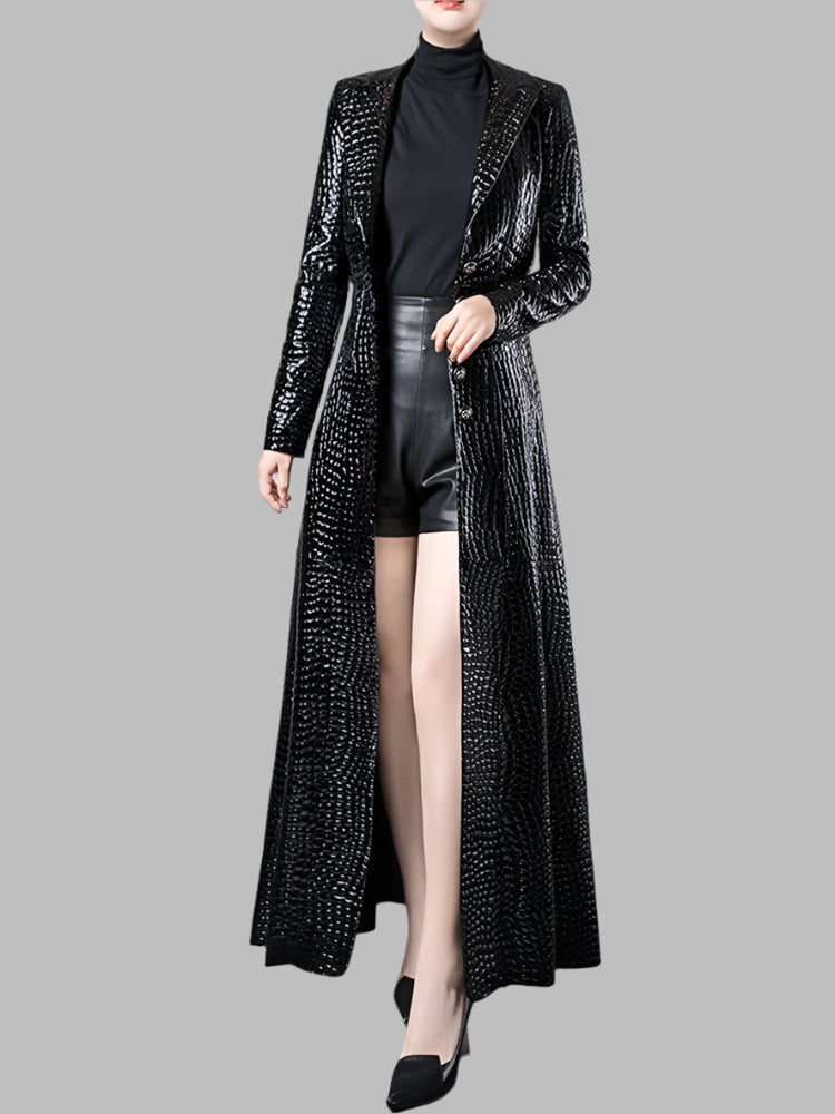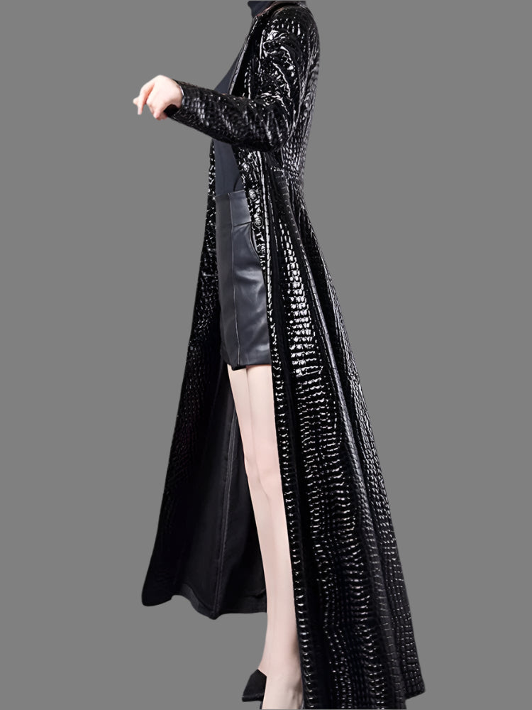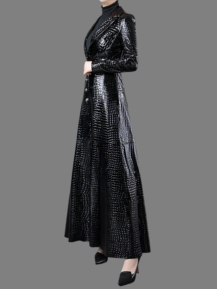 Make a bold fashion statement with the Trend4us Luxe Glossy Long Leather Trench Coat, designed for those who embrace sophistication with an edge. Crafted from high-quality faux leather with a striking croc-embossed texture, this longline trench coat exudes confidence and luxury. The sleek, glossy finish enhances its high-fashion appeal, while the structured silhouette and tailored fit create a dramatic, elongating effect.