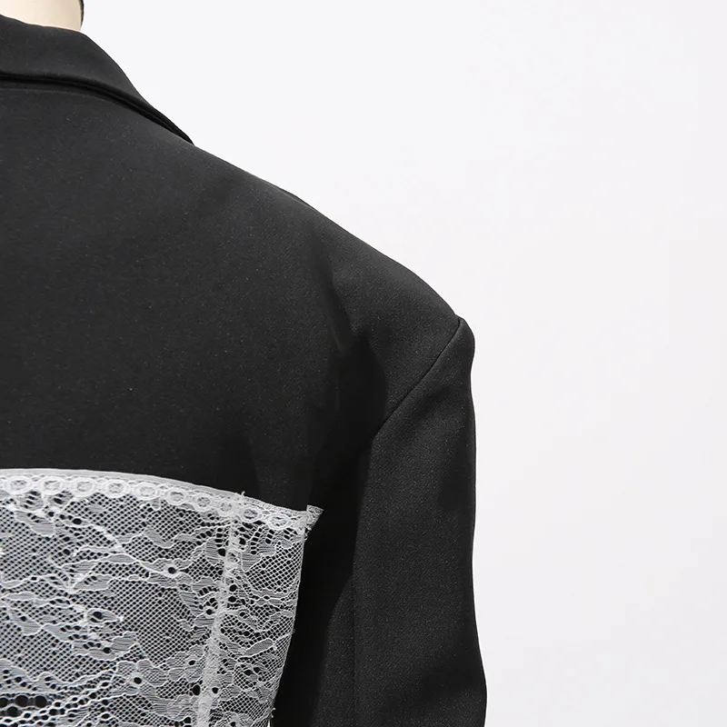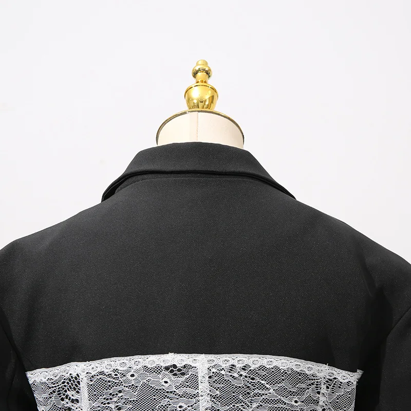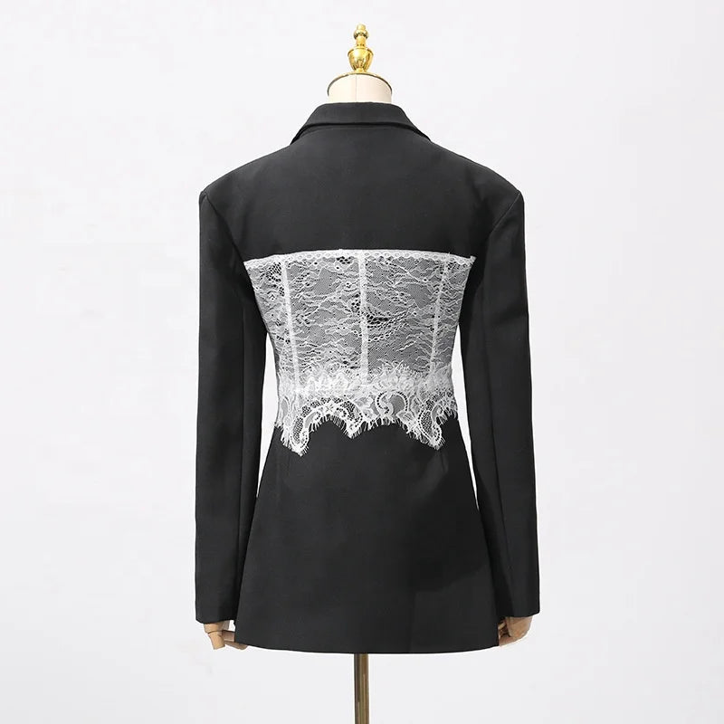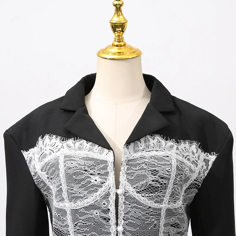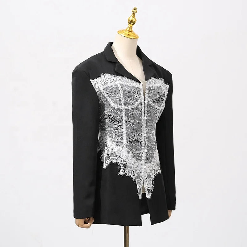 Featuring a slim-fit design with lightly padded shoulders, this blazer contours the waist while the sheer lace paneling adds a romantic touch. Perfect for pairing with high-waisted trousers, skirts, or sleek heels, it transitions effortlessly from evening elegance to high-fashion streetwear.