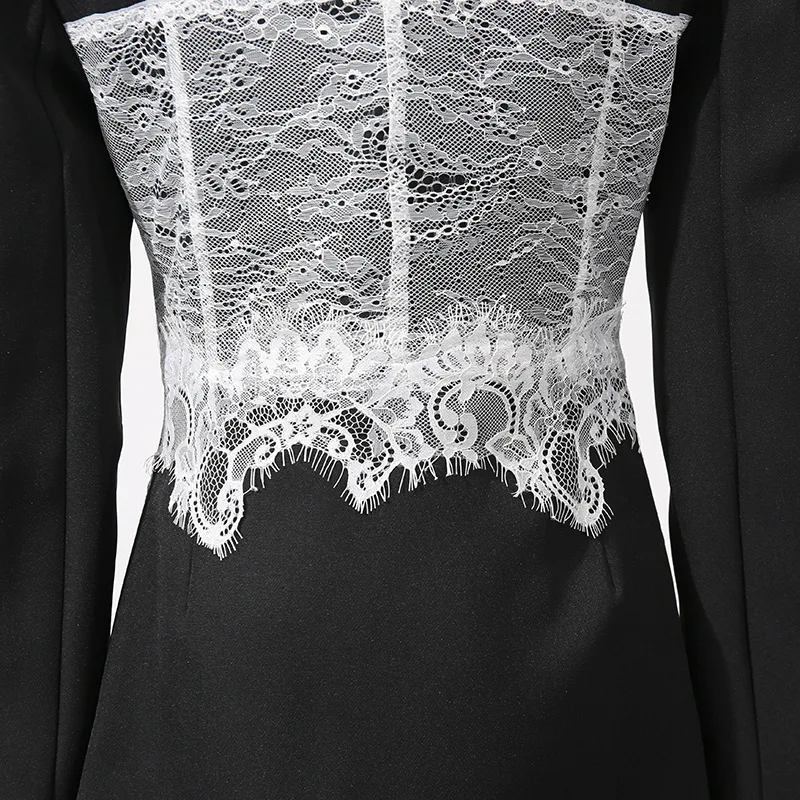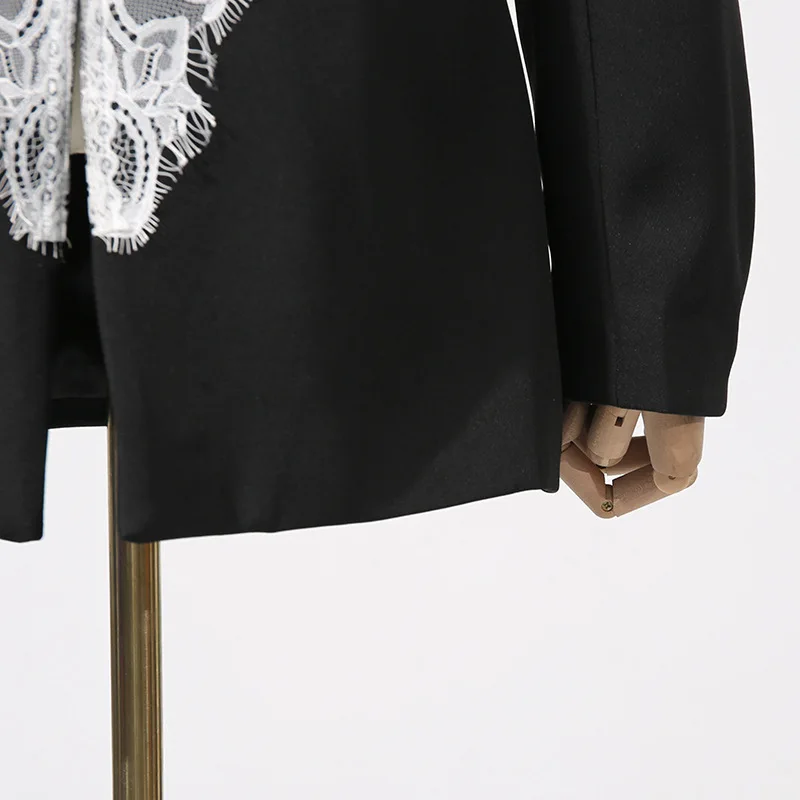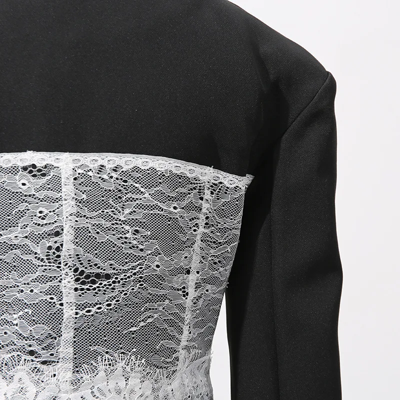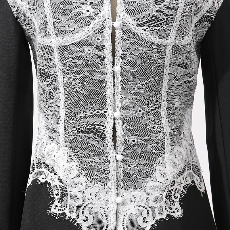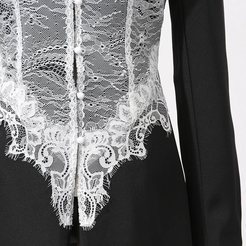 Featuring a slim-fit design with lightly padded shoulders, this blazer contours the waist while the sheer lace paneling adds a romantic touch. Perfect for pairing with high-waisted trousers, skirts, or sleek heels, it transitions effortlessly from evening elegance to high-fashion streetwear.