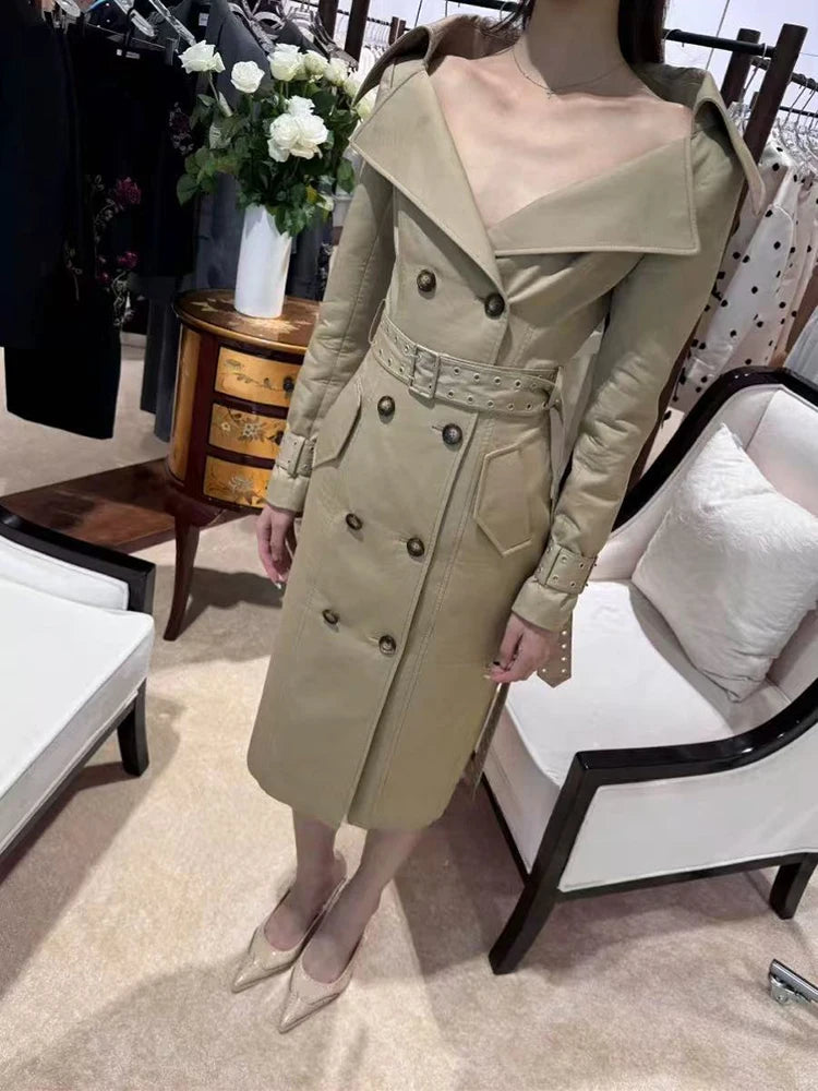 The double-breasted front, structured lapels, and rivet-detailed belt accentuate the waist while adding a touch of edgy sophistication. Perfect for layering over chic daywear or elevating evening looks, this coat transitions effortlessly from streetwear cool to luxe sophistication.