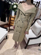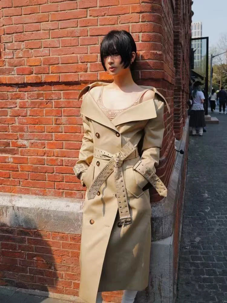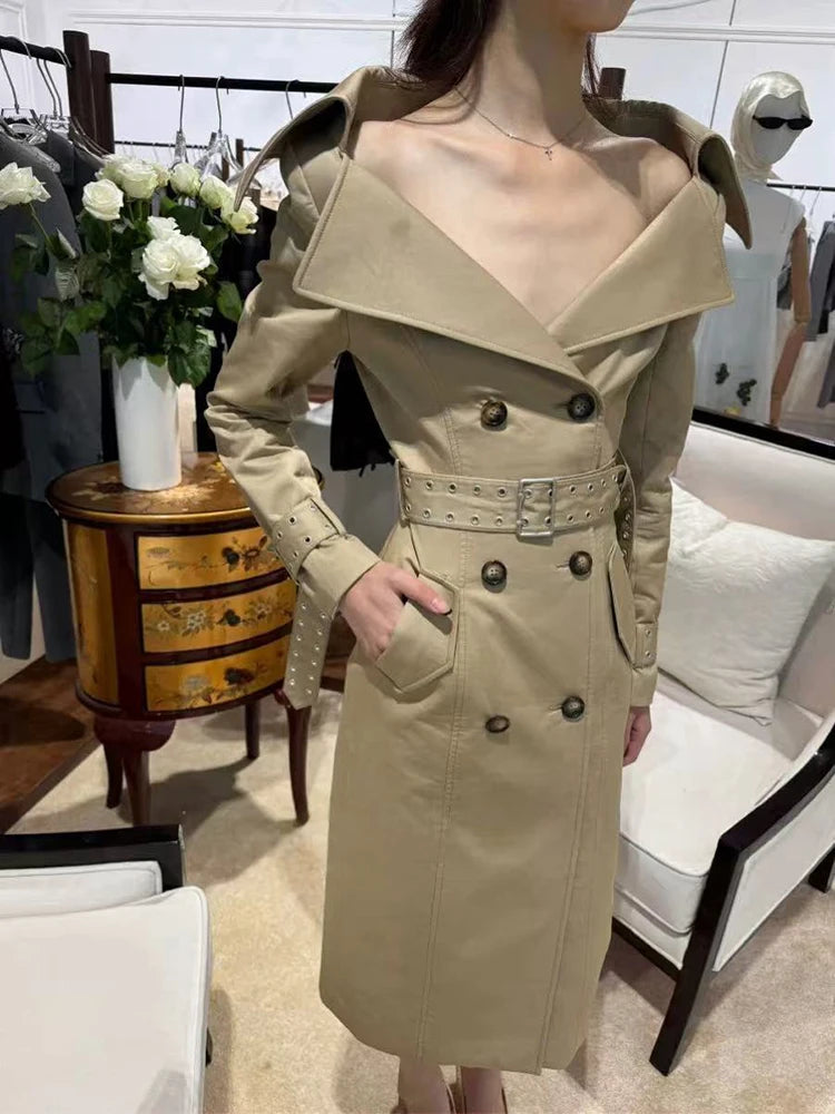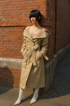 Modern Off-Shoulder Design – A daring twist on the classic trench.