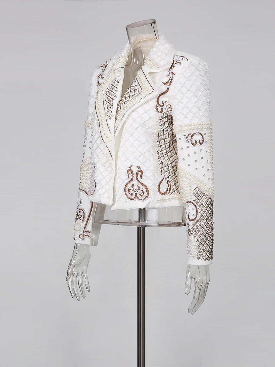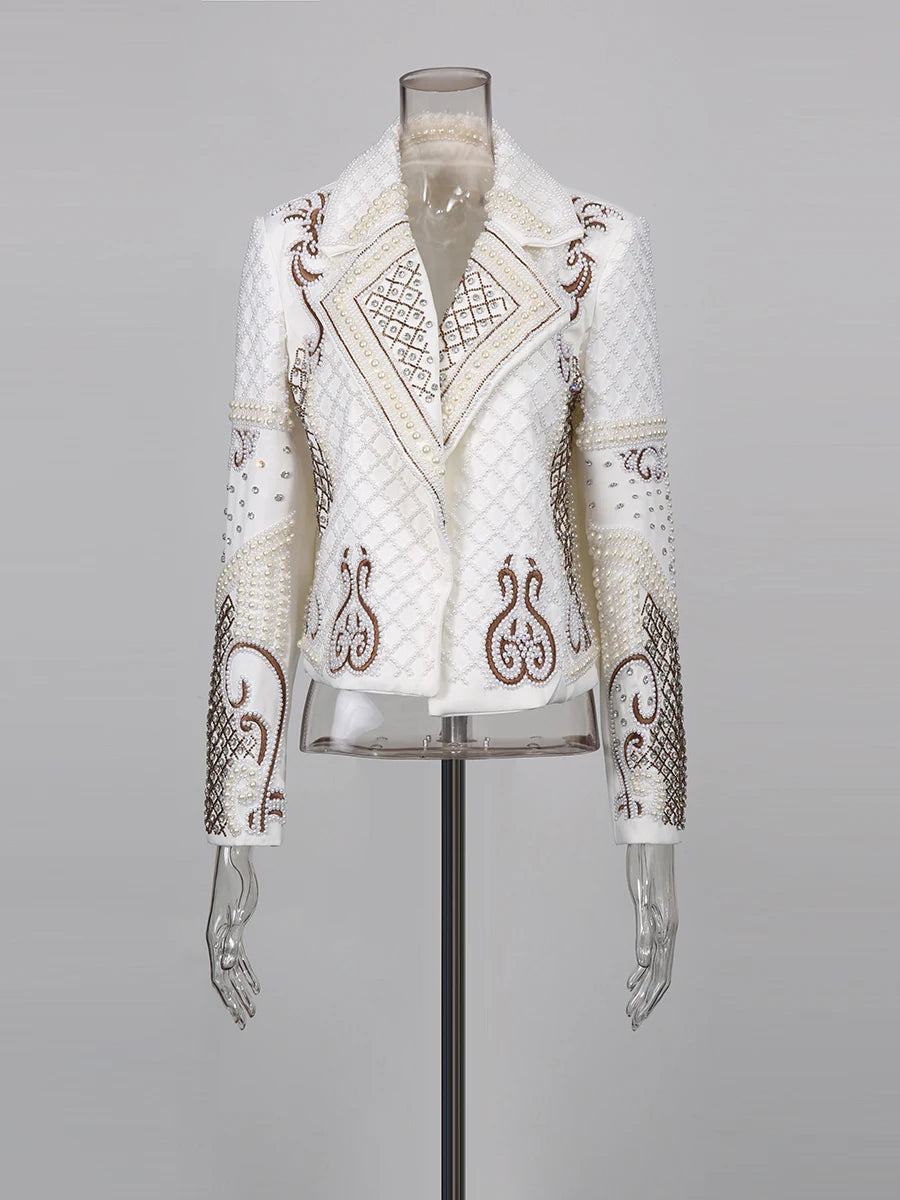 Radiate sophistication and artistry with the Trend4us Luxe Pearl-Embellished Embroidered Blazer — a stunning masterpiece that captures opulent detailing and modern couture flair. This blazer features an intricate hand-applied pearl grid design complemented by ornate bronze embroidery, creating a rich textural contrast that stands out in any setting. The tailored silhouette flatters the figure with structured shoulders and a refined waistline, while the luxurious quilted fabric base ensures both comfort and durability. Perfect for evening galas, red carpet events, or elevated street-style moments, this statement piece embodies the essence of glamour and craftsmanship.