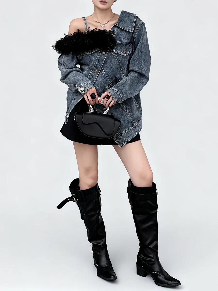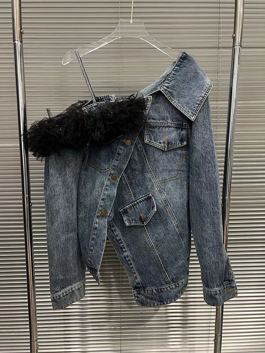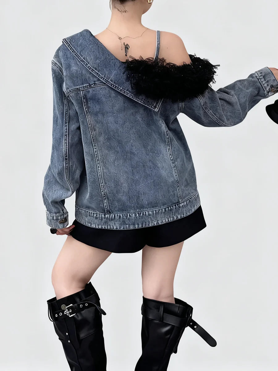 The Trend4us Modern Asymmetric Denim Jacket combines edgy streetwear style with a refined modern silhouette. Crafted from premium washed denim, this jacket showcases an asymmetric off-shoulder neckline that exudes confidence and individuality.