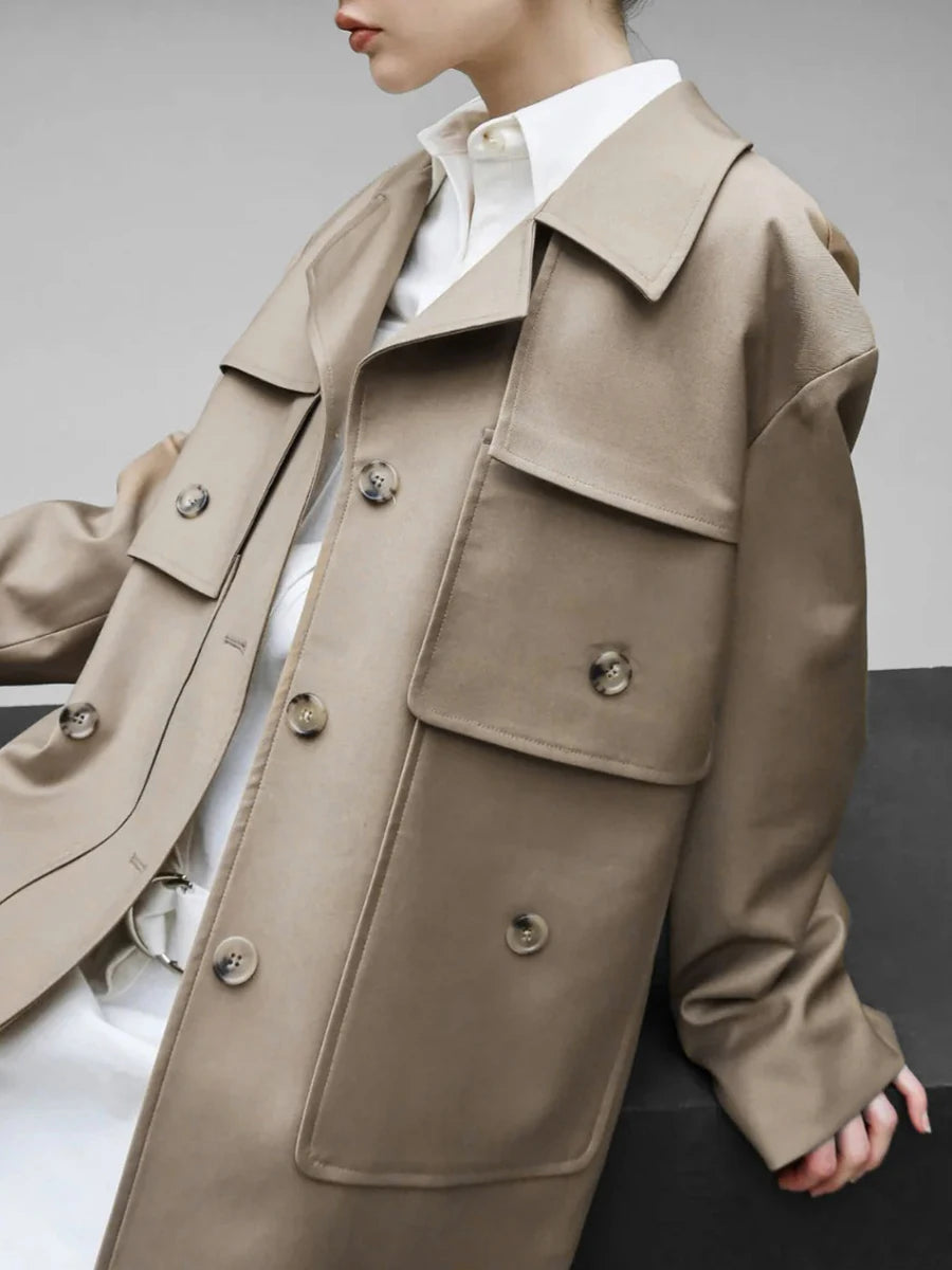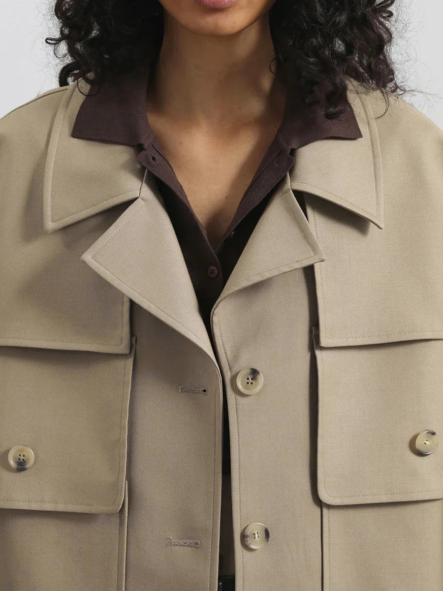 Featuring statement flap utility pockets at the chest and waist, a classic spread collar, and button-front closure, it channels utilitarian appeal with a polished edge. The neutral tone makes it a timeless wardrobe staple that pairs effortlessly with dresses, skirts, or denim for all-season versatility.