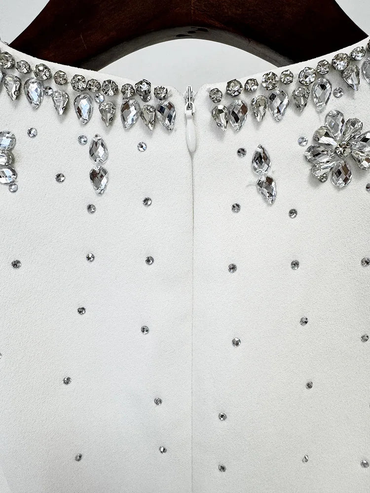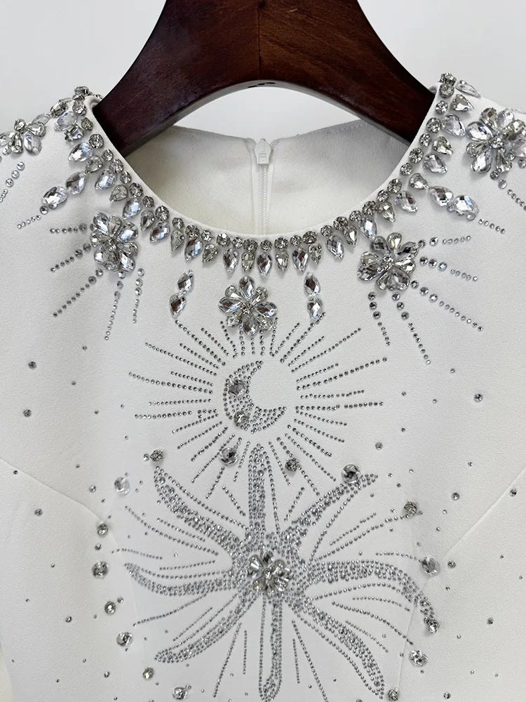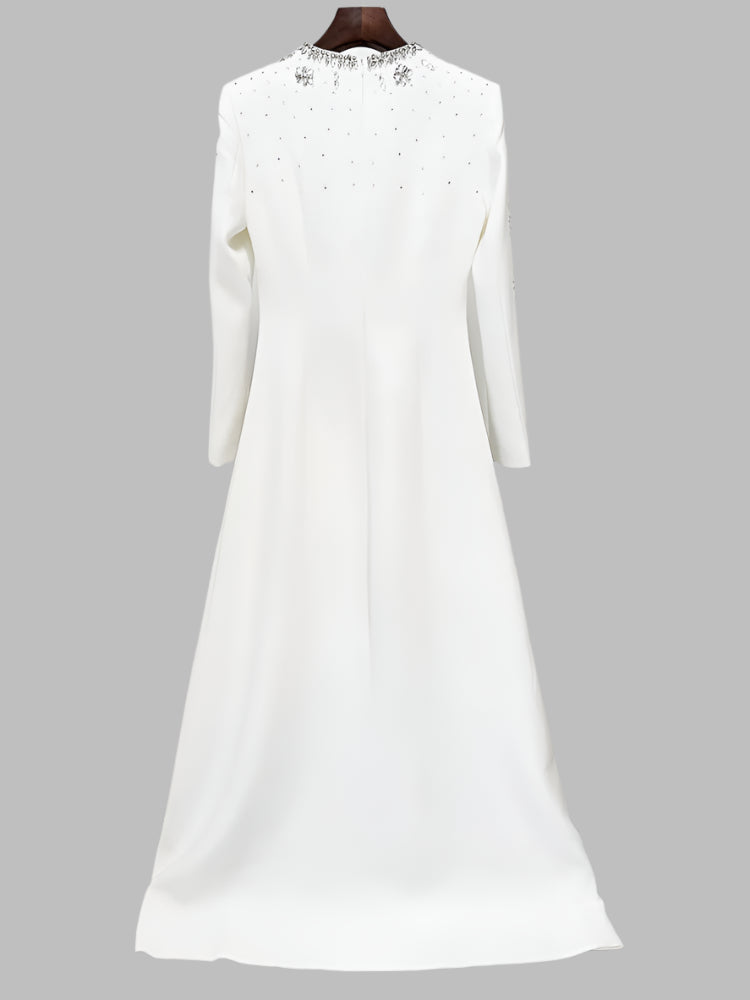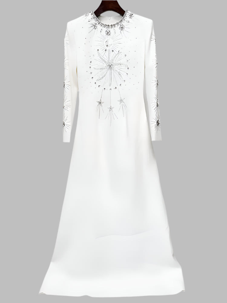 Elevate your evening look with the Trend4us Celestial Crystal Embellished Gown. Designed with a statuesque silhouette, this long sleeve gown features intricate crystal embellishments forming celestial motifs including stars, rays, and a crescent moon. The structured shoulders and crew neckline add a regal touch, making it the perfect statement piece for galas, weddings, or red carpet events.