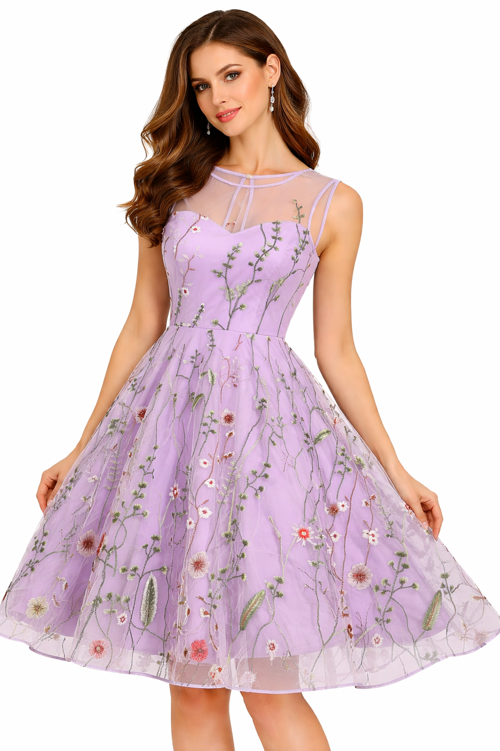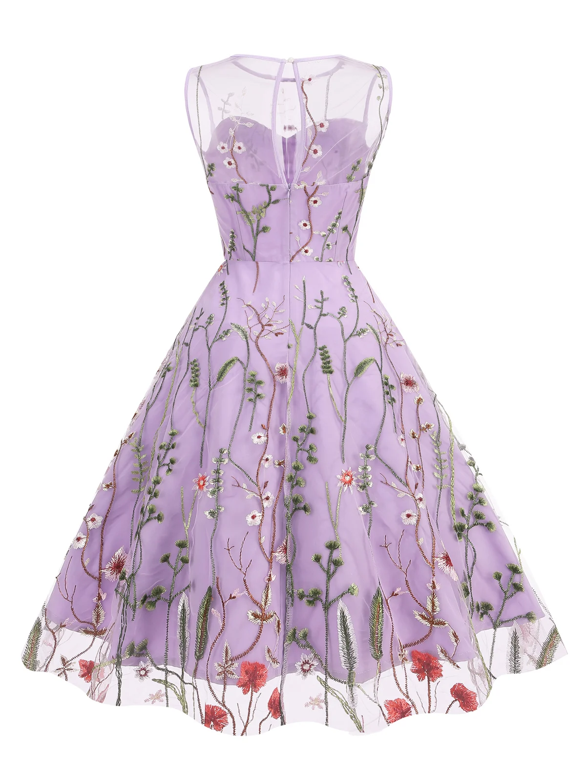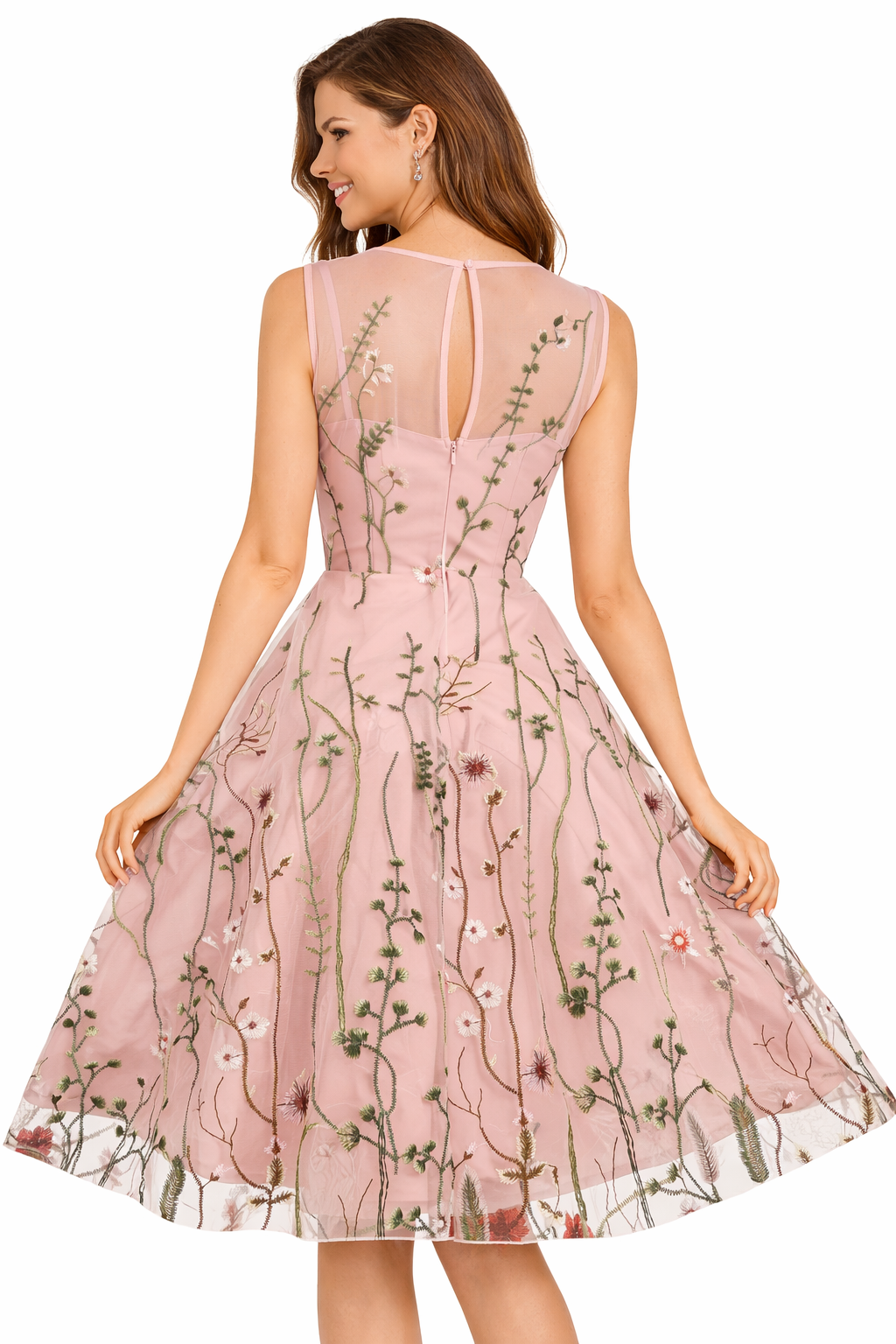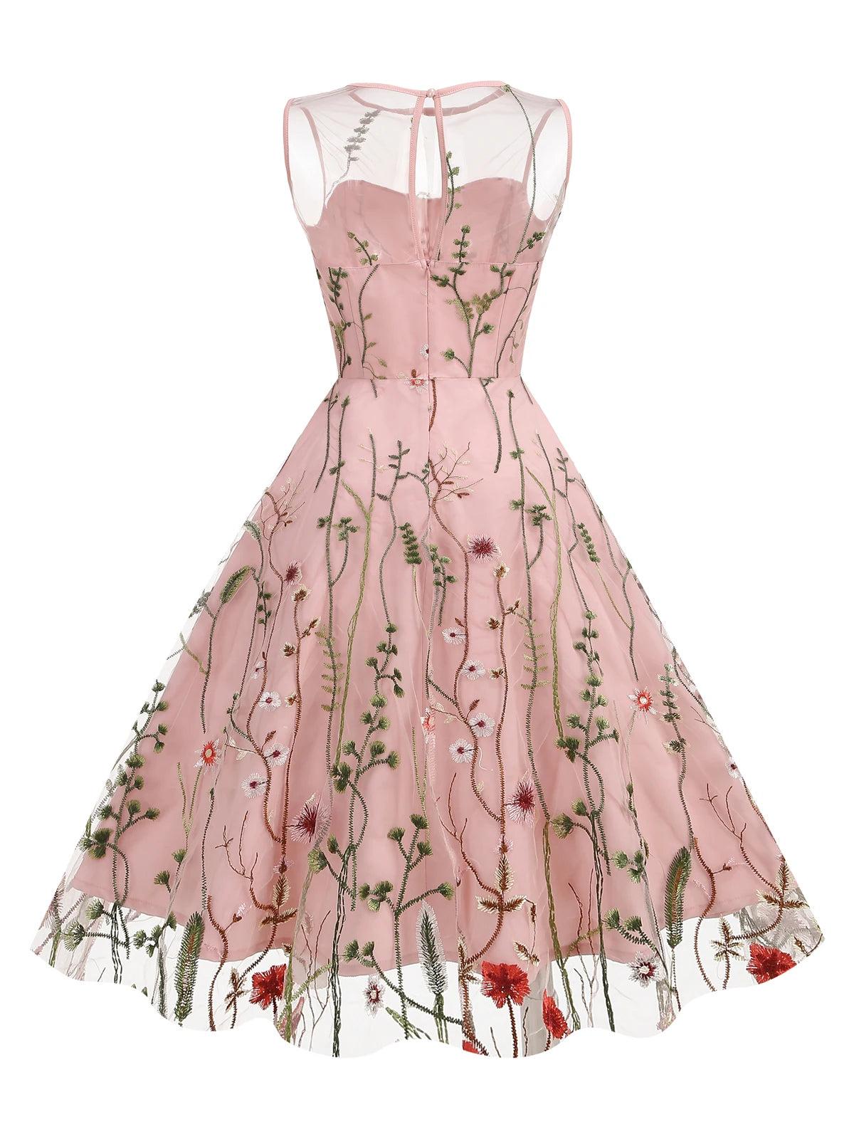 Step into something truly special with the Embroidered Sheer Mesh Floral Fit & Flare Midi Dress. Delicate floral embroidery blooms across a sheer mesh overlay, creating a look that is breathtakingly romantic and effortlessly elegant. The keyhole detail adds a subtle, sophisticated edge, while the A-line silhouette and empire waistline deliver a universally flattering fit. Sleeveless and midi-length, this dress is made for moments that matter.