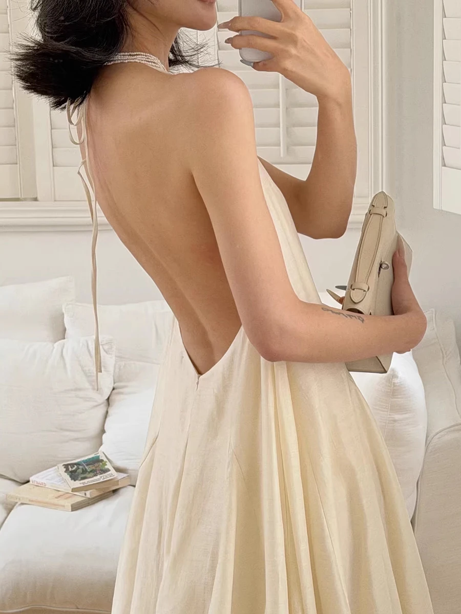 Effortlessly sensual and beautifully minimal — this backless halter draped maxi dress is a statement piece designed for the woman who commands attention without trying. The halter neckline and open back create a striking, editorial silhouette, while the A-line cut and empire waistline drape gracefully over the body in a flattering, flowing finish. Crafted in a lightweight synthetic fiber polyester with a slight stretch, it moves with you and keeps you comfortable all evening long. Available in Apricot — a warm, luminous tone that glows against every skin tone.