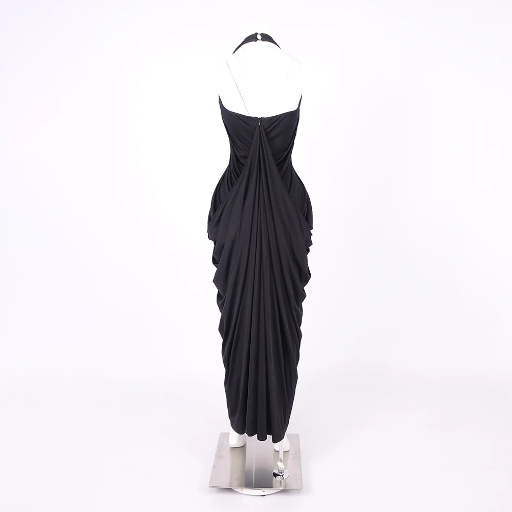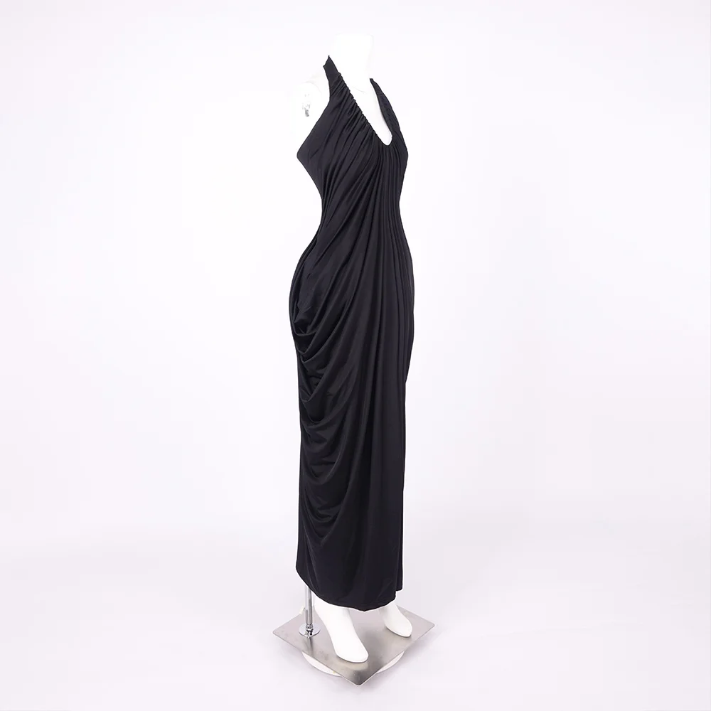 Bare, bold, and breathtakingly elegant — this elegant draped halter backless maxi dress is a floor-length statement piece that turns every entrance into a moment. The bodycon silhouette sculpts the figure with a sleek, second-skin confidence, while the halter neckline and dramatic backless design create an open, sensual aesthetic that is both refined and unforgettable. Delicate pleating adds a soft, draped dimension to the fabric that moves with effortless grace from the natural waistline to the floor-length hem, creating a flowing, goddess-like quality that elevates the entire look. Crafted in a cashmere-blend polyester with a quick-dry finish for all-day comfort and a polished, luxurious feel. Available in White and Black — two timeless, high-impact shades for every formal occasion. Sizes XS–L.