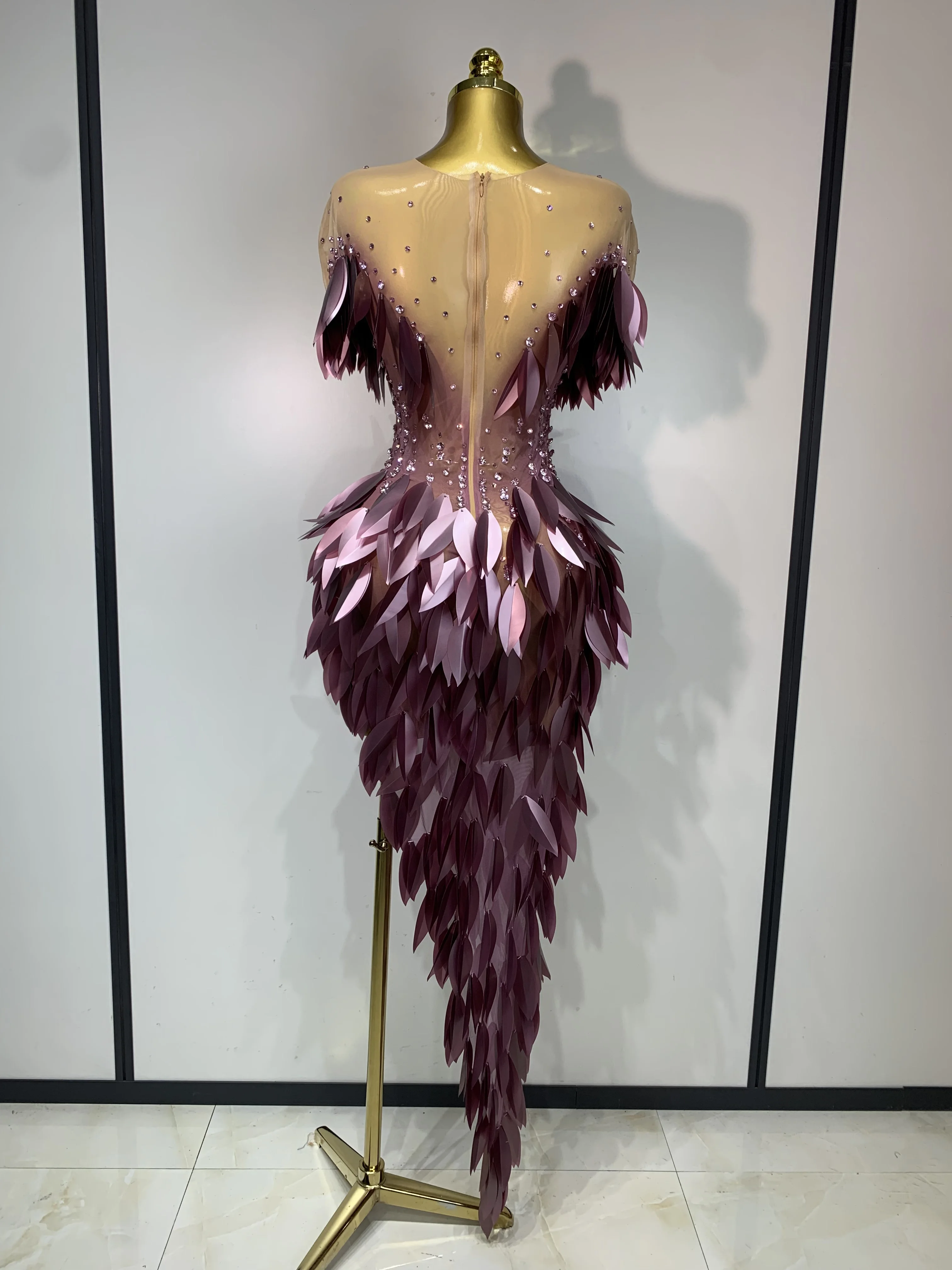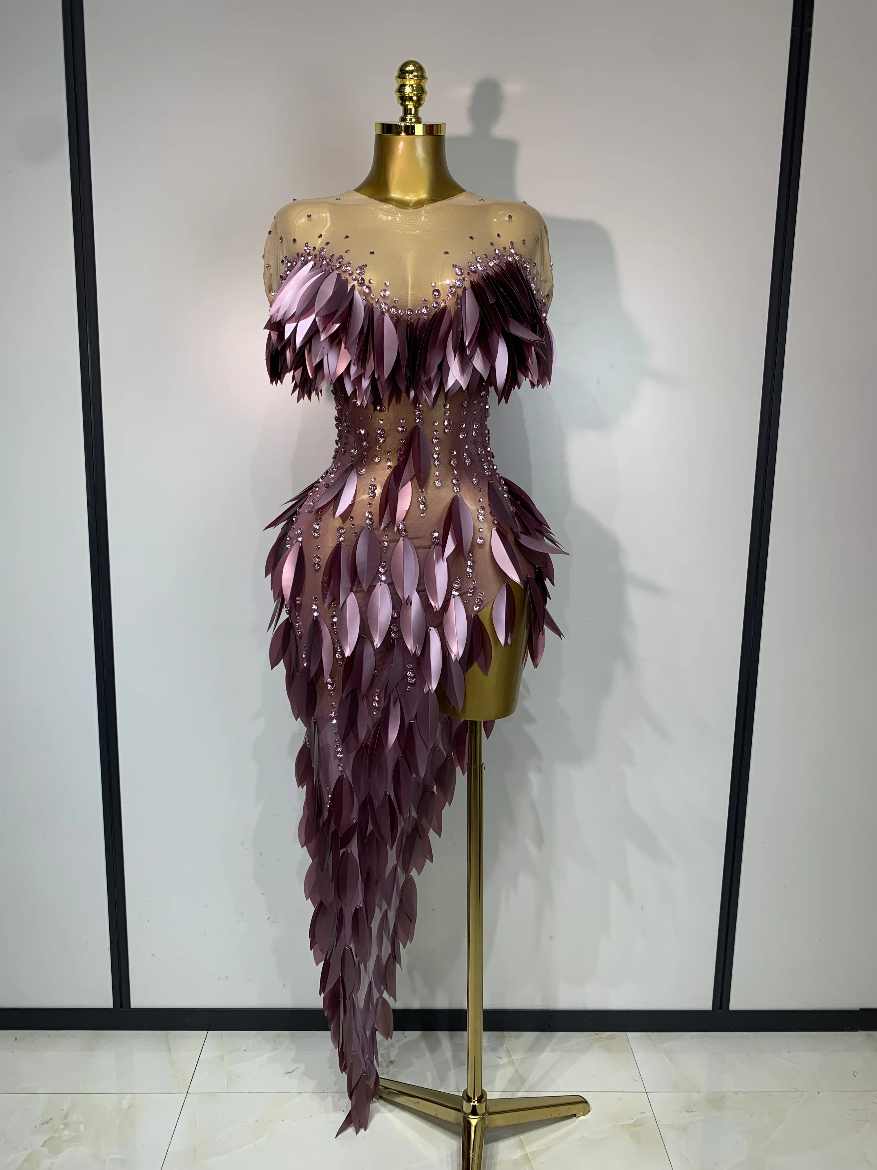 Trend4us Luxe 3D Feather Appliqué Crystal Asymmetrical Evening Dress