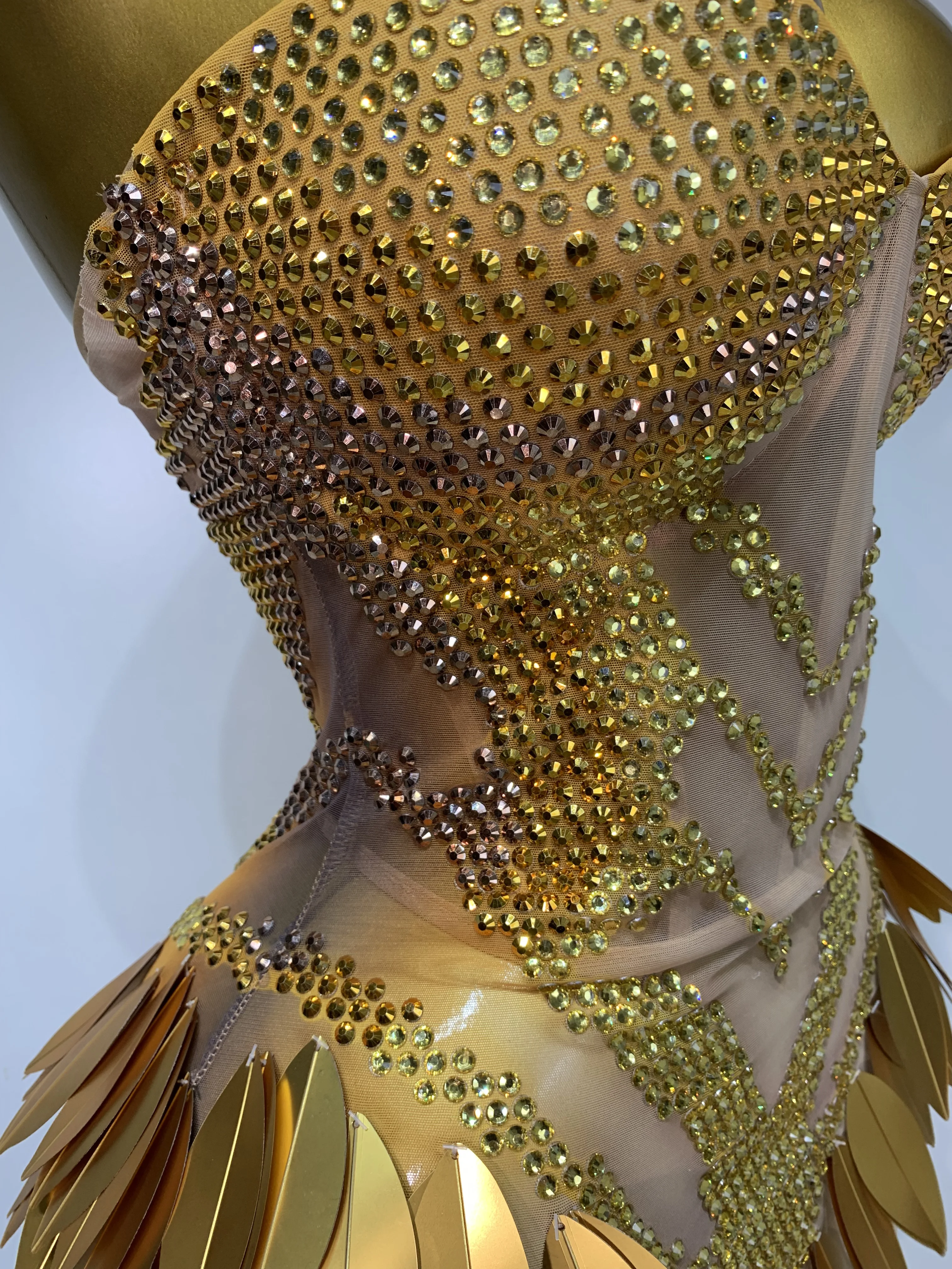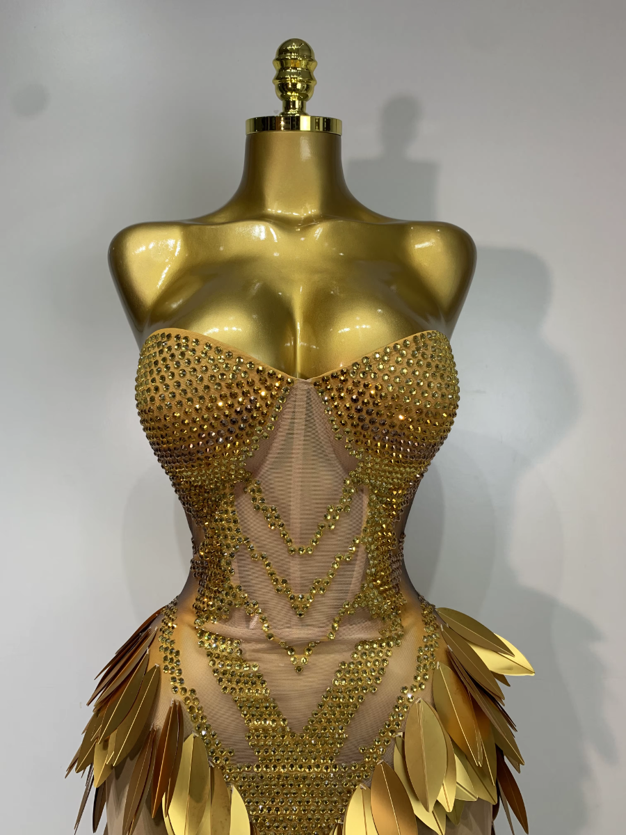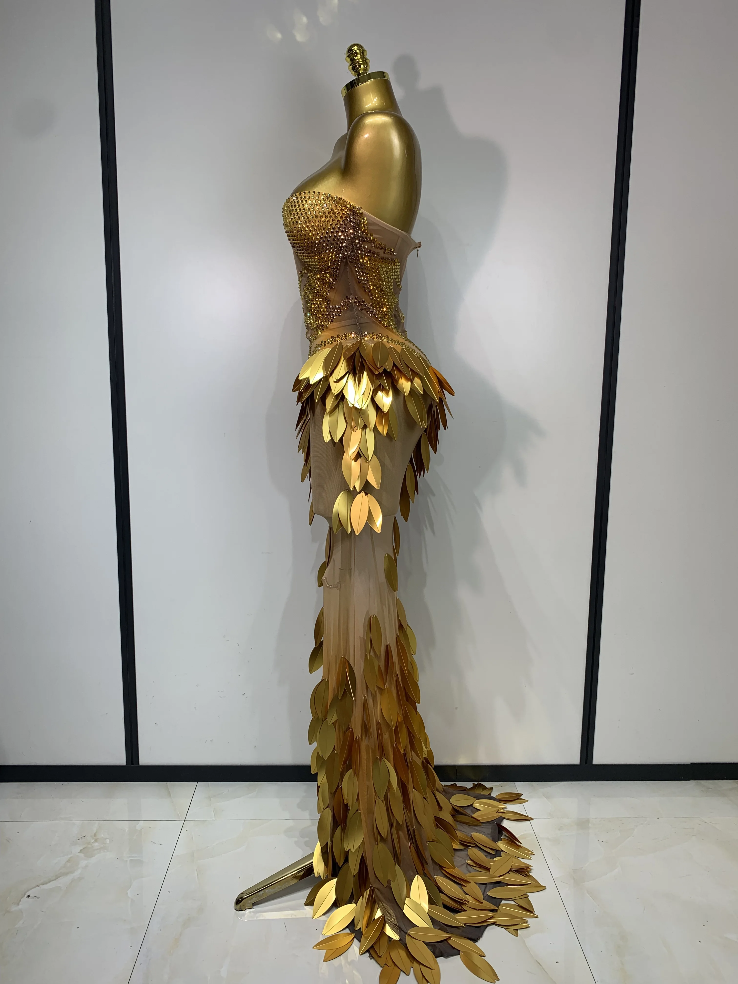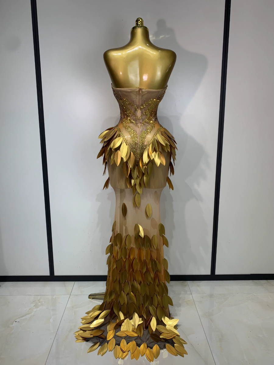 Pure, unapologetic glamour — this luxe gold rhinestone sequin strapless mesh maxi dress is a handcrafted showpiece that redefines red-carpet dressing with a breathtaking, cinematic brilliance. Thousands of rhinestones and sequins are meticulously applied across the sheer mesh fabric in a rich, three-dimensional arrangement that shimmers and catches the light with an extraordinary, jewel-like intensity from every angle. The strapless silhouette frames the shoulders with a bold, confident openness that feels both daring and timelessly elegant, while the slim sheath silhouette sculpts the body with a figure-flattering precision that flows to a sweeping floor-length hem with a dramatic, editorial grace. A high-stretch fabric ensures a comfortable, second-skin fit that moves beautifully through every occasion, and a zipper closure delivers a seamless, polished finish. Crafted in a luxurious lanon polyester mesh for a lightweight, breathable drape that carries the weight of the embellishments with effortless ease. Available in Gold — a rich, luminous shade that amplifies the rhinestone and sequin brilliance to a truly unforgettable effect. Sizes S–XL.