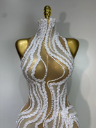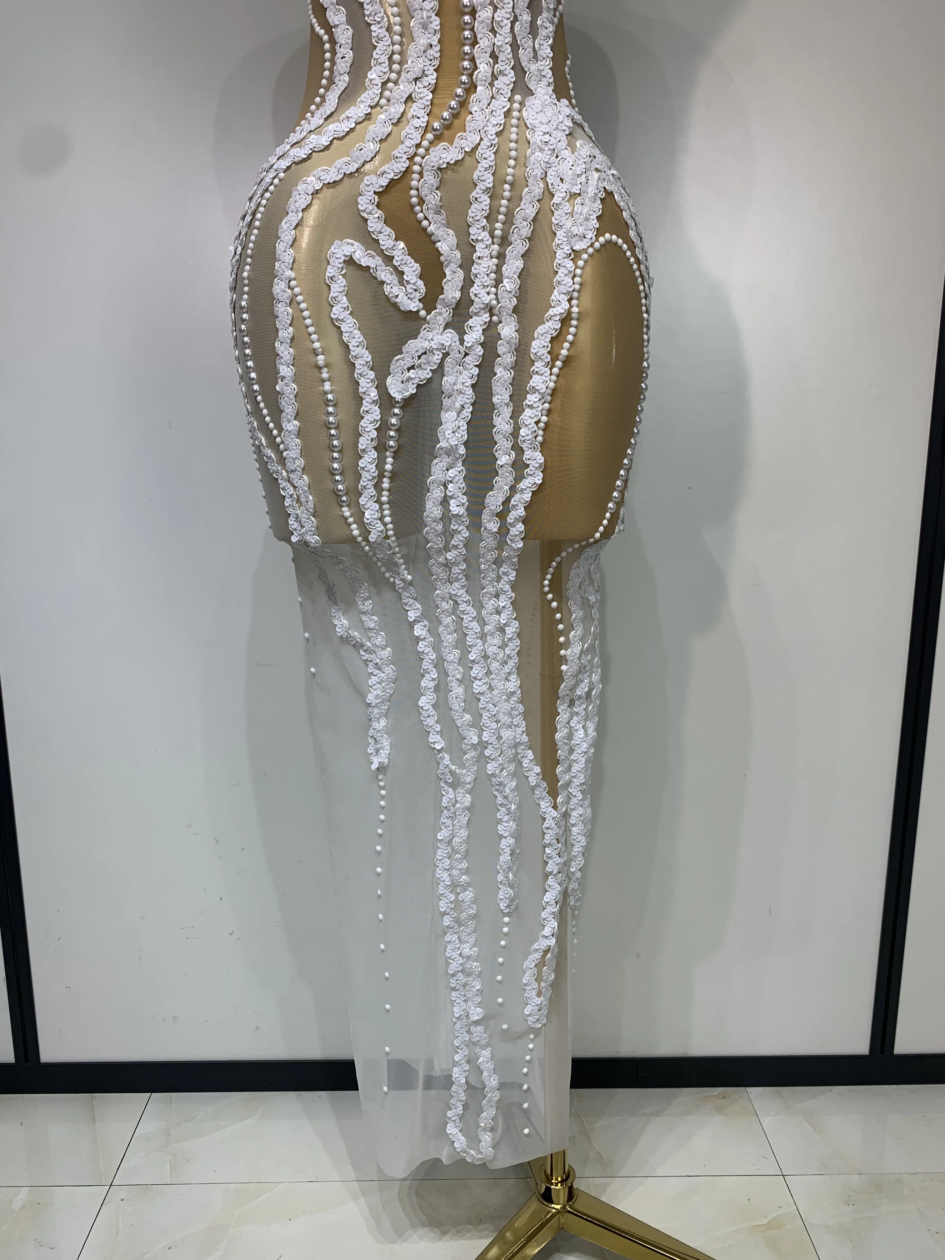 A dress that doesn’t just enter a room — it commands it. This luxe pearl sequin sheer mesh high-neck maxi dress is a handcrafted masterpiece that brings a breathtaking, red-carpet glamour to the classic maxi silhouette. Thousands of hand-applied pearl beads and sequins shimmer across the sheer mesh fabric with a luminous, multi-dimensional brilliance that catches every light source with a dazzling, jewel-like intensity that is impossible to ignore. The turtleneck silhouette adds a sleek, sophisticated elegance that frames the face with a clean, architectural precision, while the sleeveless design keeps the look modern and editorial. The slim sheath silhouette sculpts the body with a figure-flattering confidence that flows to an ankle-length hem with a sweeping, cinematic grace. A high-stretch fabric ensures a comfortable, second-skin fit that moves beautifully through every occasion, and a zipper closure delivers a seamless, polished finish. Crafted in a luxurious lanon polyester mesh for a lightweight, breathable drape that feels as beautiful as it looks. Available in White — a luminous, ethereal shade that makes the pearl and sequin embellishments truly dazzle. Sizes S–XL.