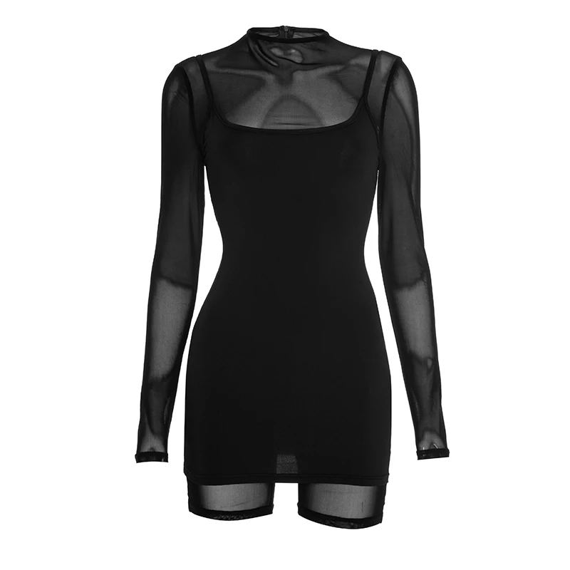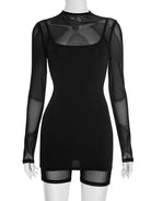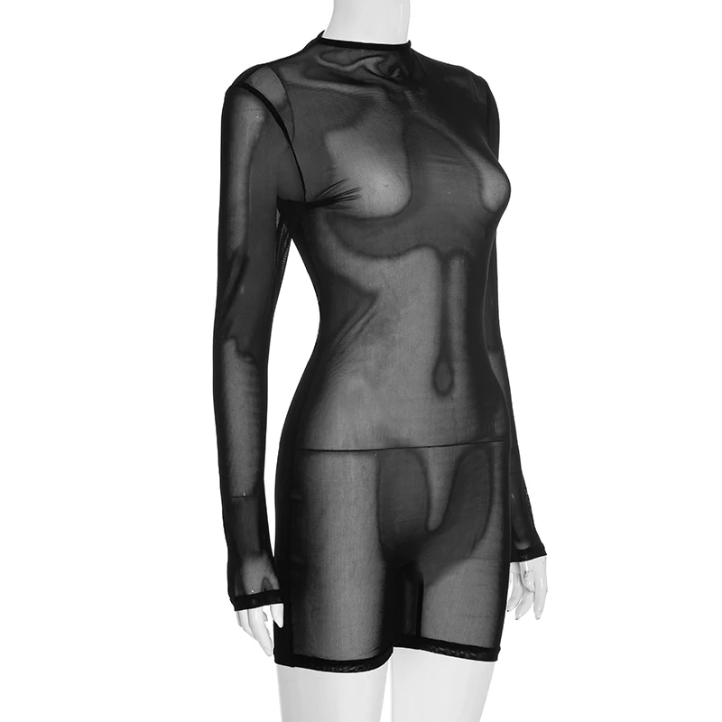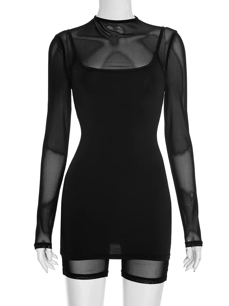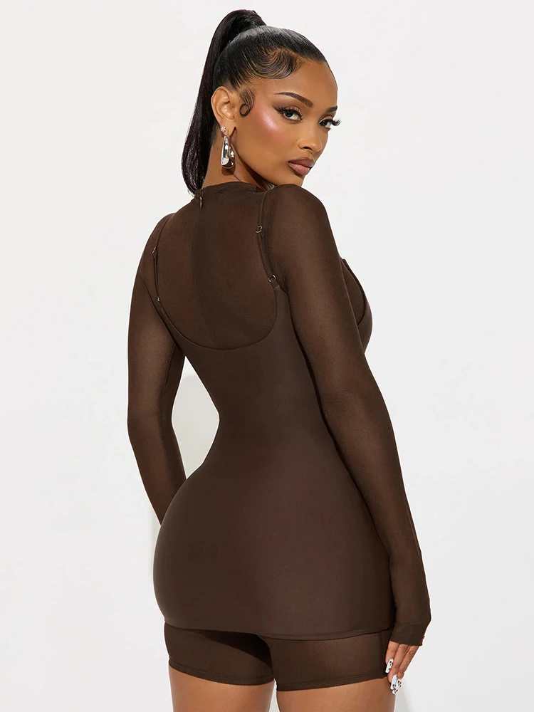 The sheer long sleeves and high mesh neckline add a sultry, fashion-forward contrast to the clean, body-contouring base. Designed to hug the waist, sculpt the hips, and elongate the legs, this layered romper dress moves effortlessly from night-out glamour to minimalist street styling.