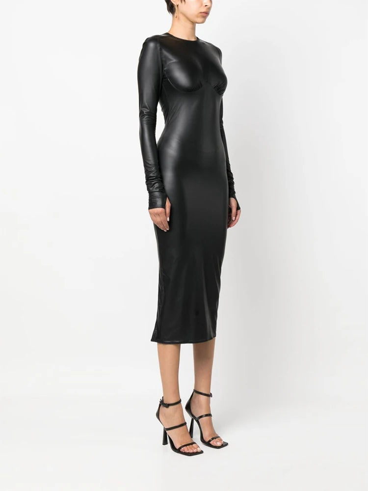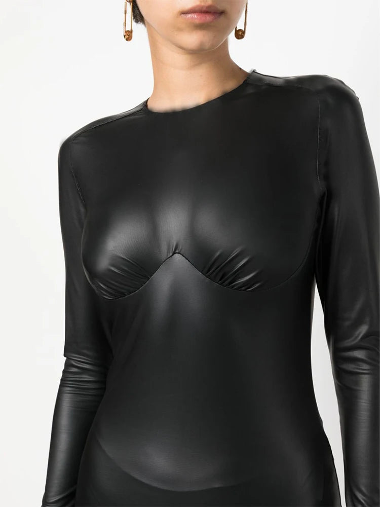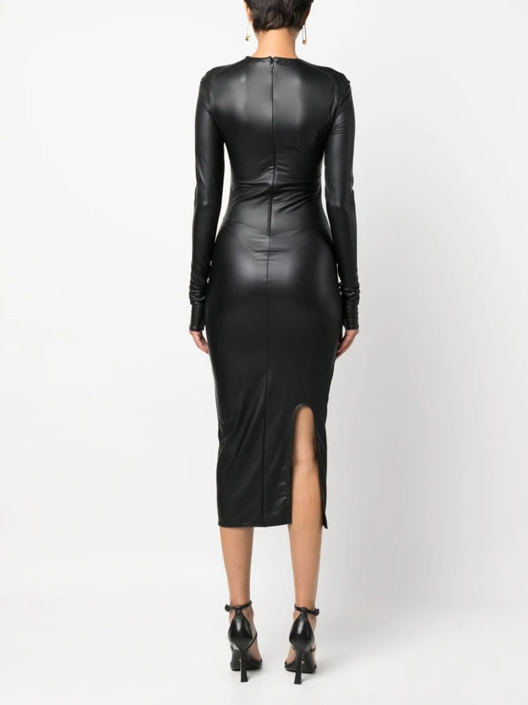 Trend4us Women's Chic Black Faux Leather Long Sleeve Midi Dress