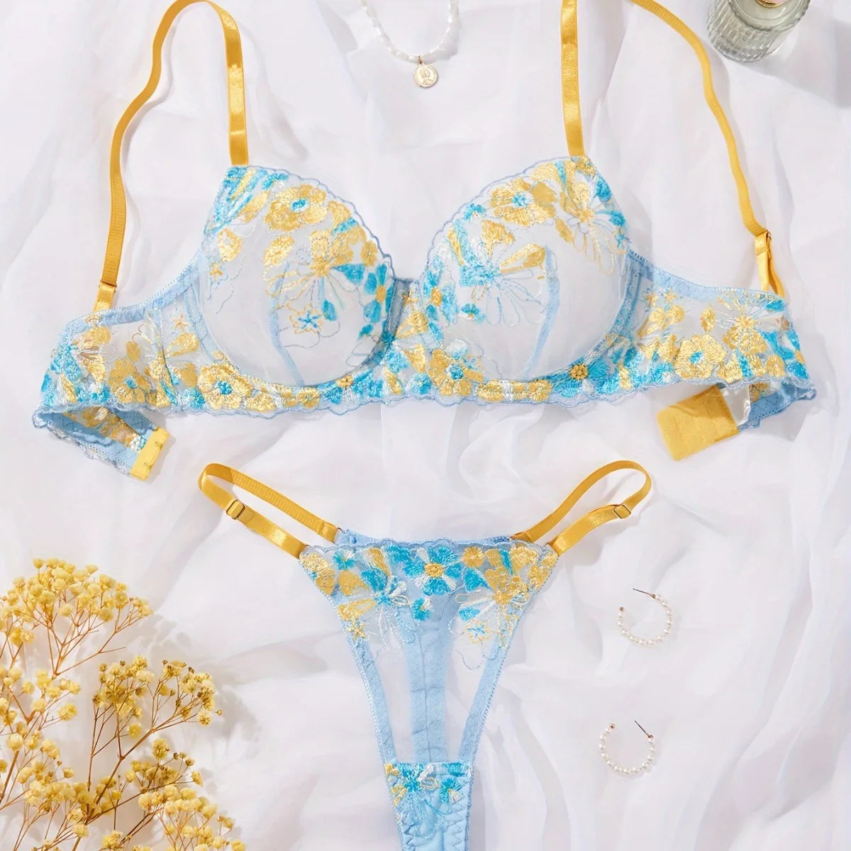 Elevate your intimate collection with the Trend4us Blue & Gold Floral Embroidered Lingerie Set, a captivating blend of sophistication and sensuality. This two-piece set features sheer mesh delicately embroidered with golden and turquoise floral motifs, enhanced by satin gold straps for a luxurious contrast. The underwire bra provides elegant lift and support, while the matching thong completes the effortlessly glamorous look — perfect for romantic evenings or refined everyday wear.