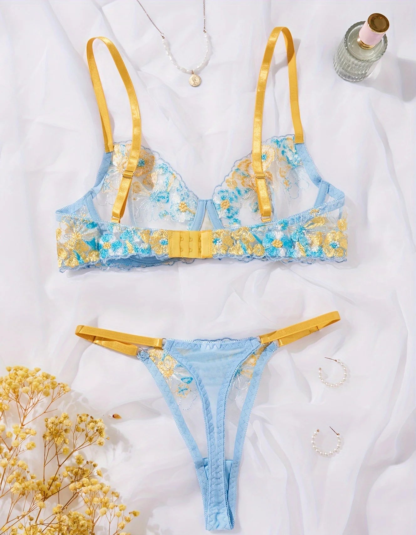 Design Features: Blue and gold floral embroidery, sheer panels, underwire support