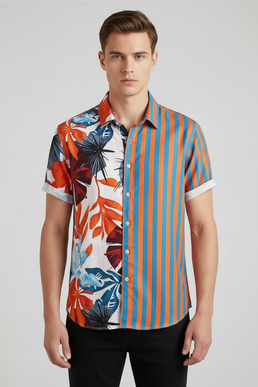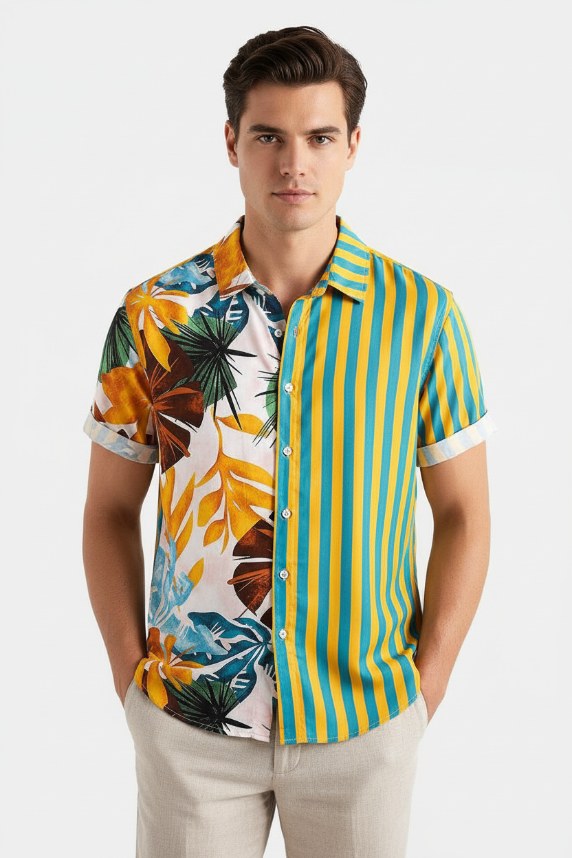 Make a statement this summer with the Trend4us Tropical Split Print Vacation Shirt. Featuring a bold fusion of vibrant floral and retro stripes, this button-up shirt brings island vibes and modern edge together. Lightweight and breathable, it's your go-to for beach getaways, poolside lounging, or warm-weather streetwear.