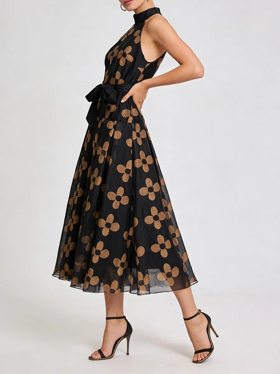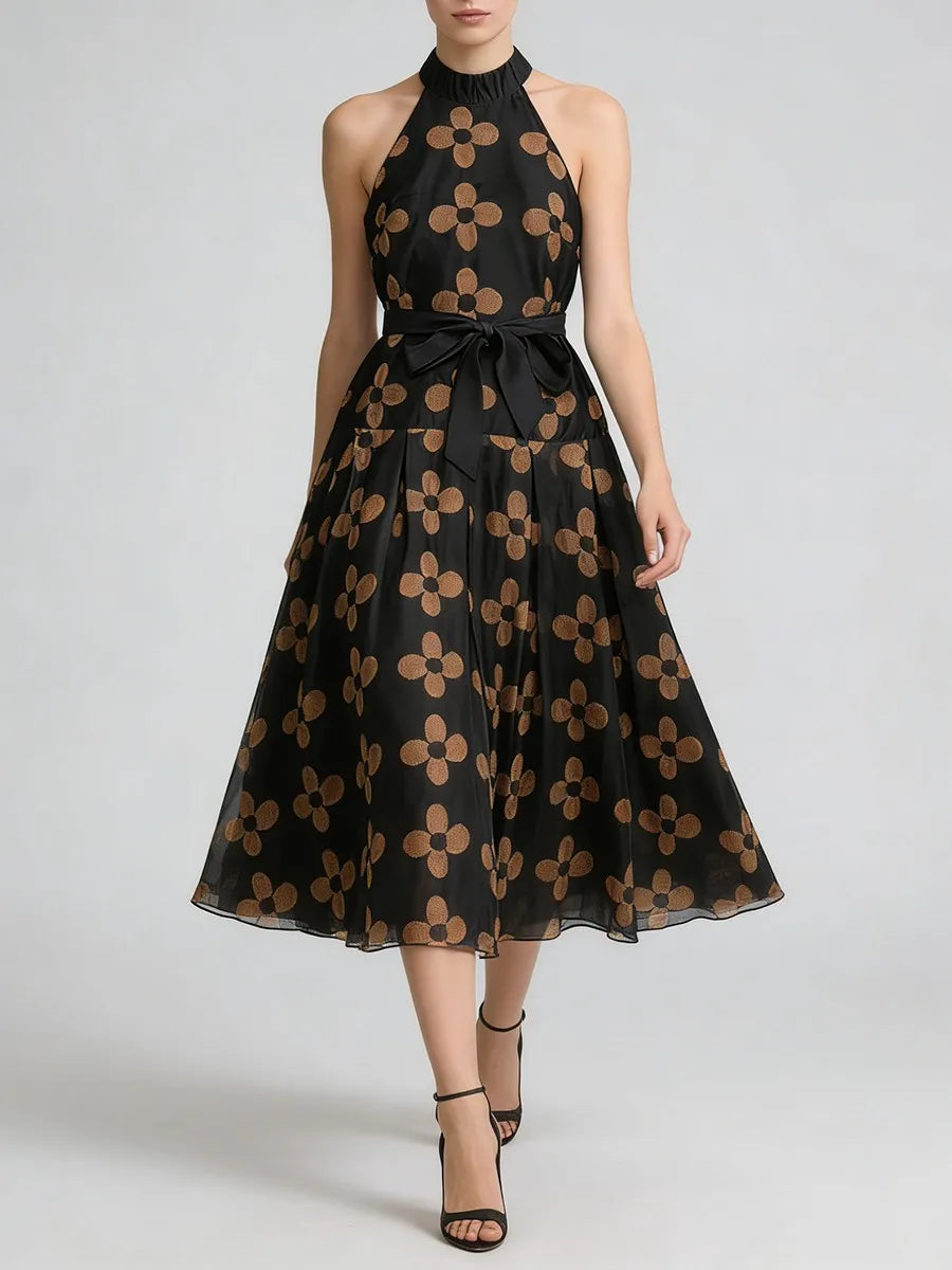 A refined halter-neck midi dress featuring floral detailing, a flattering tie-waist, and a flowing A-line silhouette designed for elegant occasions.