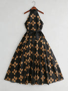 Trend4us Elegant Halter Neck Gold Floral Tie-Waist Midi Dress