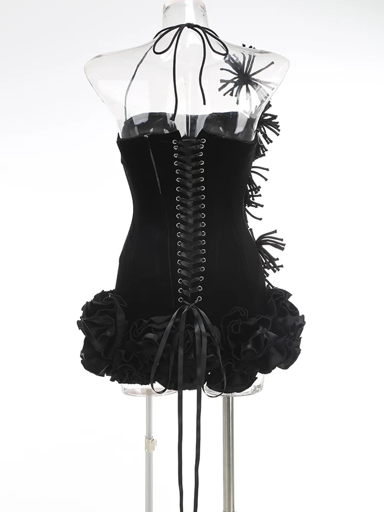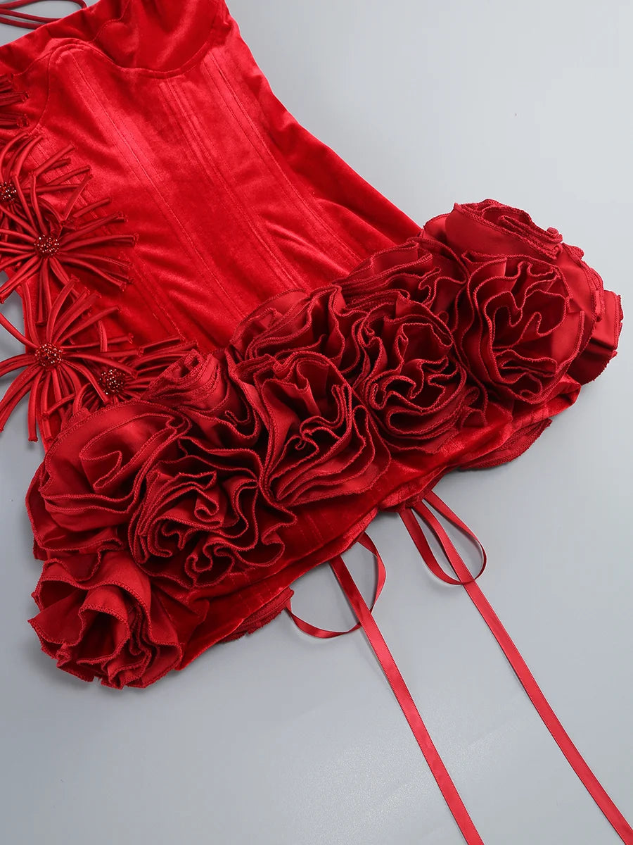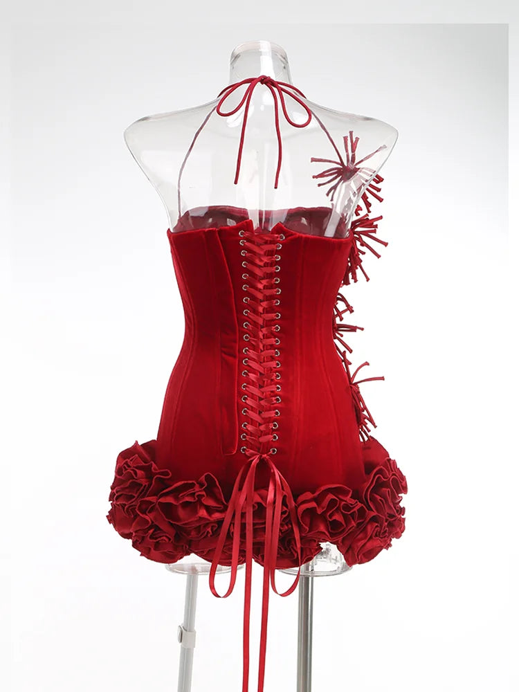 Design: Strapless corset with halter tie, 3D rosette hem, lace-up back