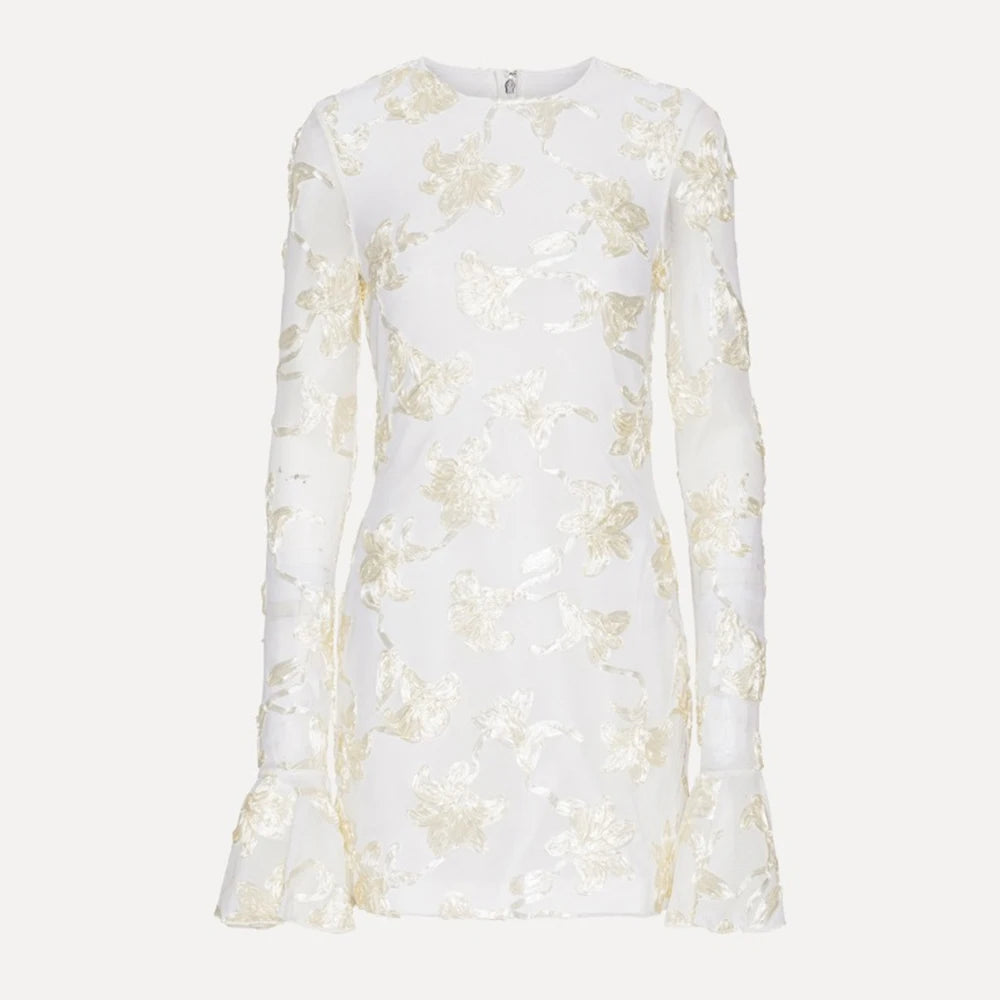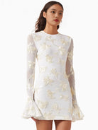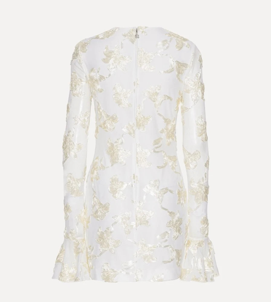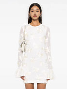 Embrace romantic elegance in this sheer mini dress featuring delicate floral embroidery and dramatic bell sleeves. The round neckline and empire waistline create a flattering silhouette, while the sheath design offers a sophisticated, feminine look.