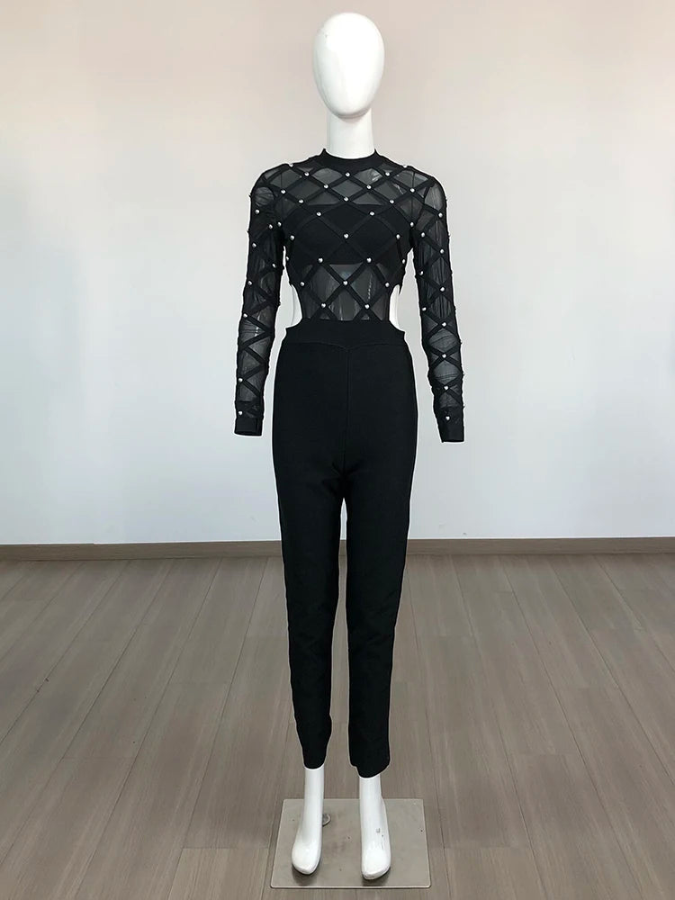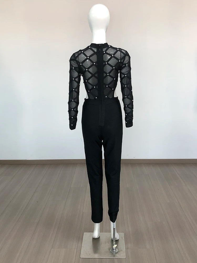 Trend4us Beaded Mesh Long-Sleeve Cutout Bandage Jumpsuit