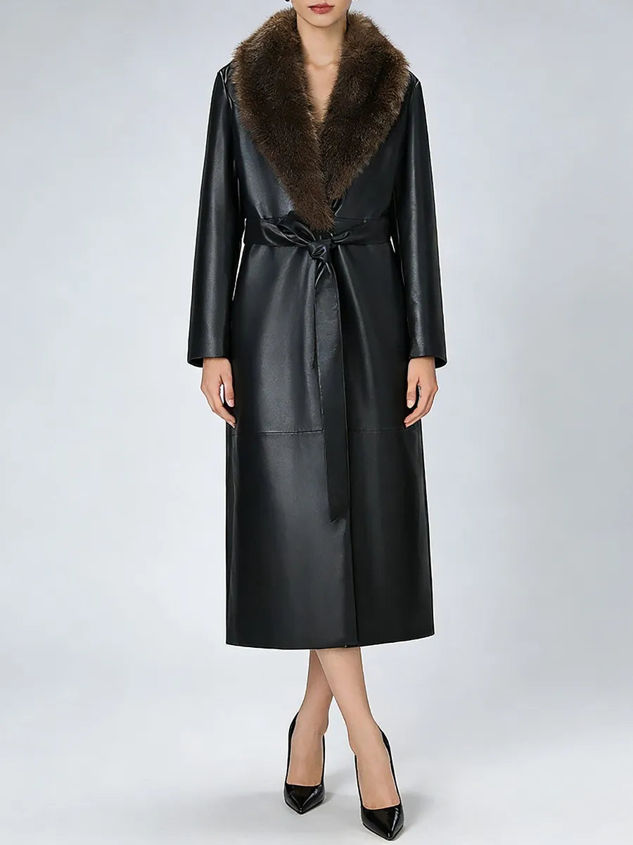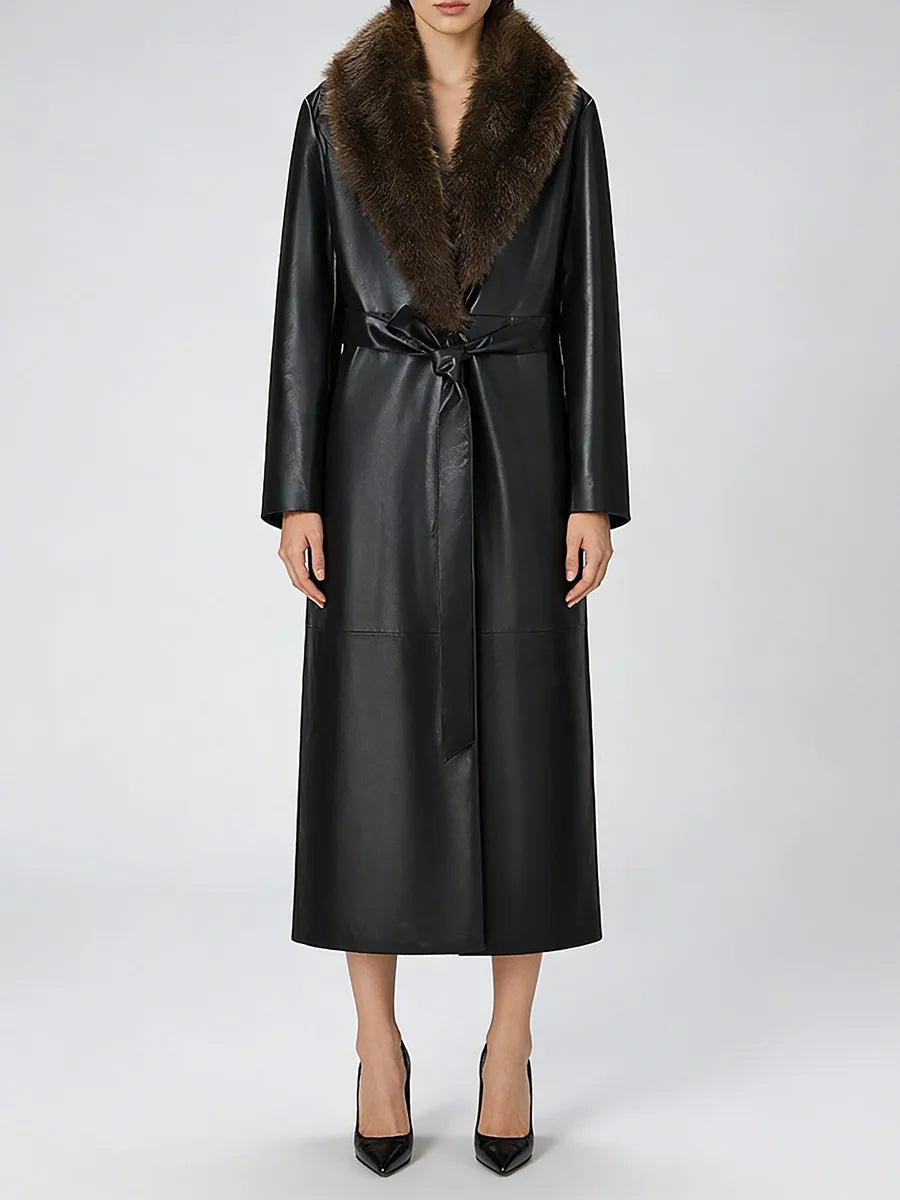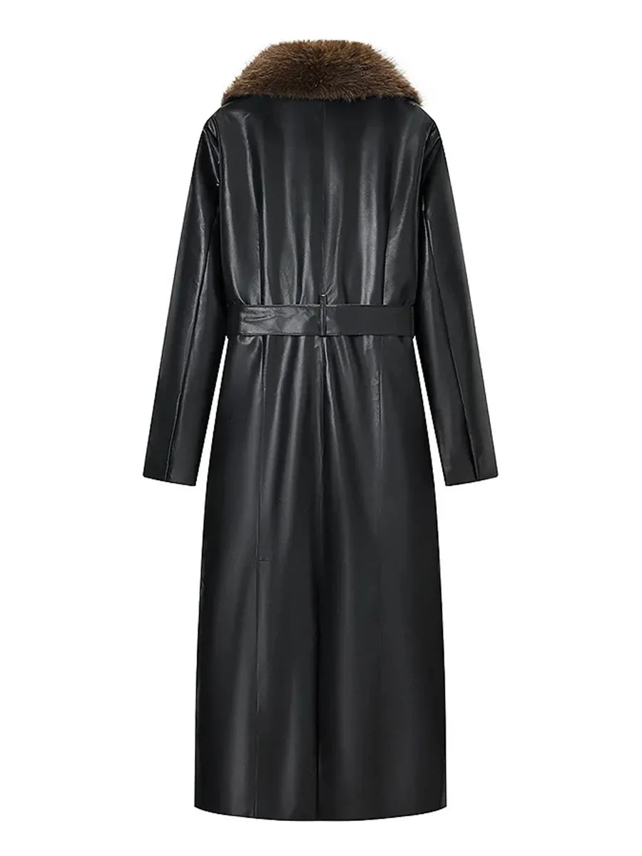 Trend4us Luxe Faux Fur Collar Belted Leather Trench Coat