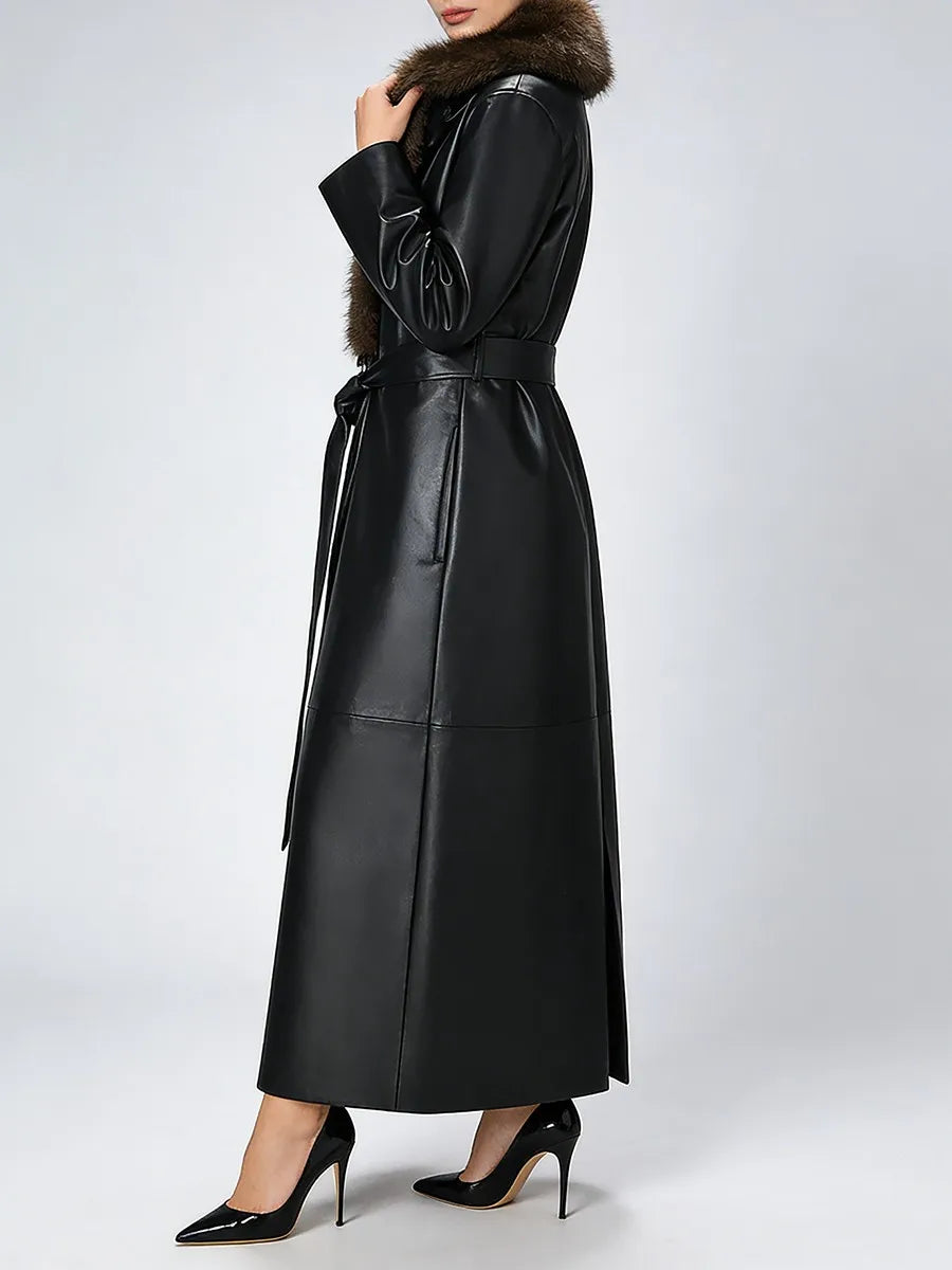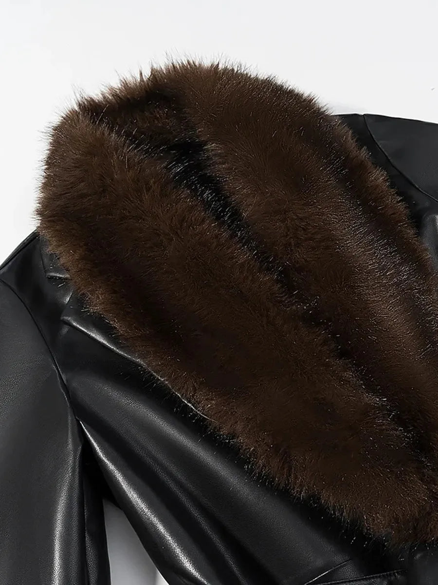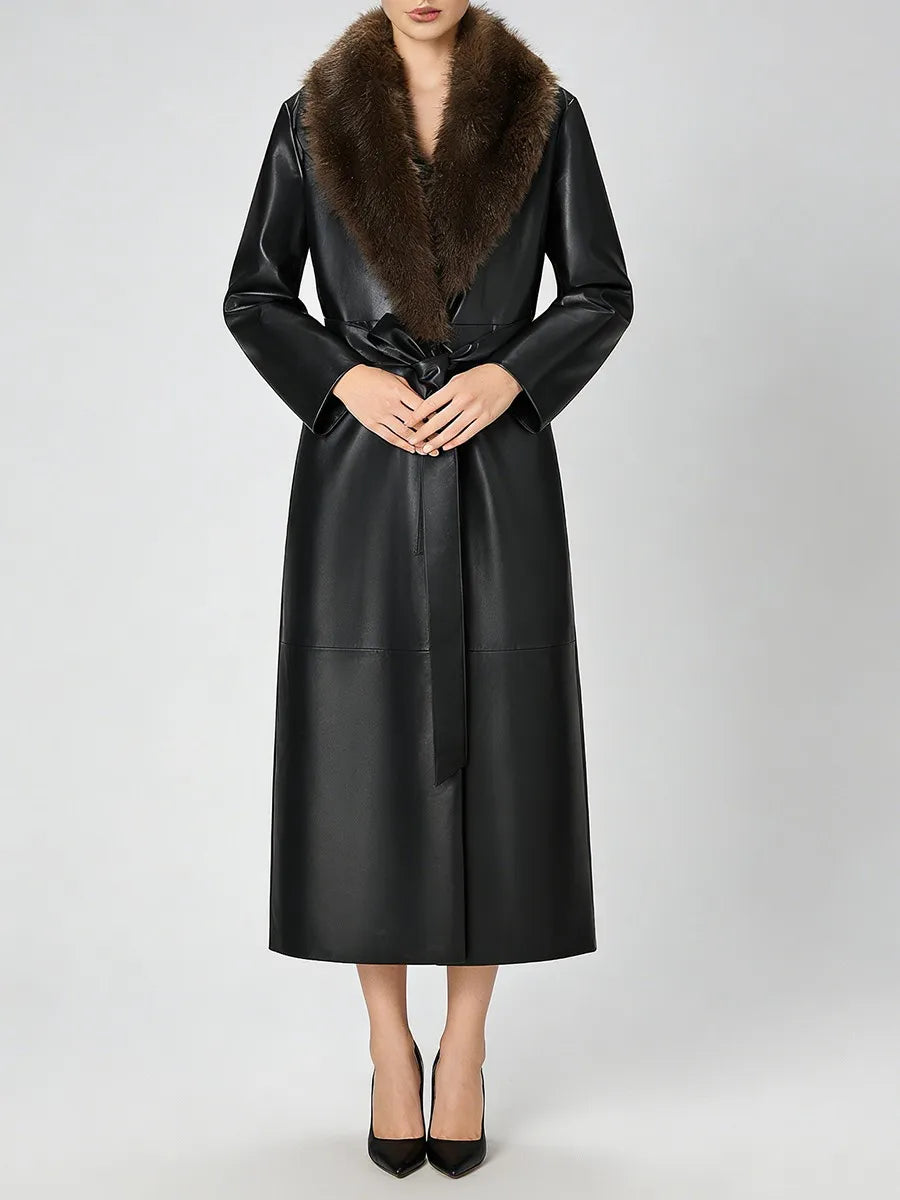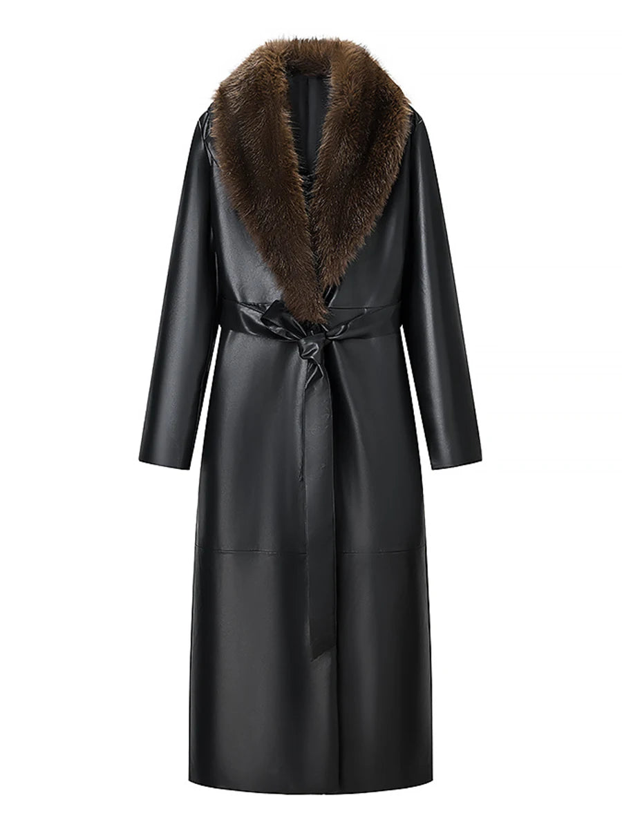 Trend4us Luxe Faux Fur Collar Belted Leather Trench Coat