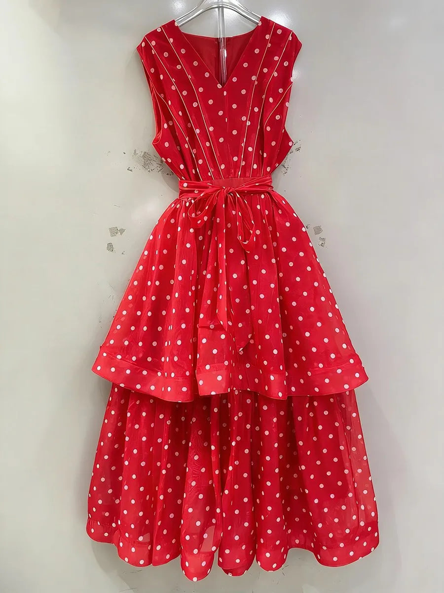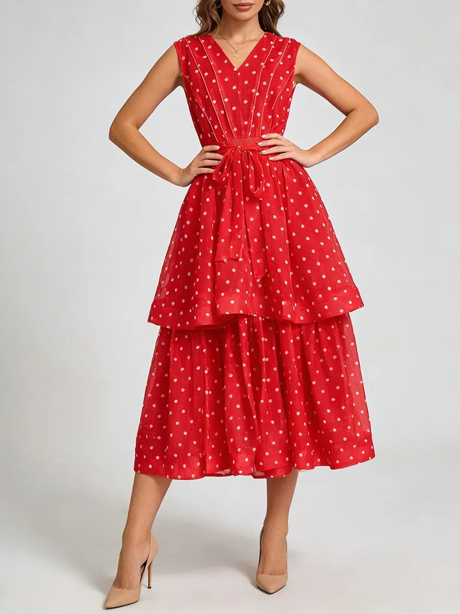Trend4us Elegant Polka Dot Tie-Waist Tiered Midi Dress