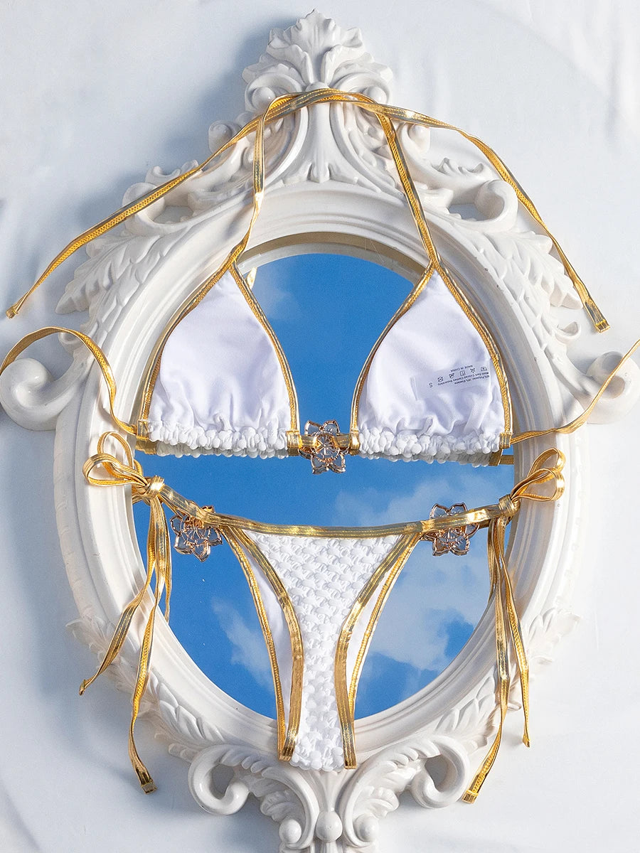Radiate luxury with the Trend4us Luxe Gold Trim Crochet Bikini Set. Designed with a textured white crochet-inspired fabric, this statement two-piece features shimmering gold trim, tie-up straps, and delicate floral hardware accents. Perfect for poolside glamour, beach photoshoots, or destination getaways — this set turns every sun-soaked moment into a runway.