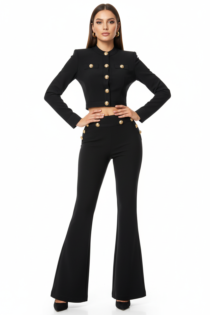 Elevate your wardrobe with the Trend4us Luxe Buttoned Blazer & Flared Pants Set — a sophisticated ensemble designed to make a powerful statement. Featuring a tailored cropped blazer with bold gold-tone embossed buttons and high-waisted flared pants, this set balances structure with elegance. The sculpted fit enhances the silhouette, while detailed button accents on the waist and pockets add a luxurious touch. Ideal for formal events, business occasions, or fashion-forward street style.