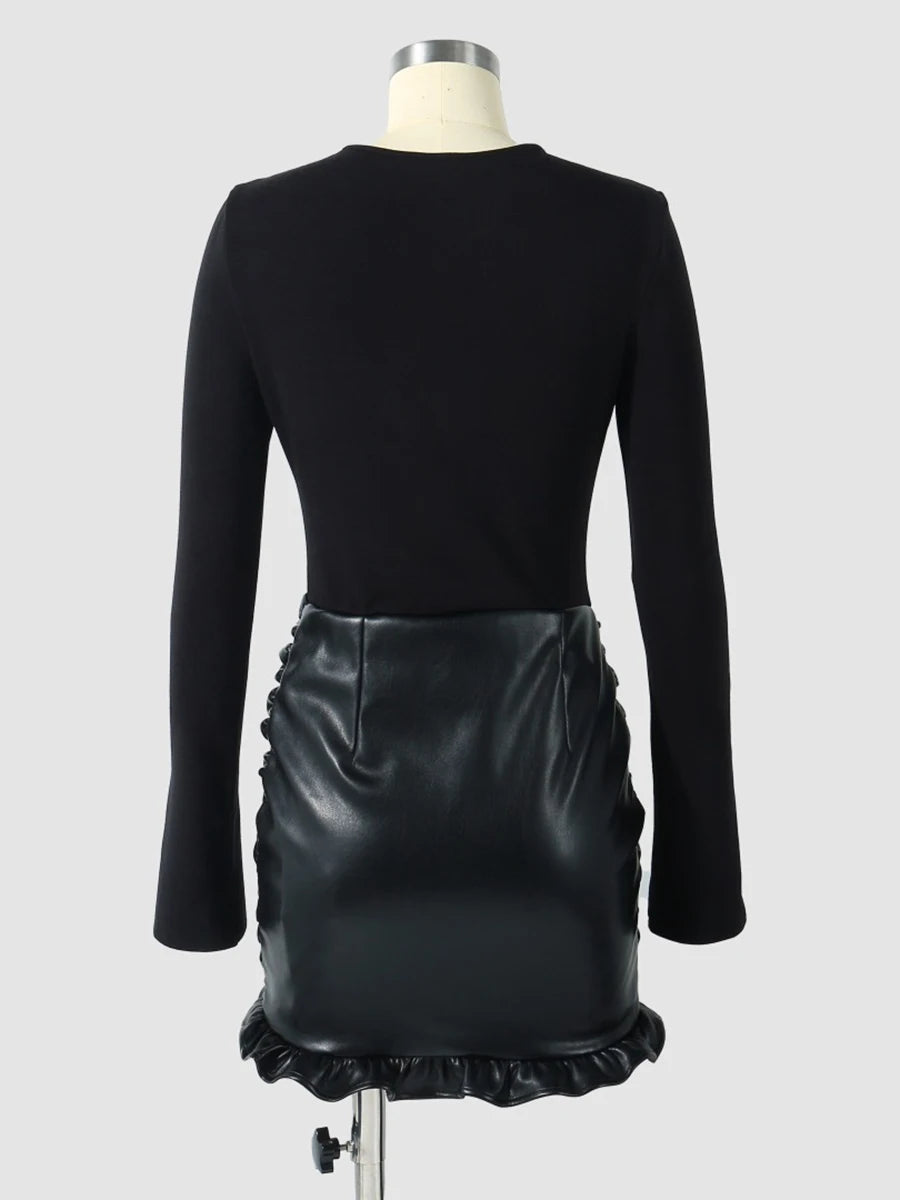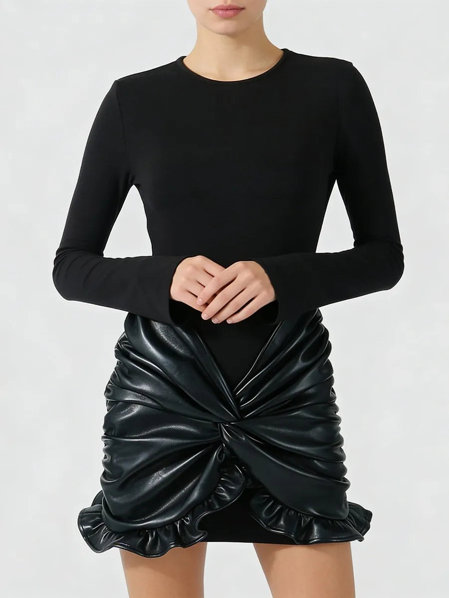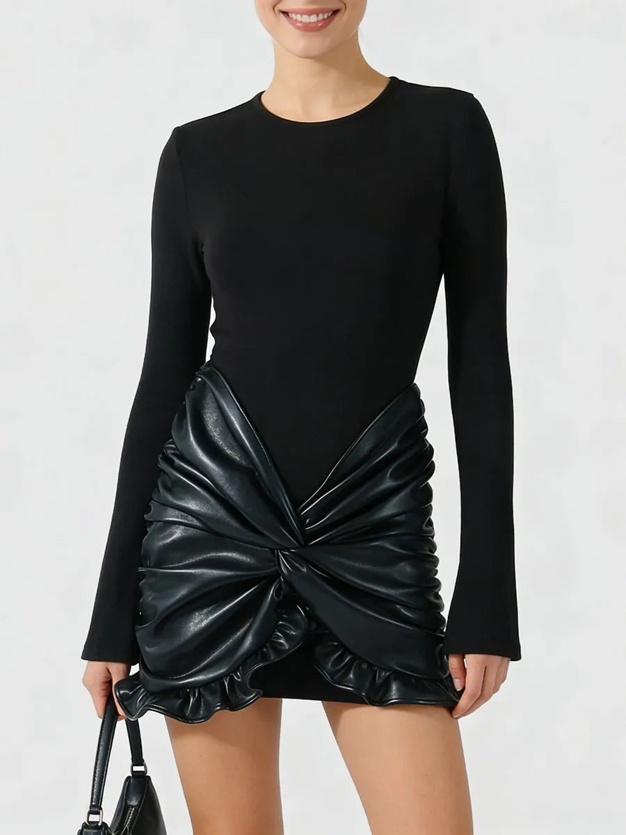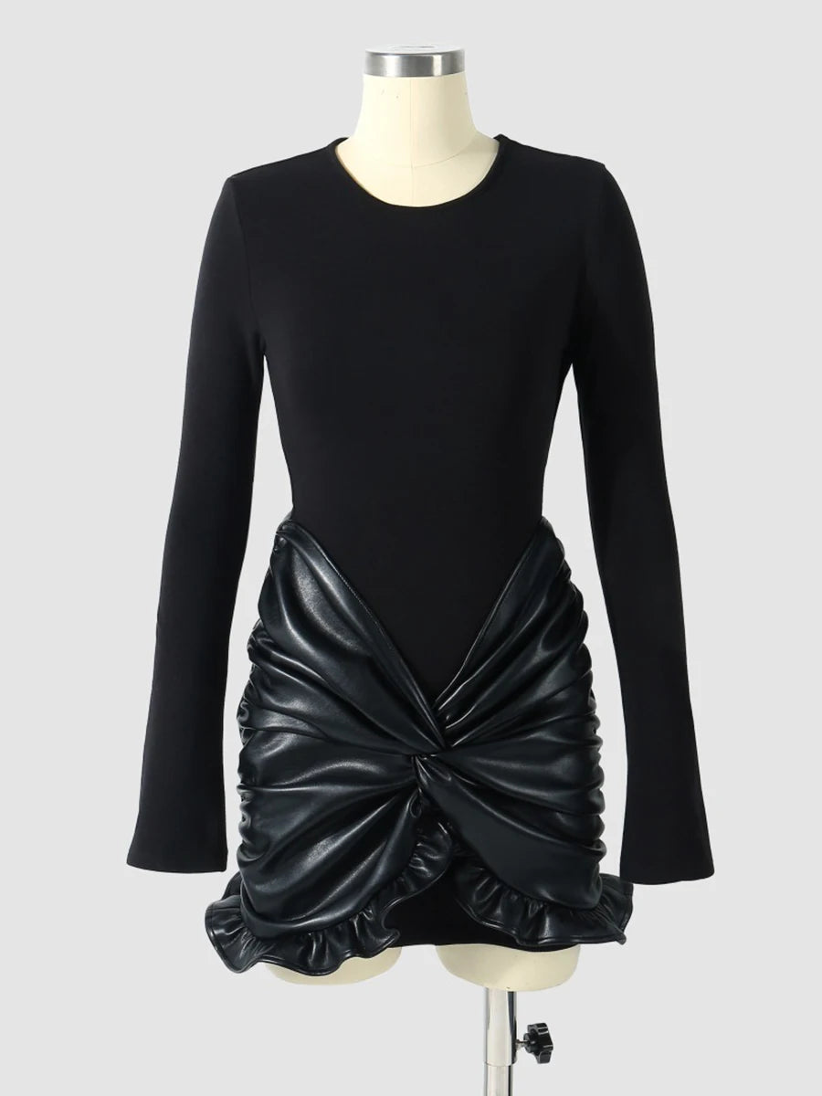 Trend4us Long Sleeve Faux Leather Ruched Mini Dress
