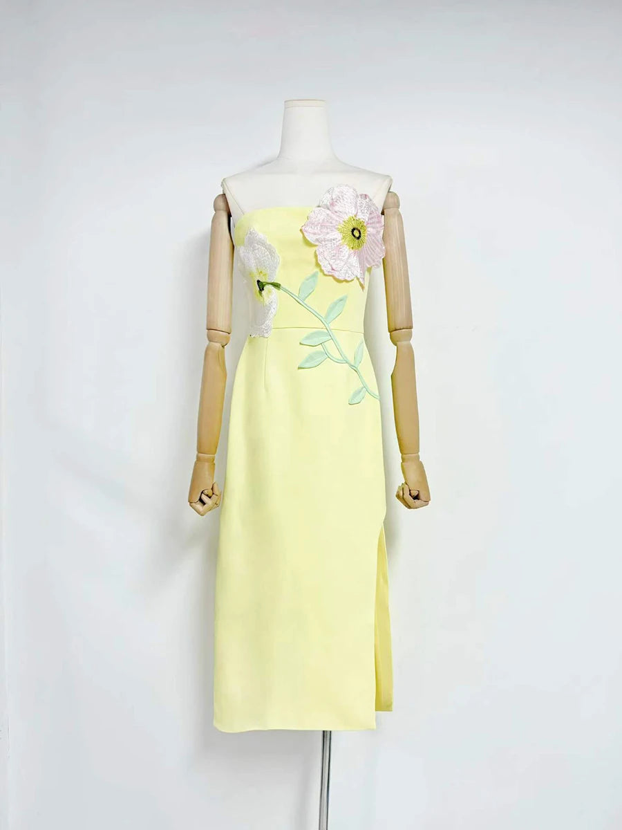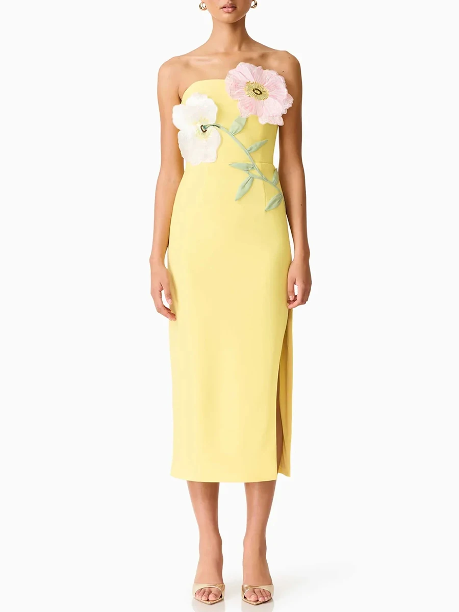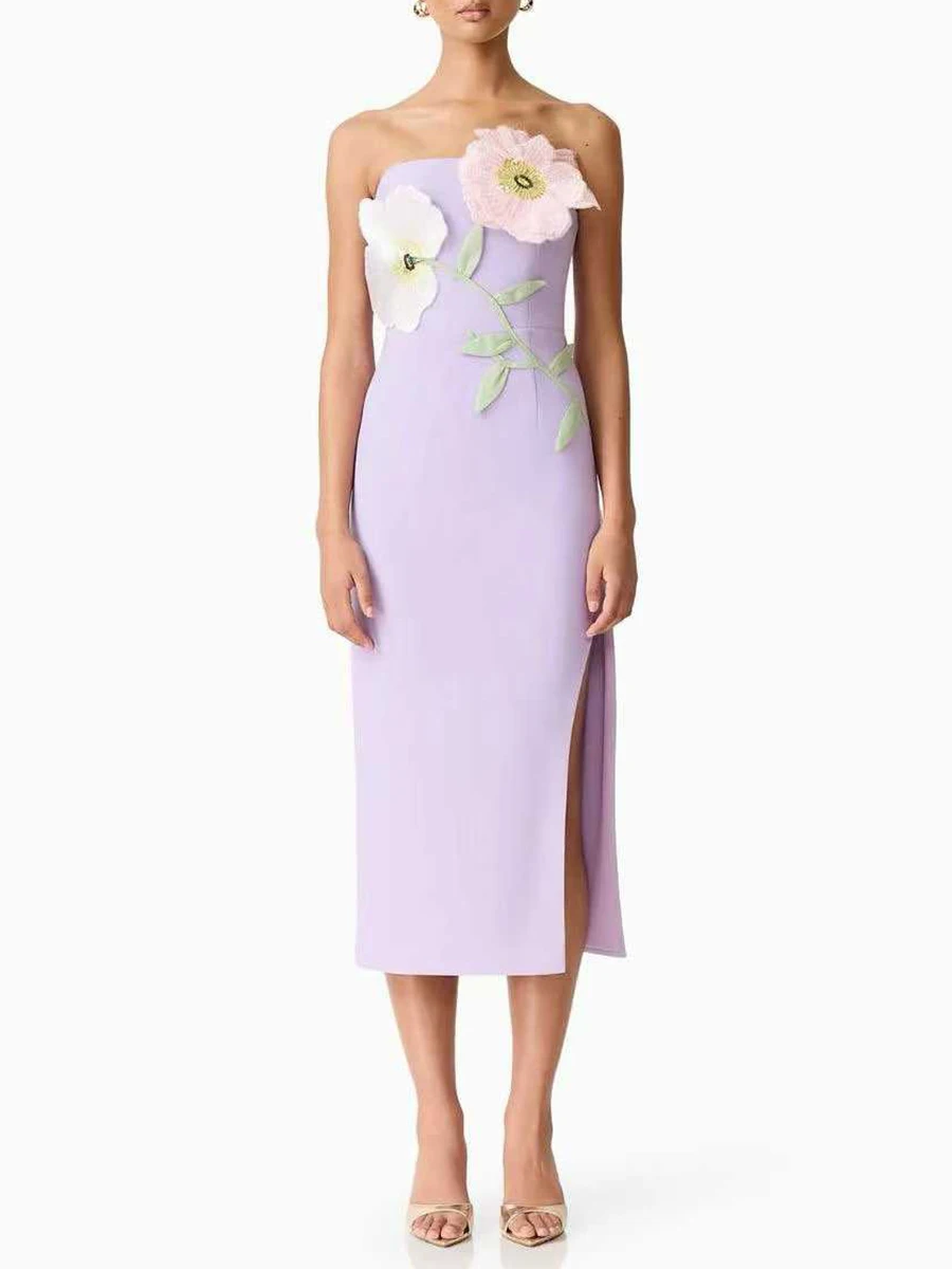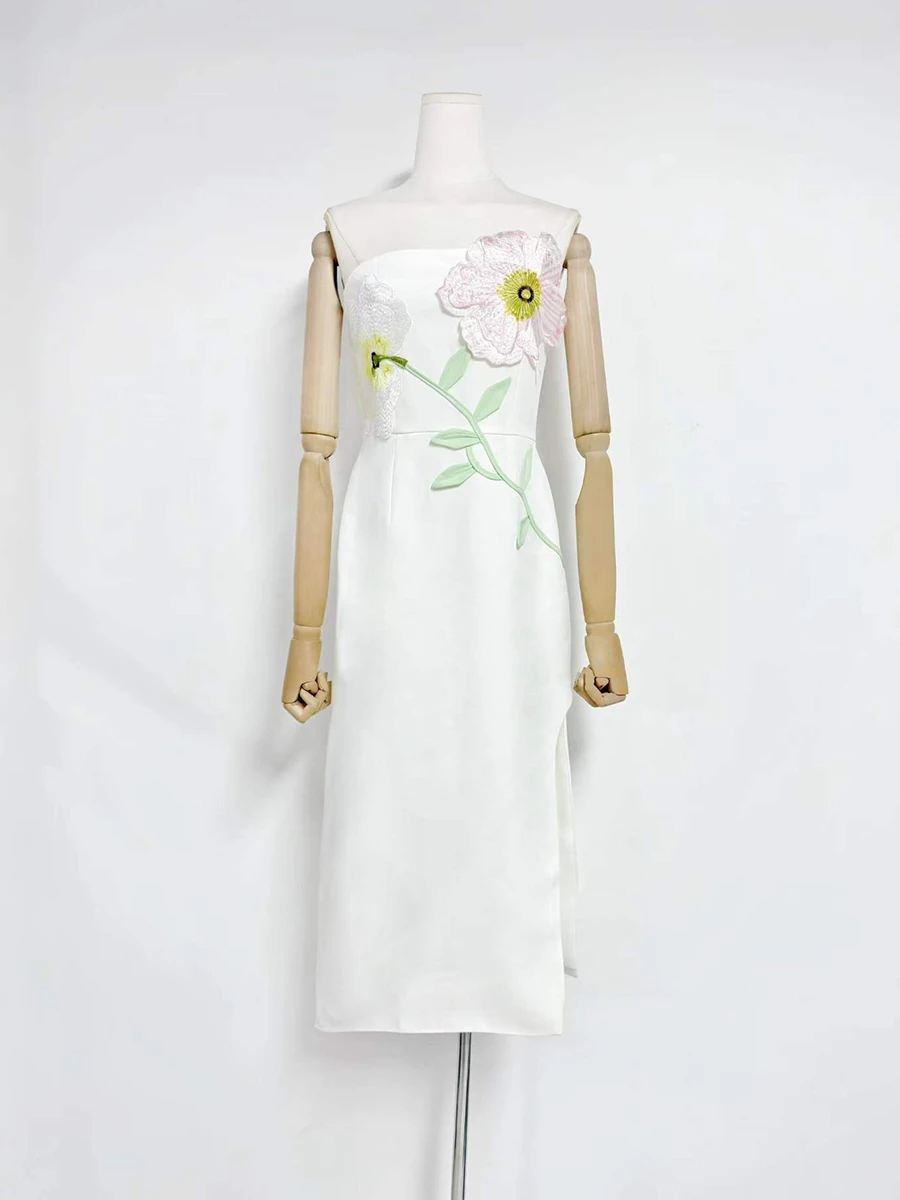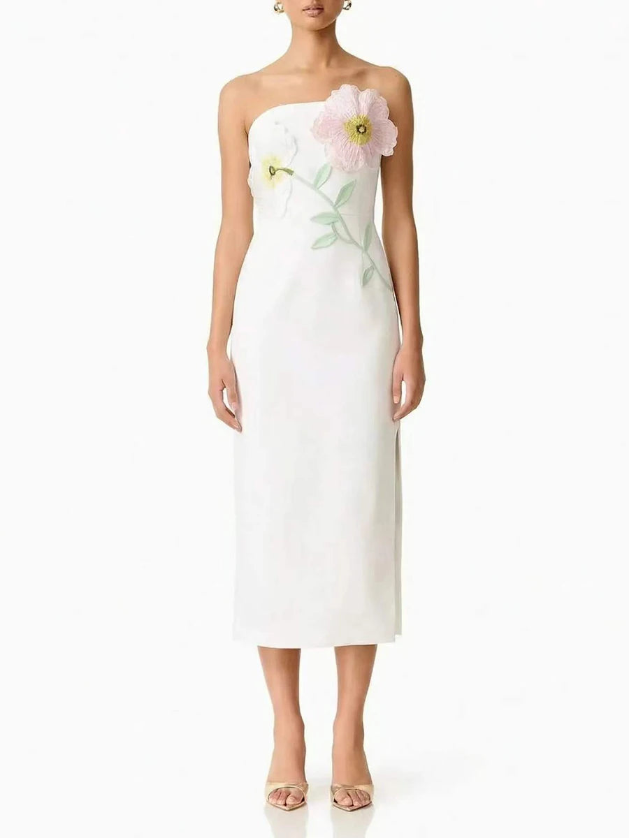 Trend4us Elegant Strapless 3D Floral Appliqué Midi Dress