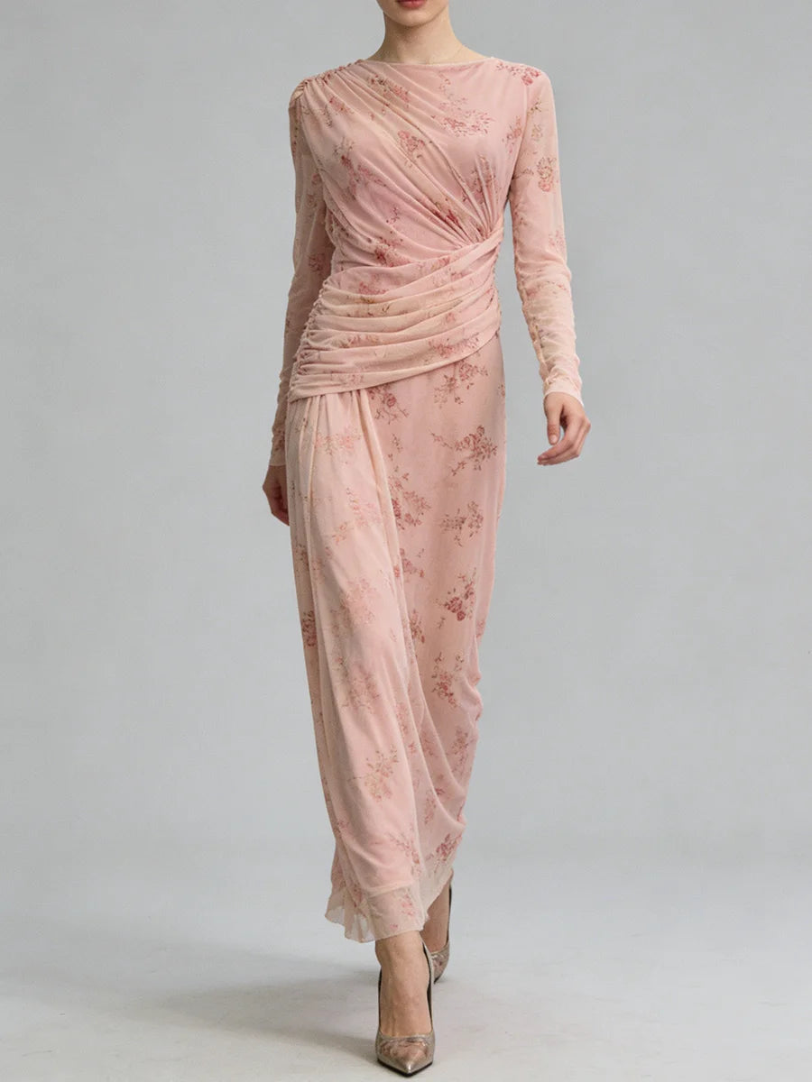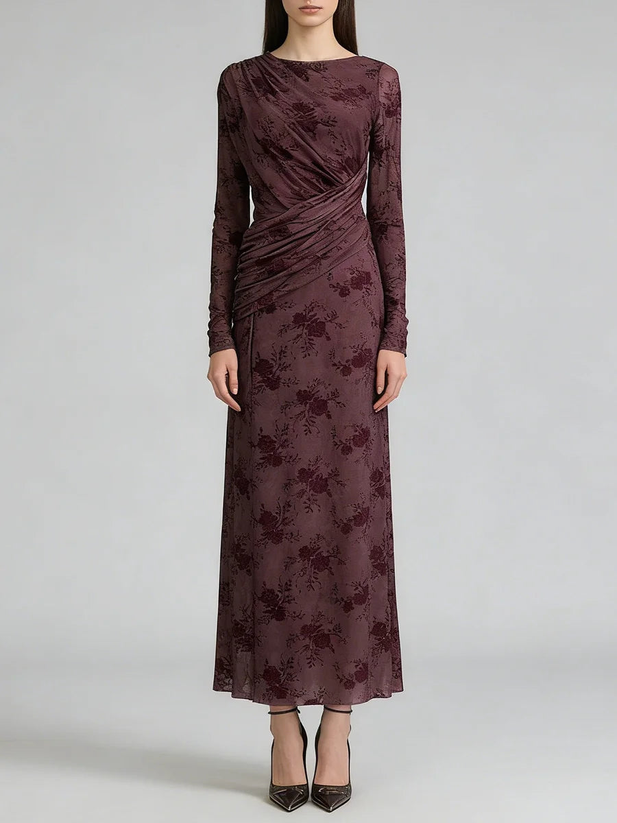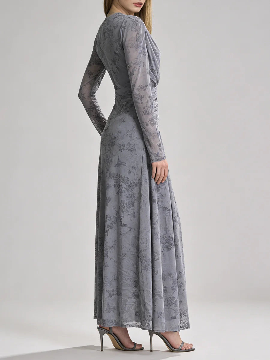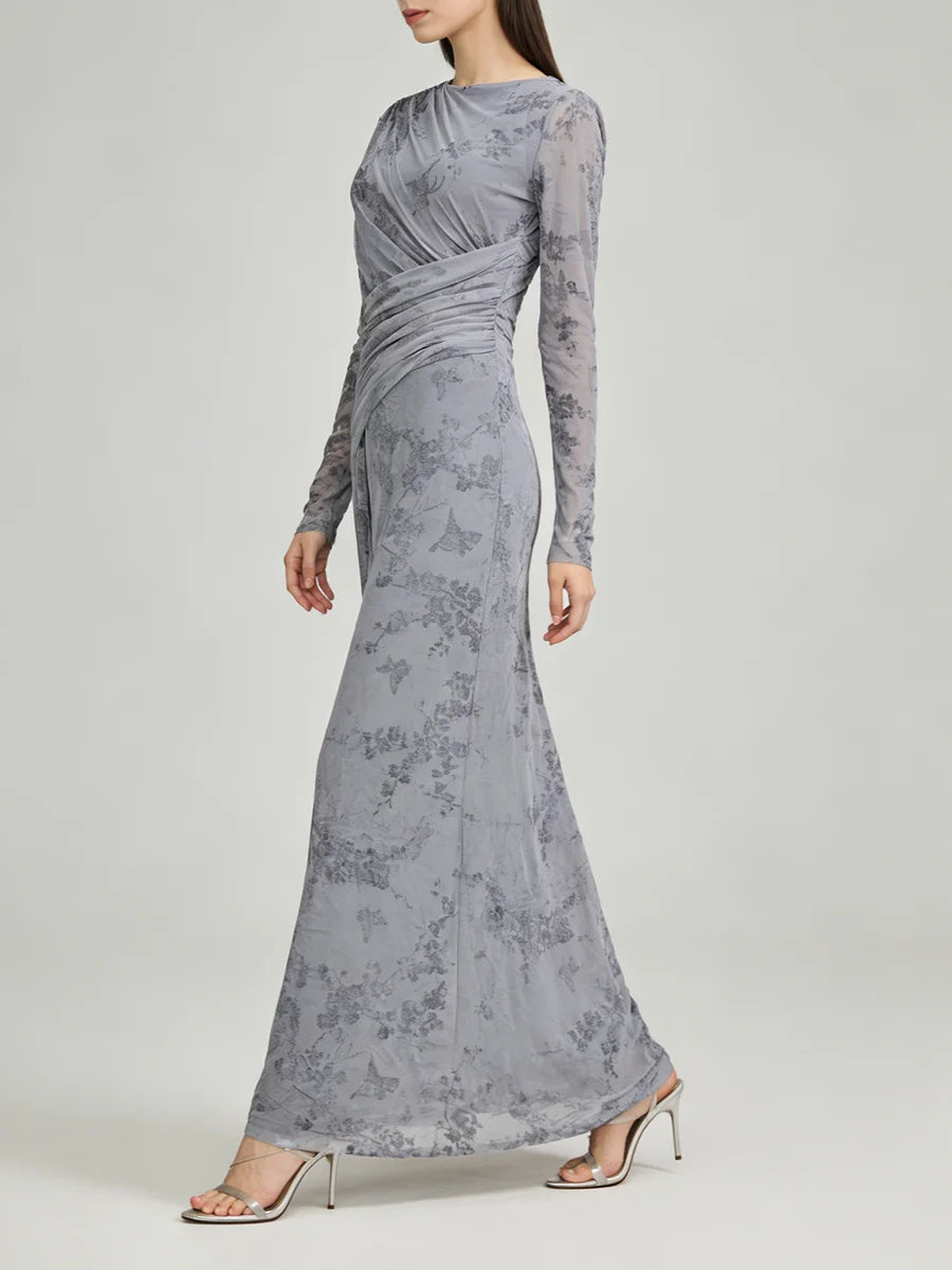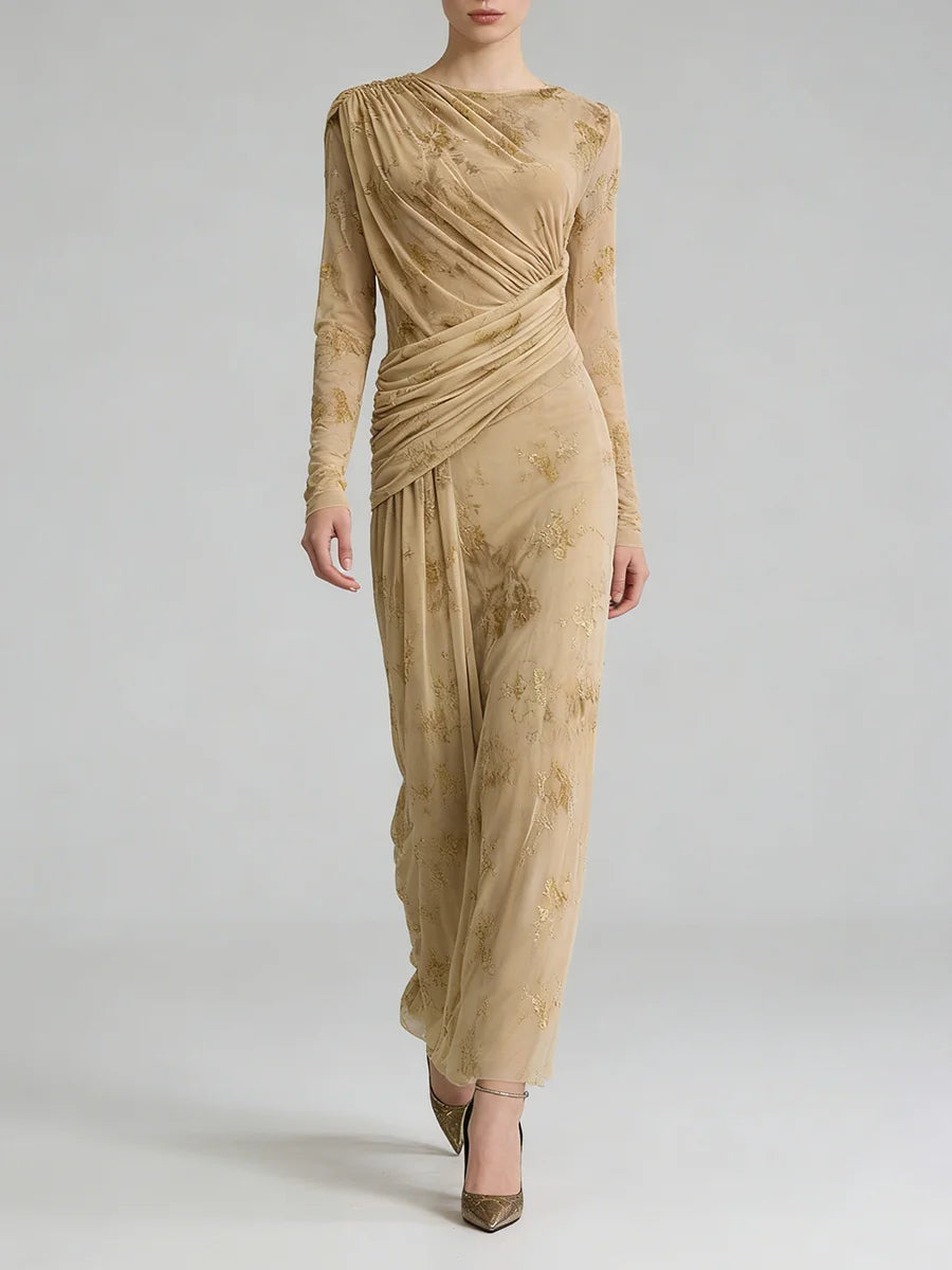 Trend4us Elegant Floral Mesh Draped Long Sleeve Maxi Dress