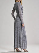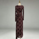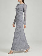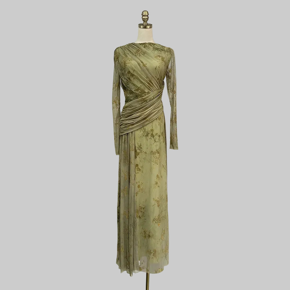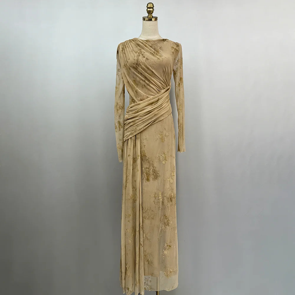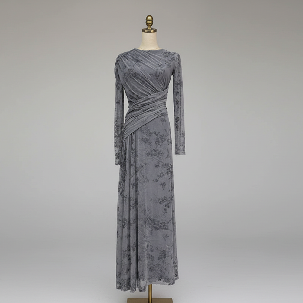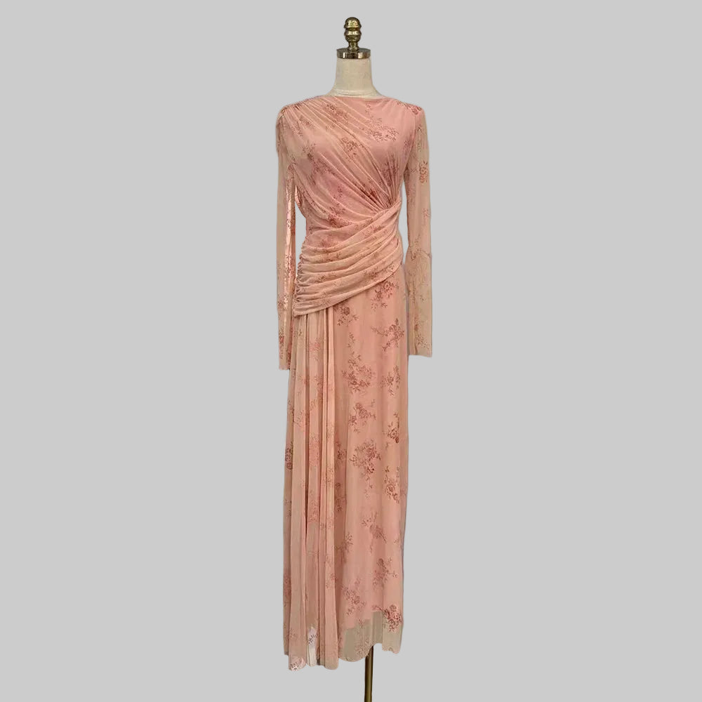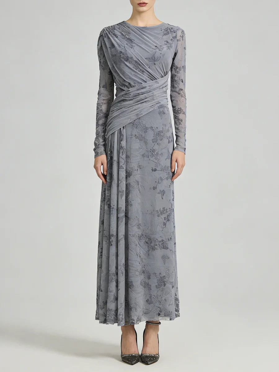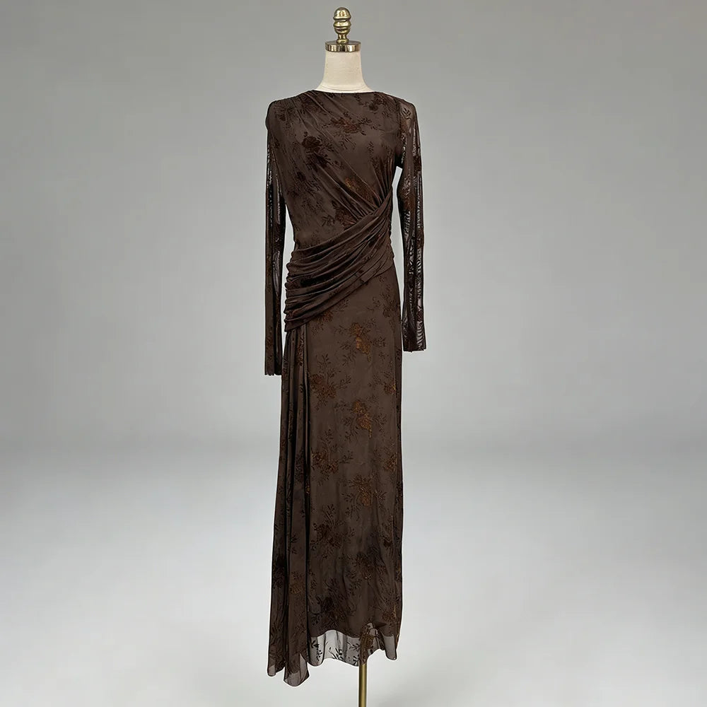 Trend4us Elegant Floral Mesh Draped Long Sleeve Maxi Dress
