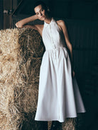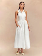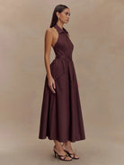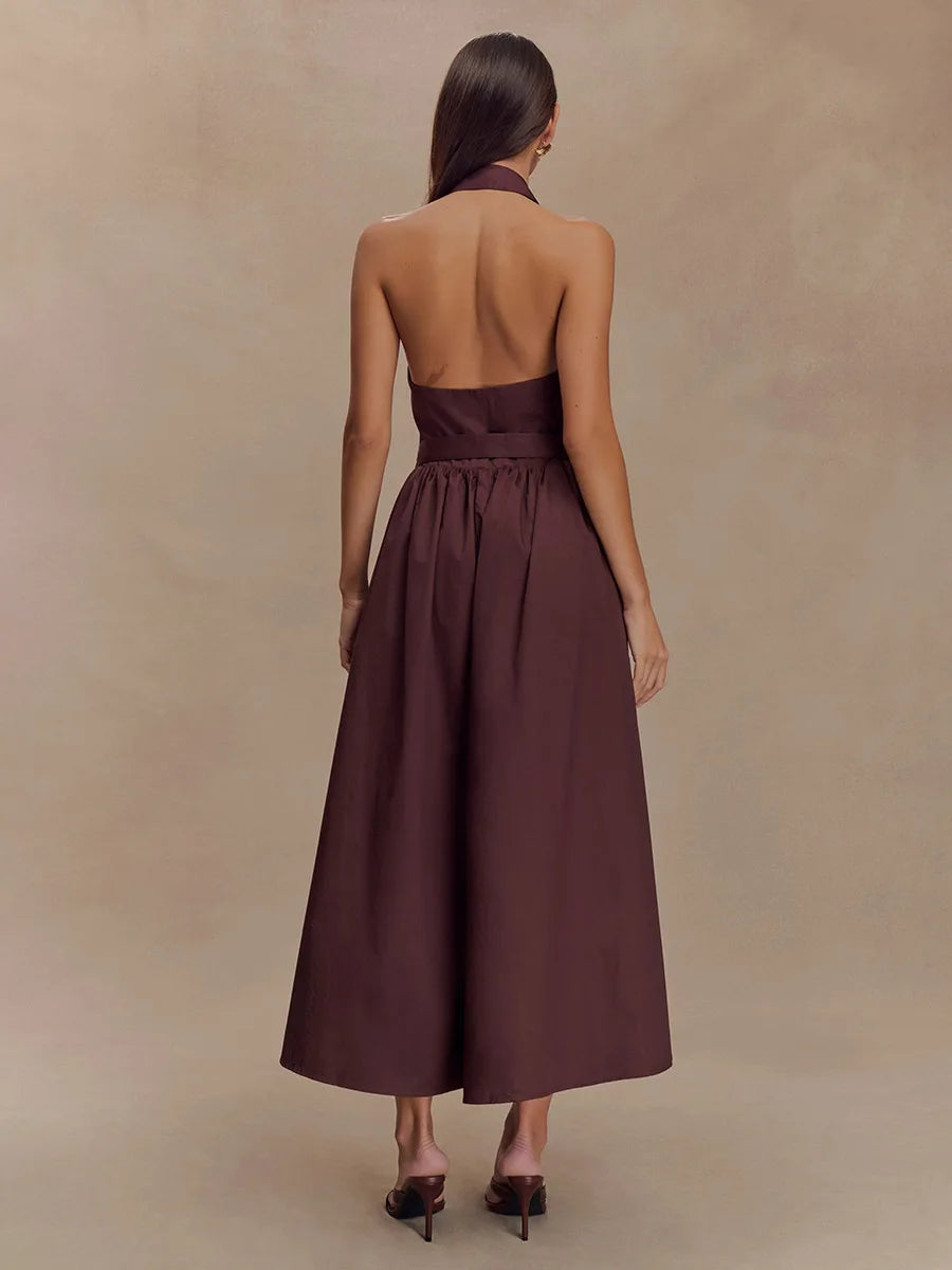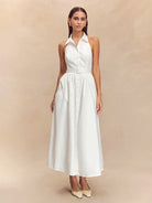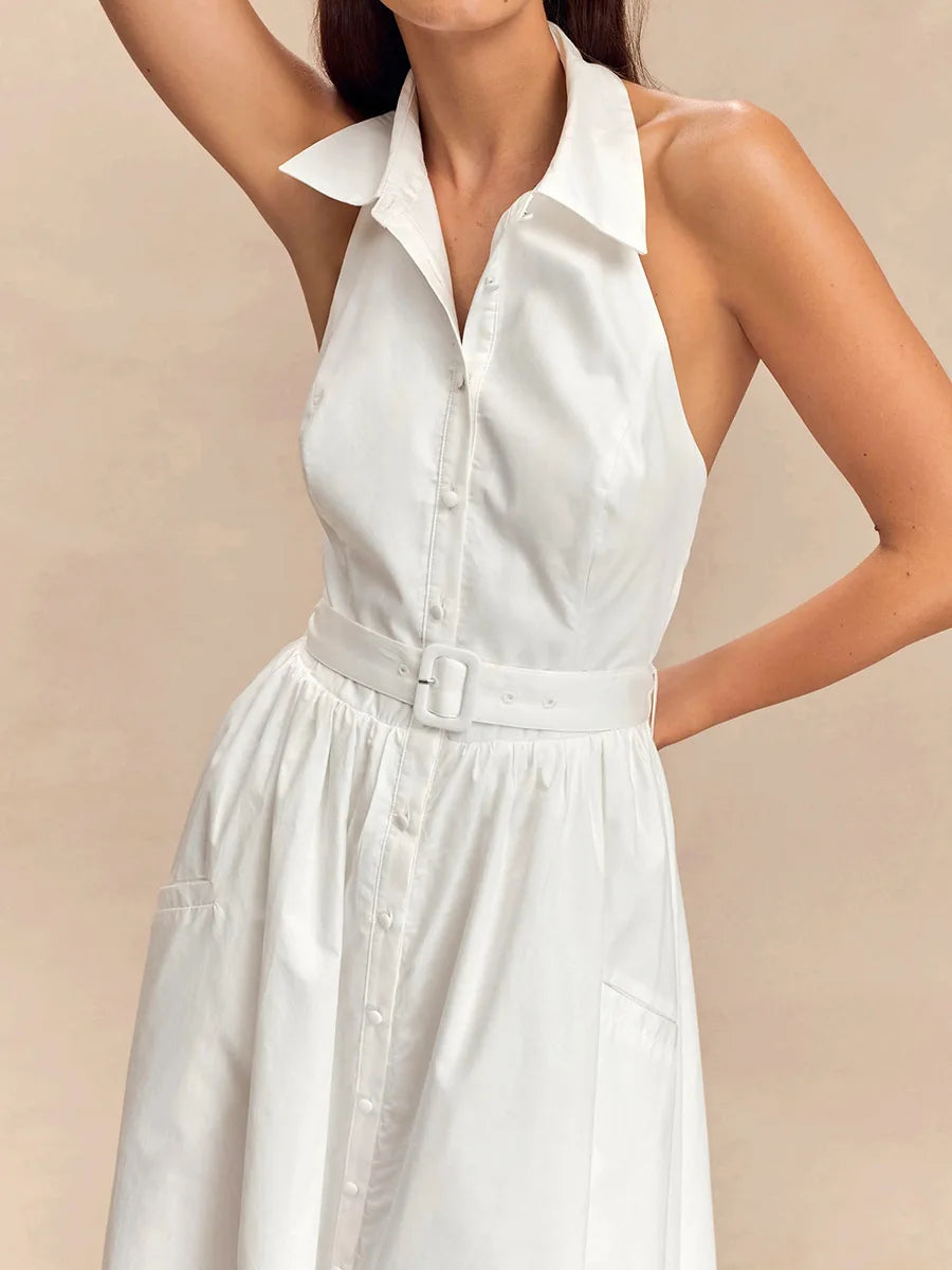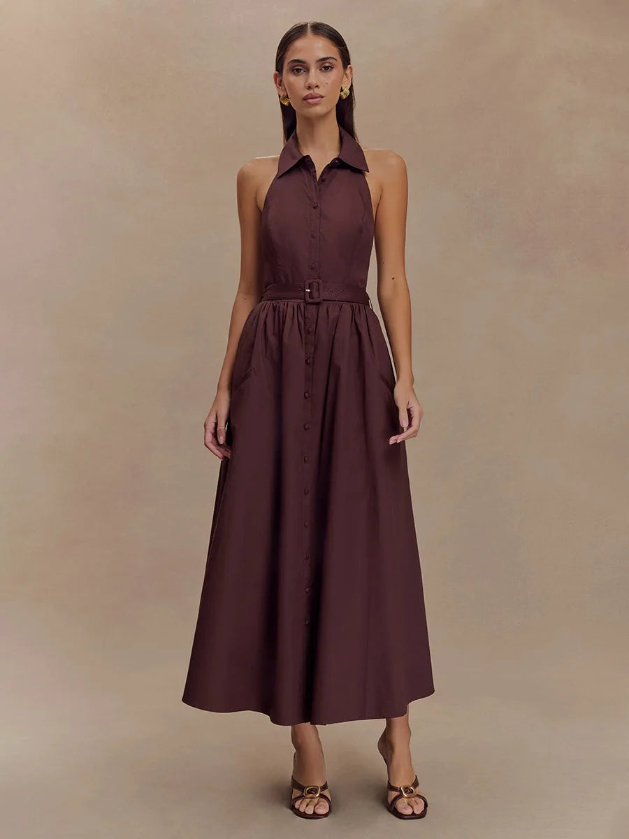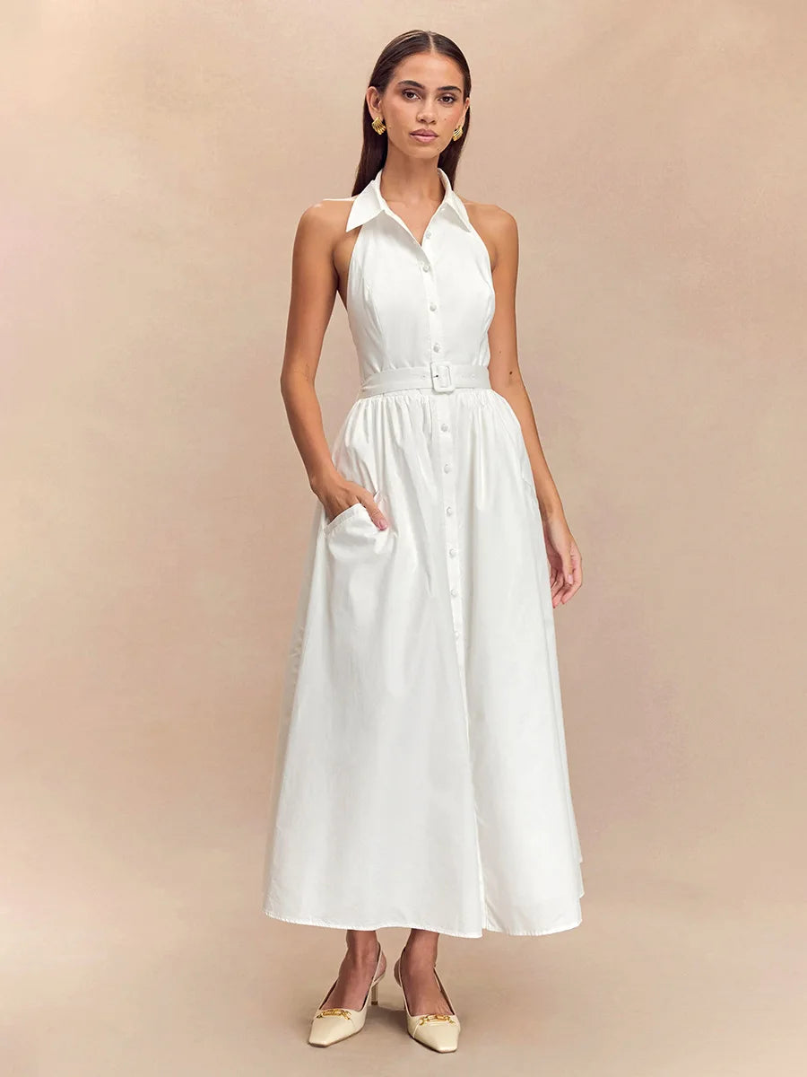 Effortless elegance, beautifully undone. This sleeveless halter dress features a classic turn-down collar, single-breasted button-front closure, and a daring backless cut that adds a modern, sensual edge to a timeless silhouette. Crafted from breathable cotton with a slim A-line shape and empire waistline, it drapes gracefully to ankle length — making it the perfect choice for summer soirées, garden parties, or elevated casual occasions. Available in warm Coffee and crisp White.