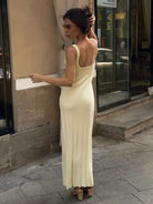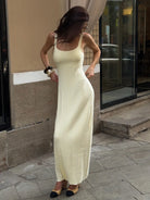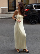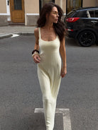 Your go-to for effortless warm-weather dressing. This camisole-style maxi dress is crafted from soft viscose knit with medium stretch that moves with your body and feels luxuriously comfortable all day long. The square neckline and empire waistline create a flattering, feminine silhouette, while the slim sheath cut and pullover design keep things sleek and fuss-free. Whether you're heading to the beach, a vacation dinner, or a breezy summer outing — this dress is your perfect companion. Available in White, Pink, and Yellow.