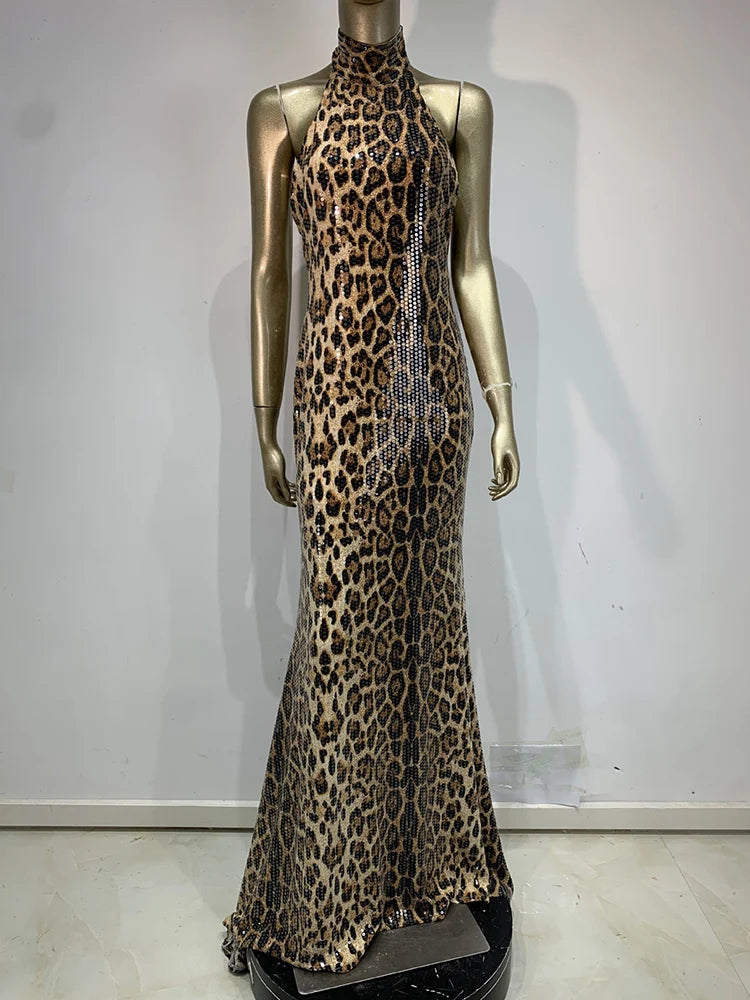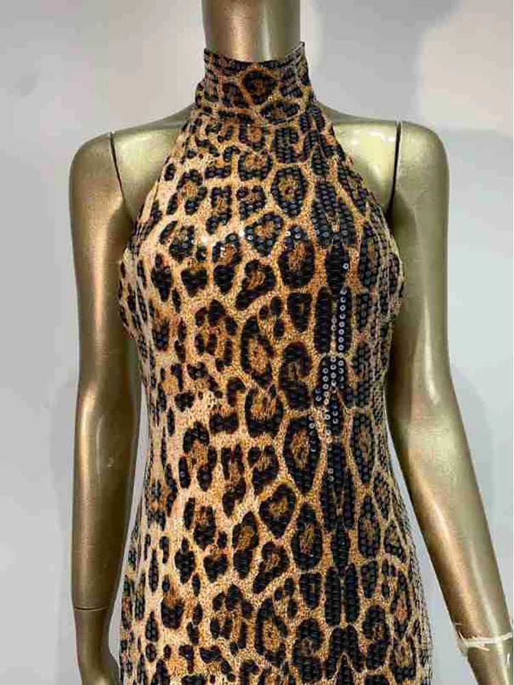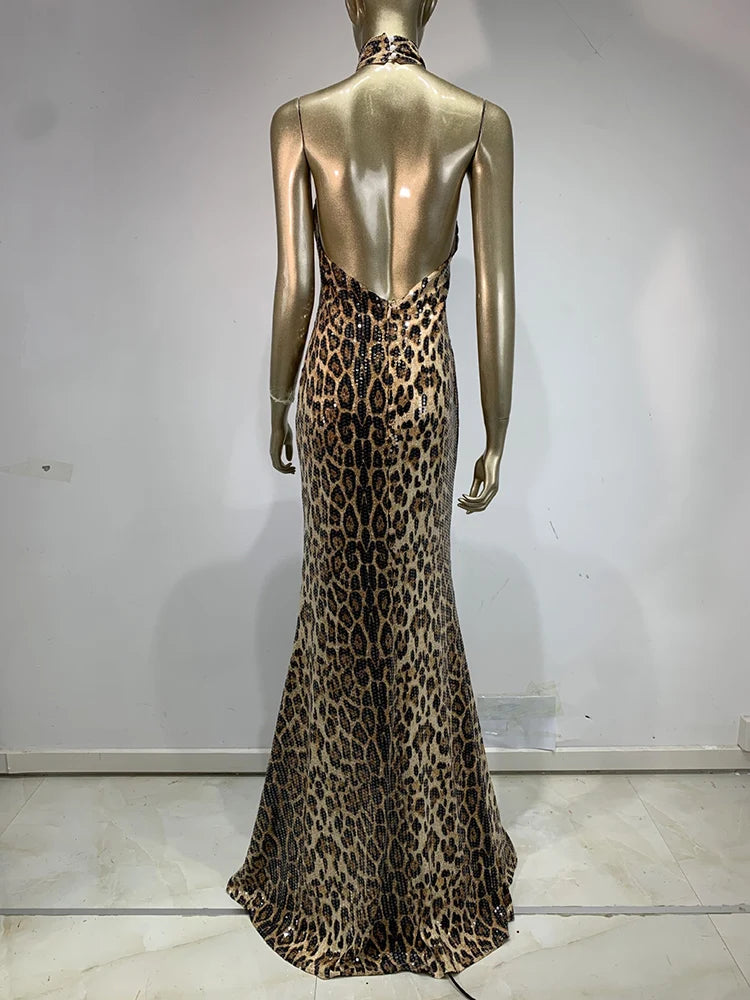 Trend4us Luxe Leopard Sequin Backless Halter Maxi Dress