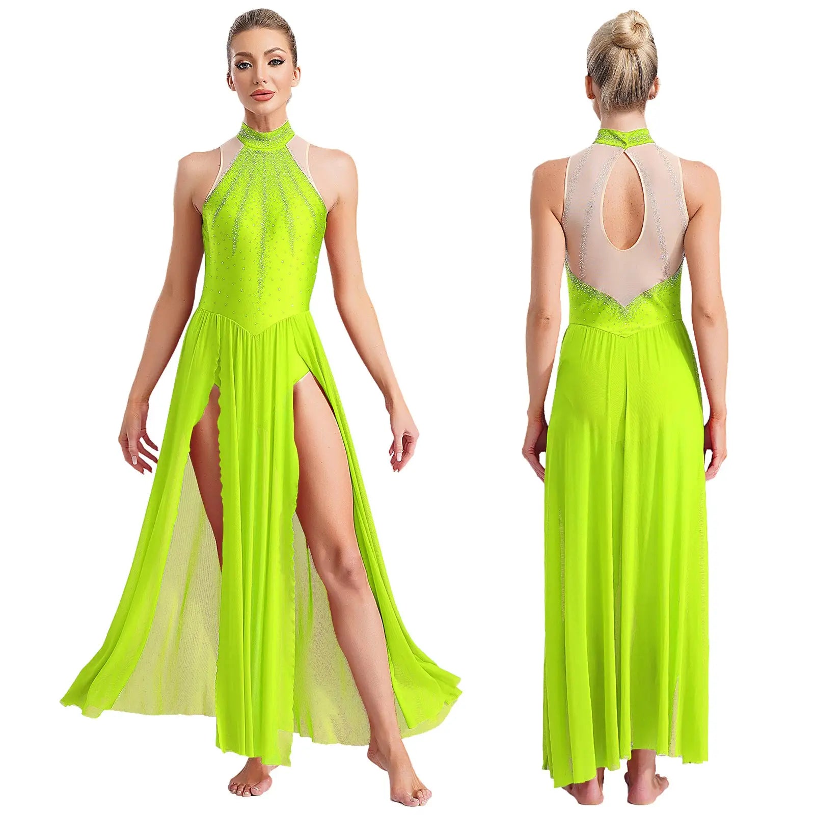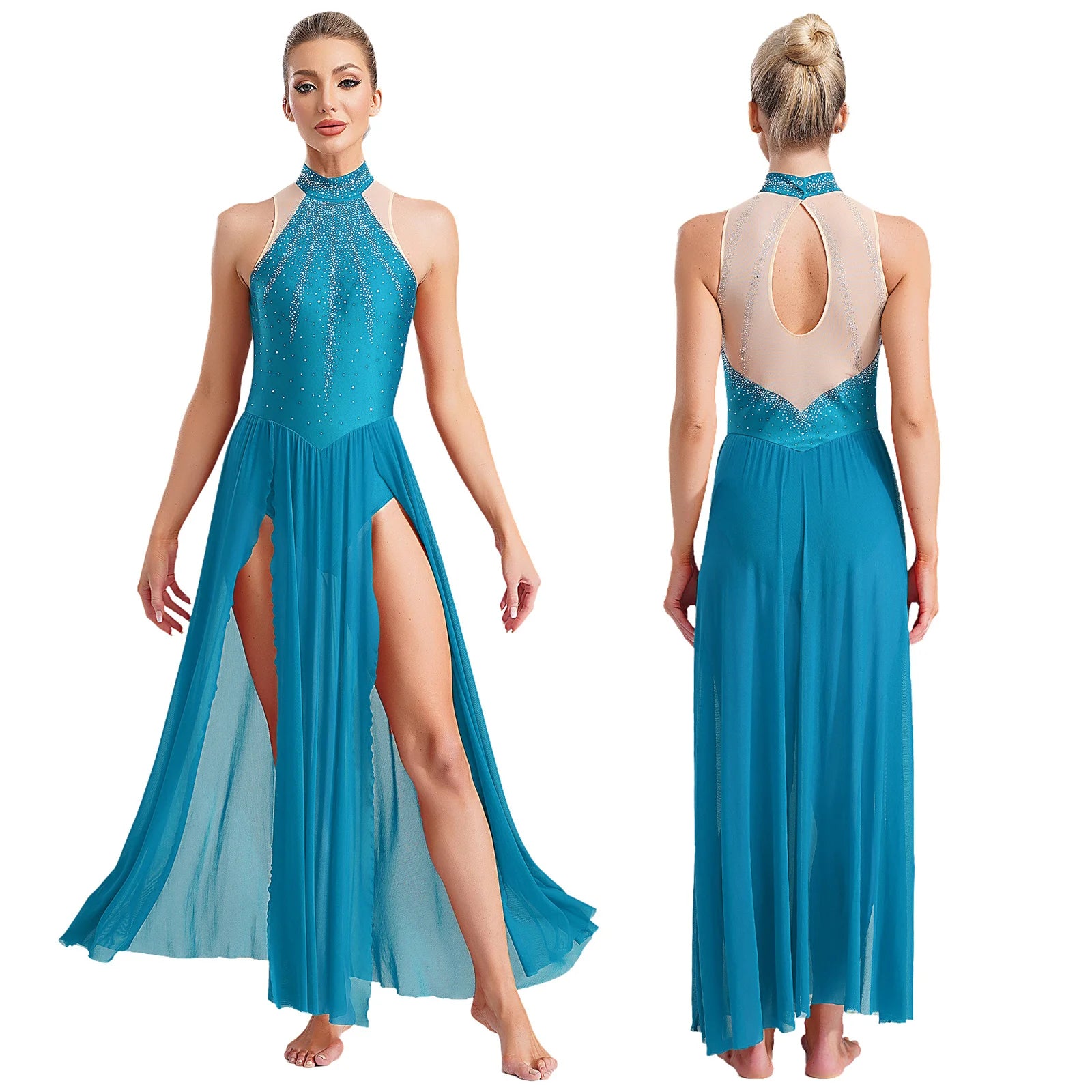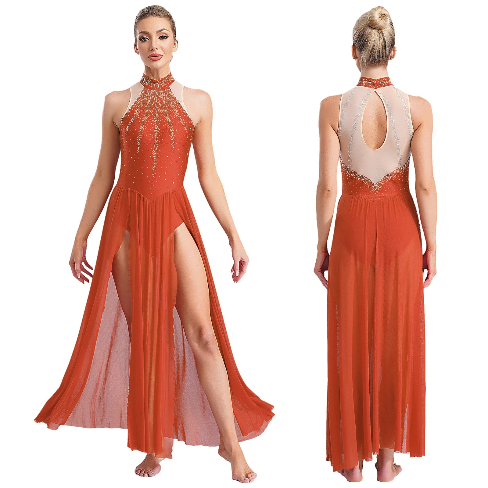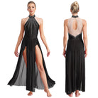 The illusion mesh back creates a refined, seamless appearance while ensuring secure coverage and breathability. Flowing from the fitted leotard, the sheer maxi skirt with high slits adds breathtaking motion—perfect for turns, extensions, and expressive choreography. Ideal for lyrical, contemporary, ballet, ballroom, Latin, and stage performances, this dress is crafted to move beautifully with the dancer while maintaining comfort and confidence.
