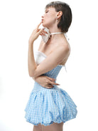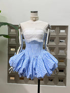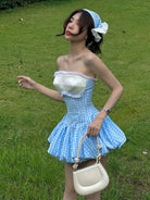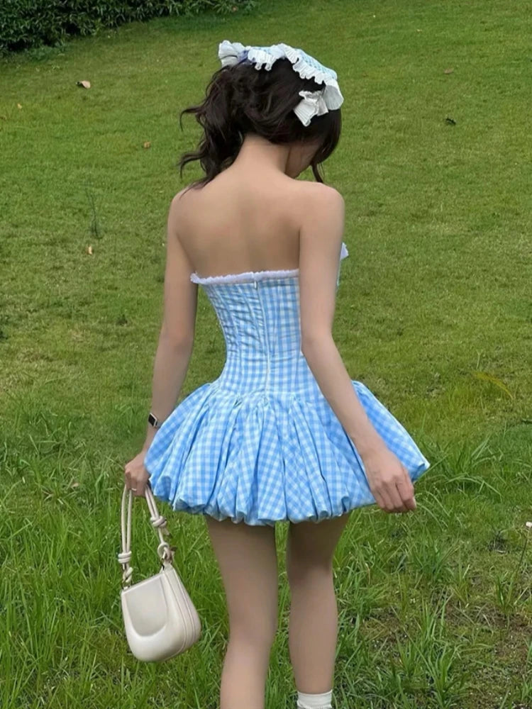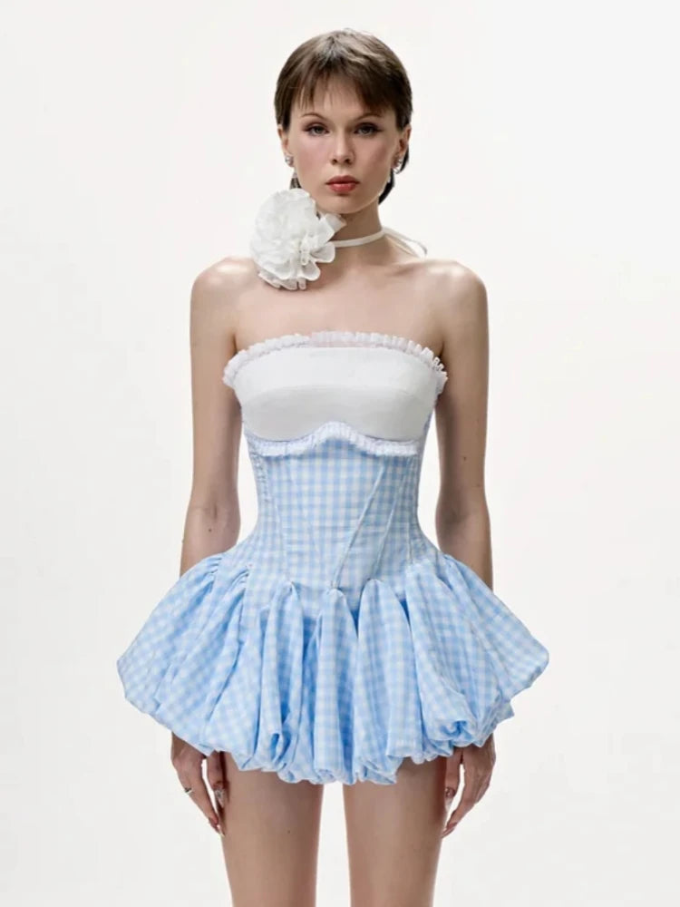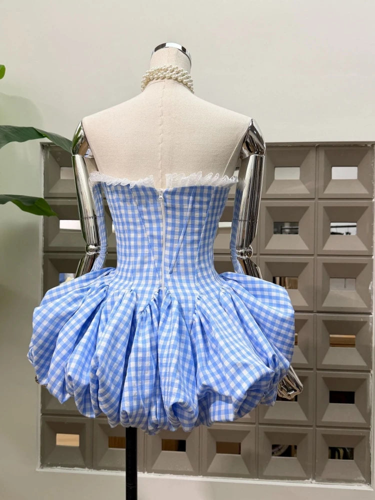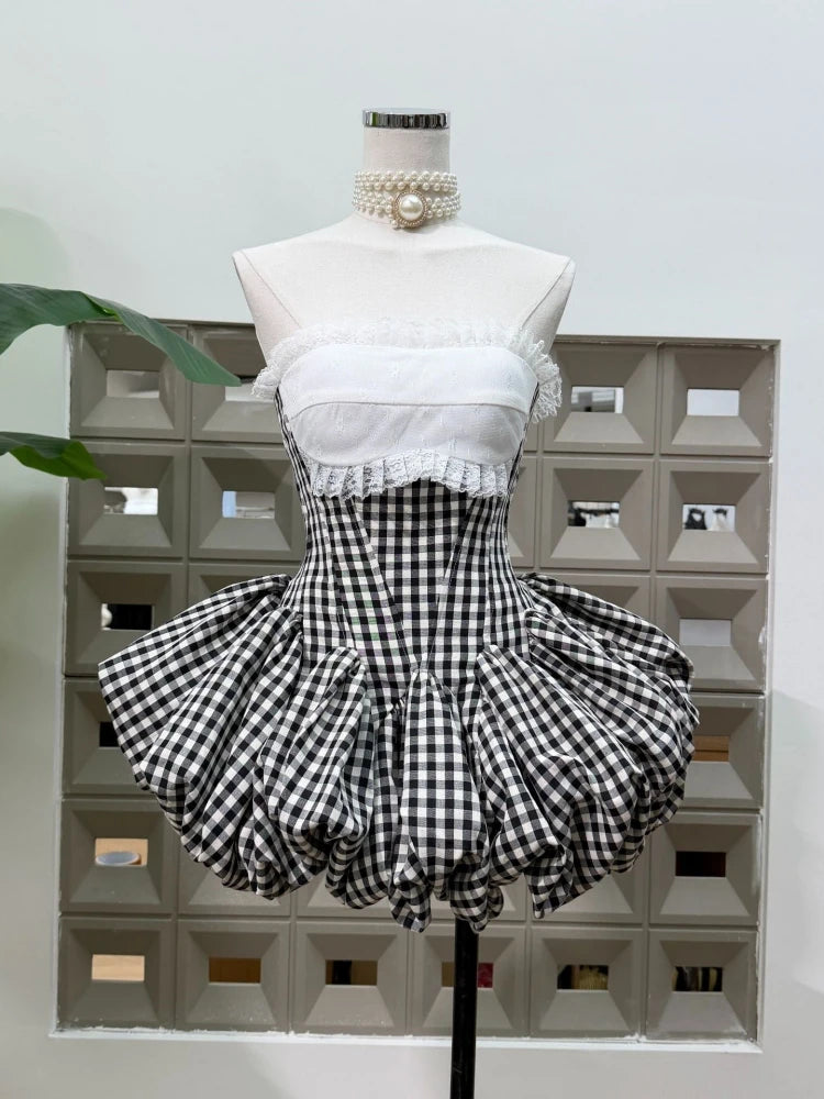 Playful meets polished. This strapless bubble mini dress blends a structured corset-style chest wrap with delicate lace trim and a charming plaid pattern — a combination that's equal parts flirty and refined. The A-line silhouette flares into a bubble hem that adds volume and movement, while the natural waistline and slim fit keep the look sleek and flattering. Dress it up for a night out or style it for a chic daytime event — this piece does it all.