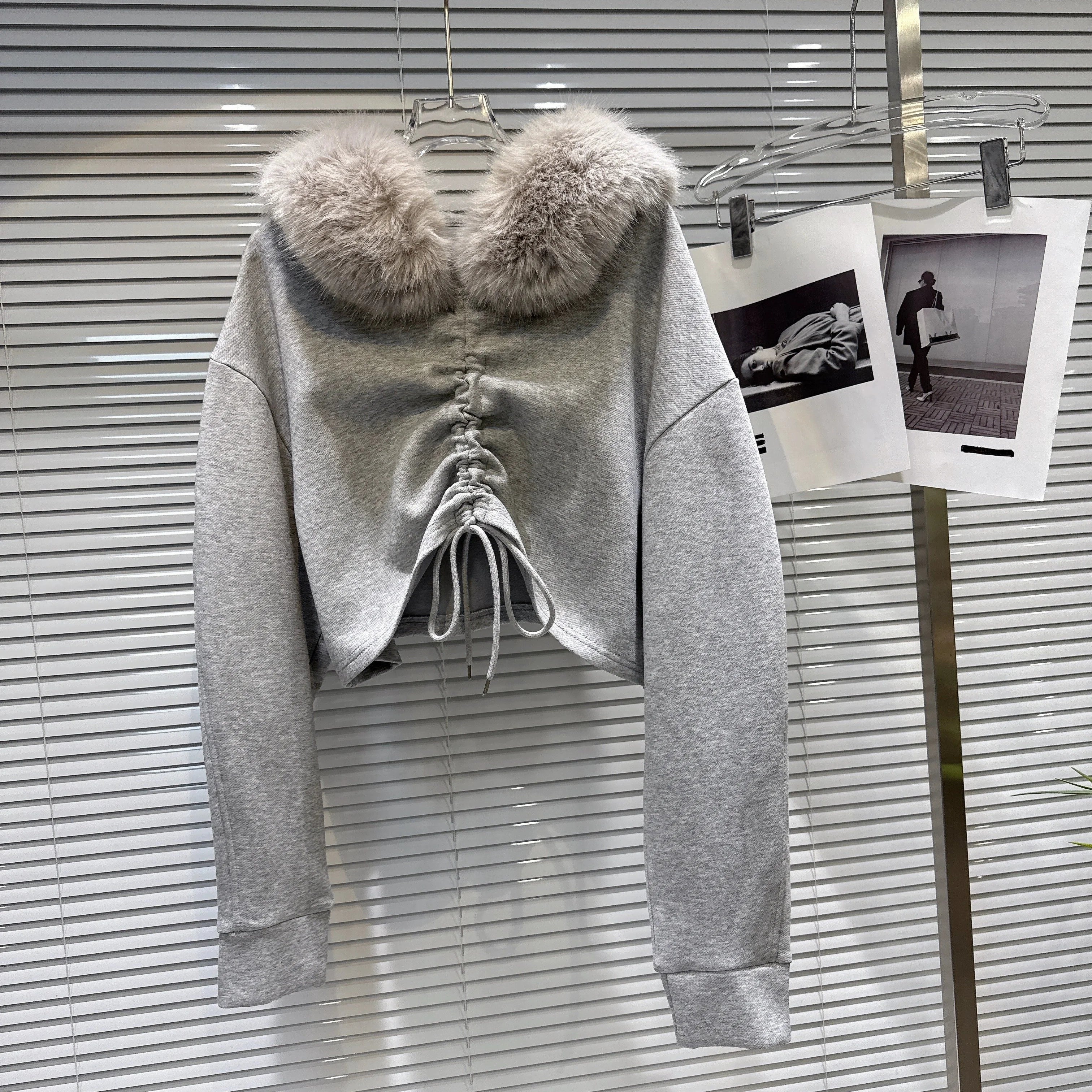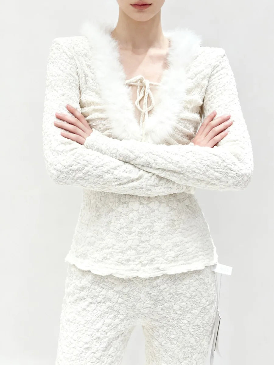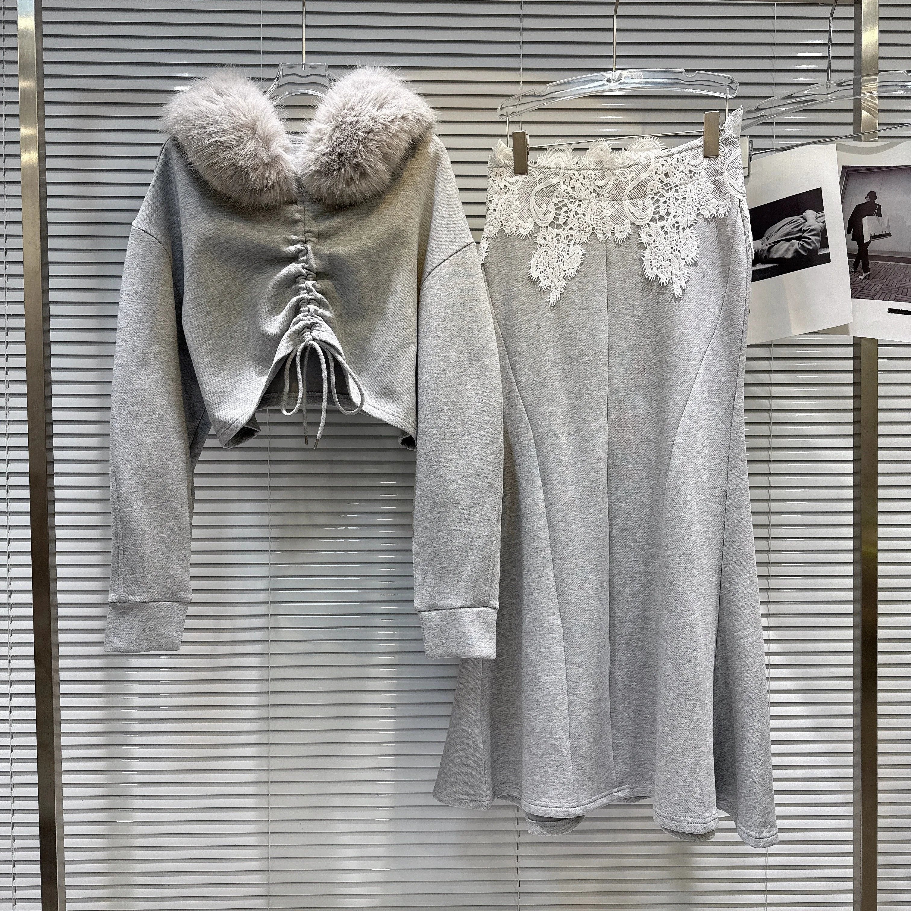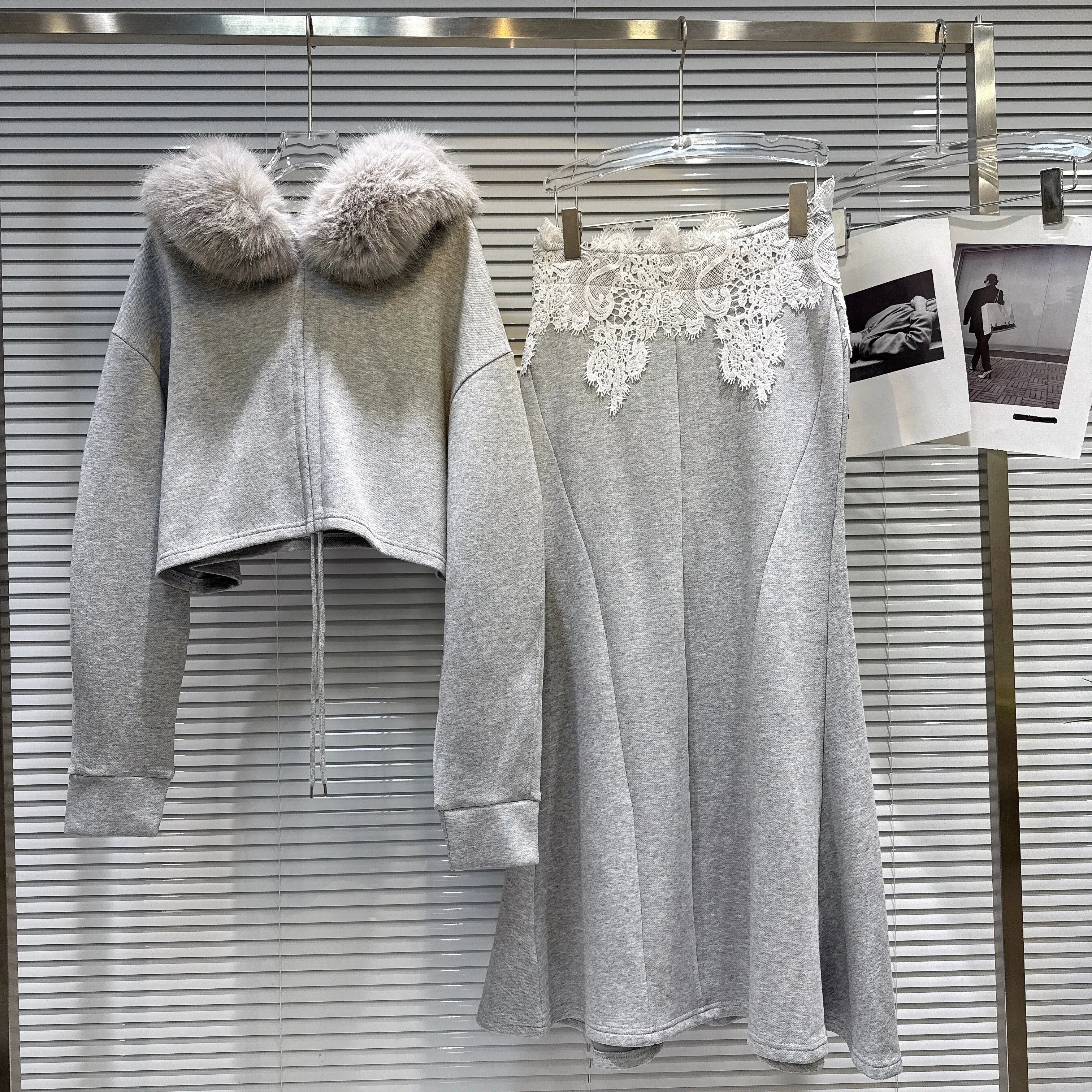 Trend4us Hooded Fur Collar Lace-Trim Two-Piece Lounge Set