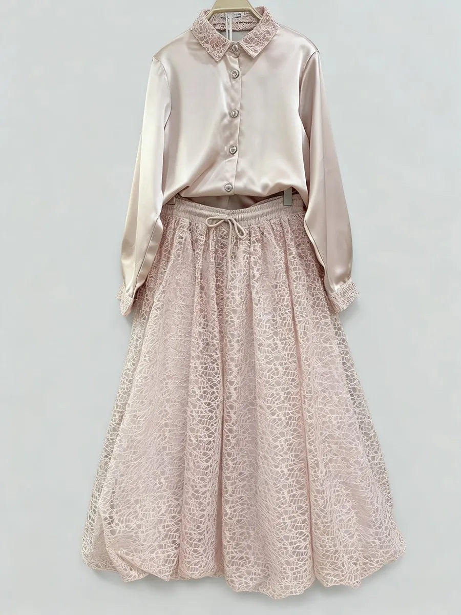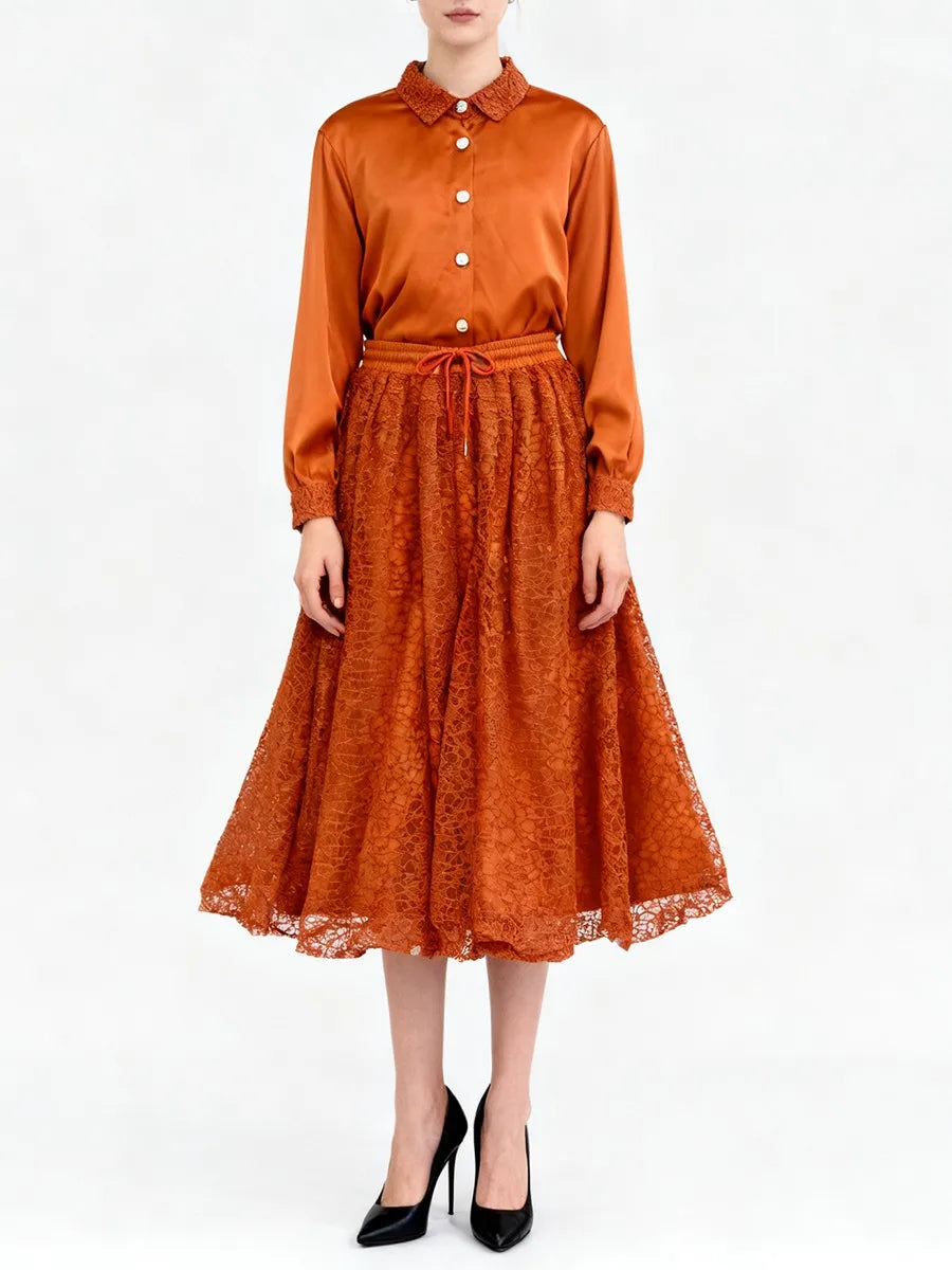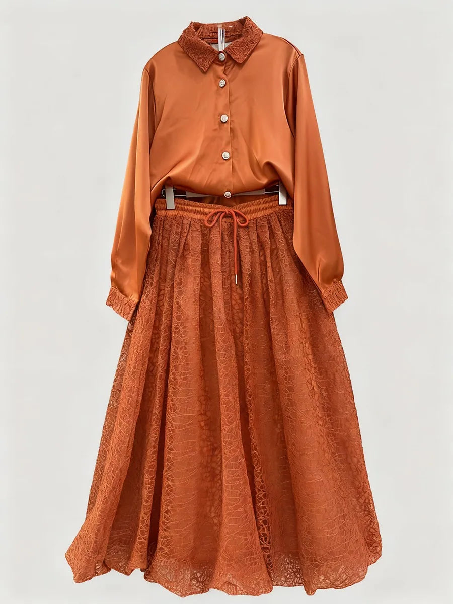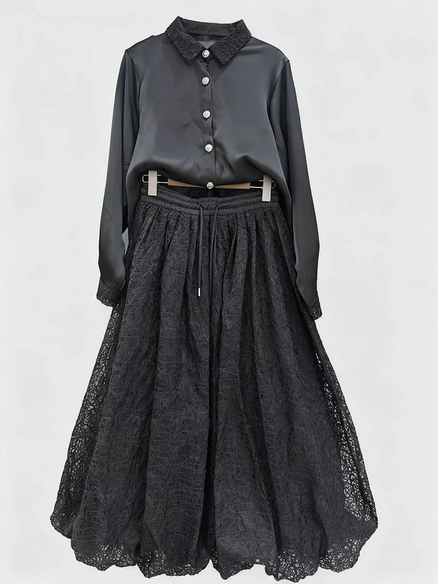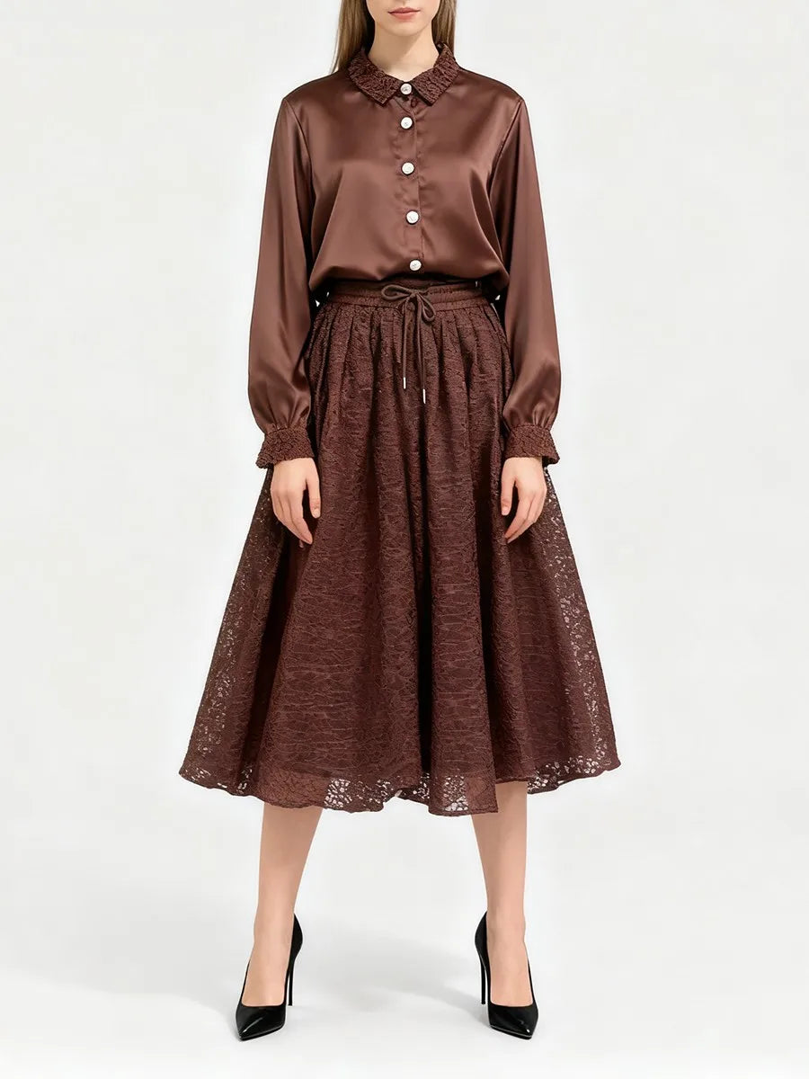 Trend4us Modern Satin Blouse & Flared Lace Skirt Set