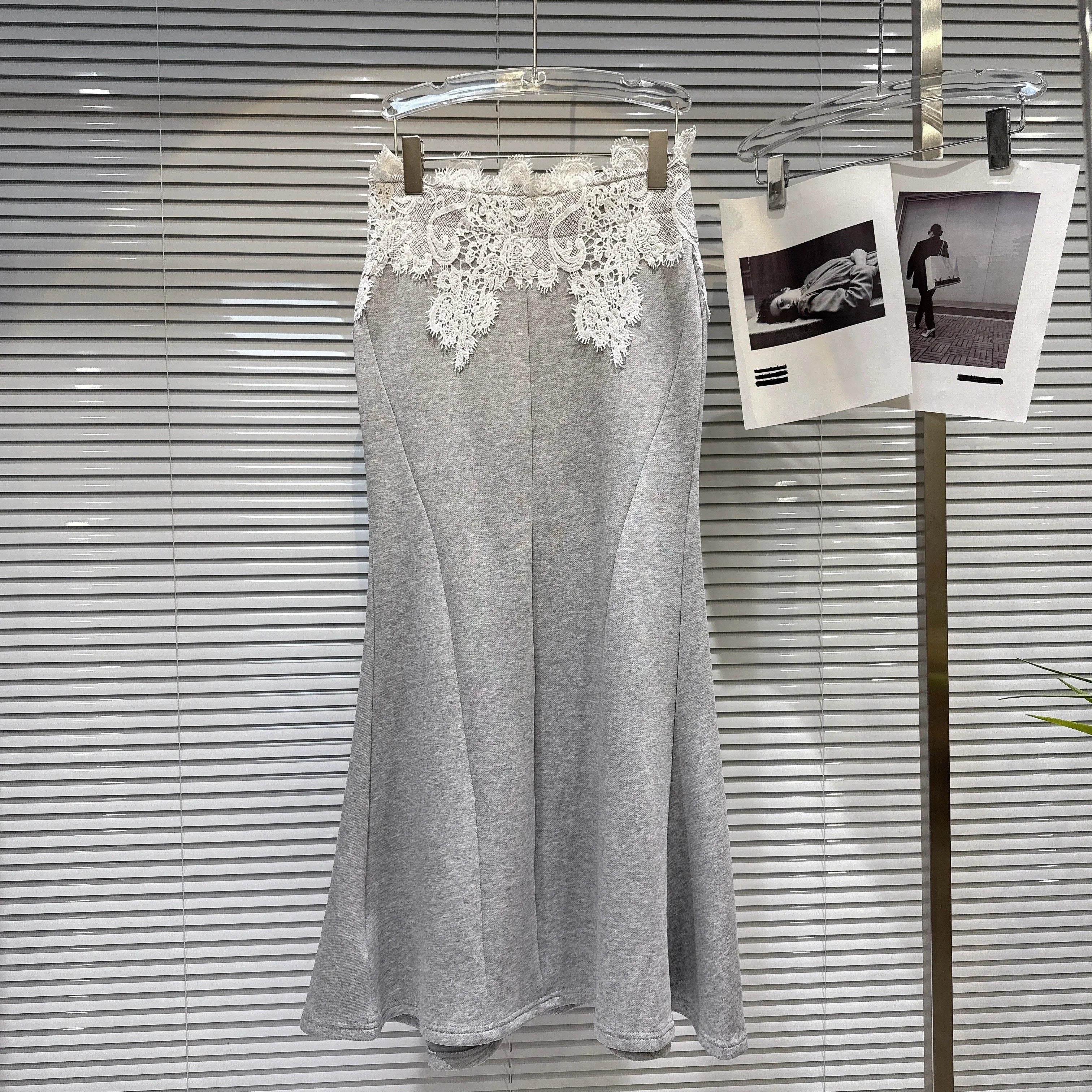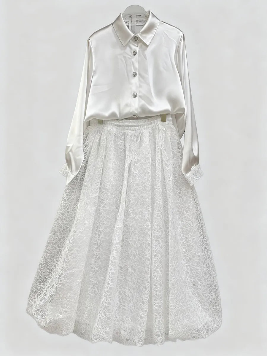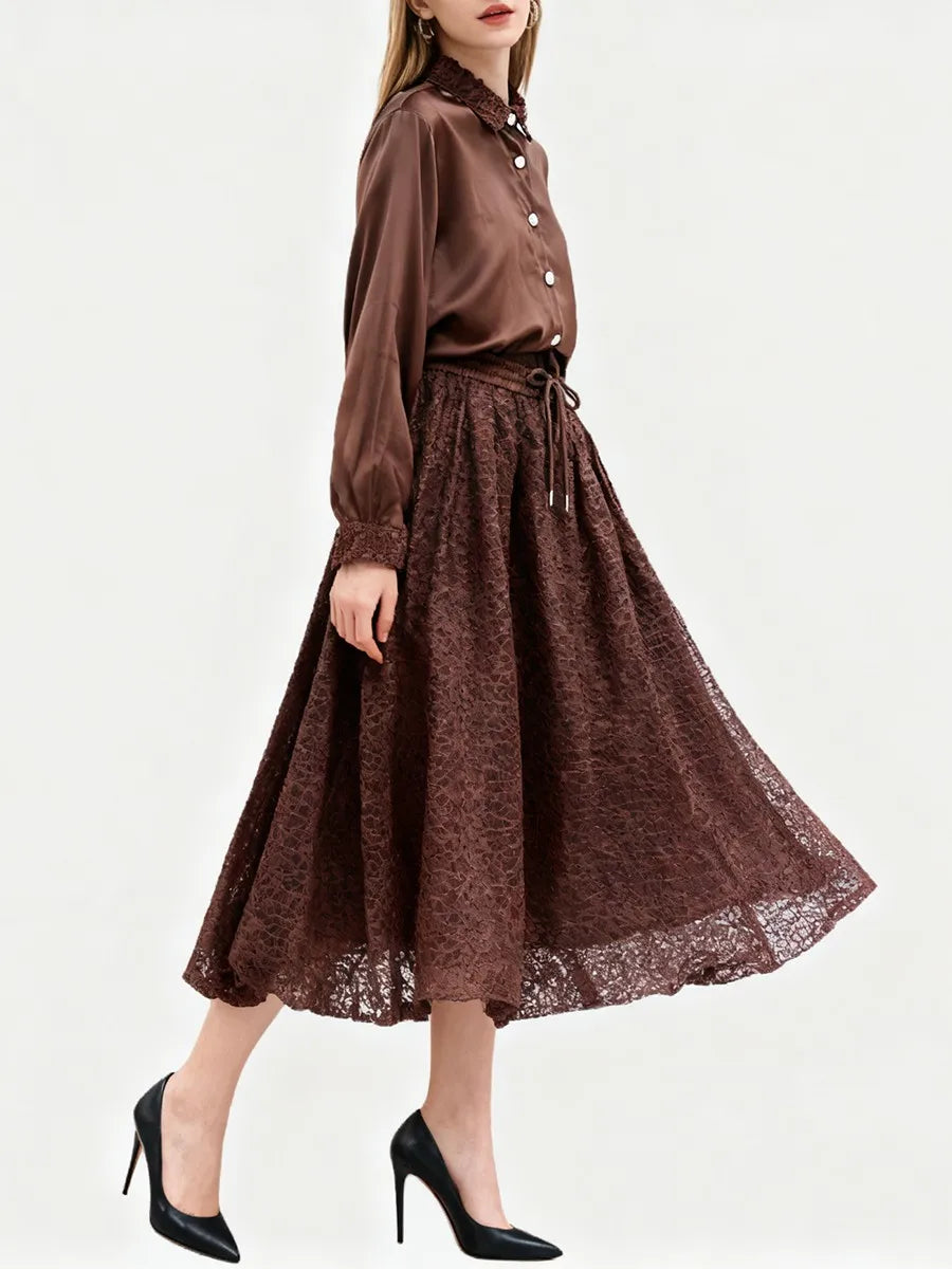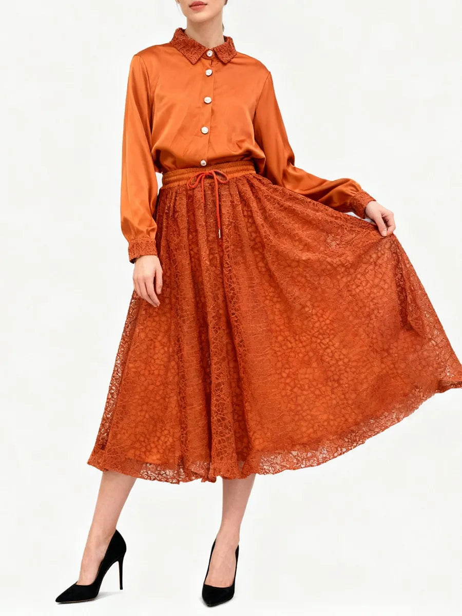 Trend4us Modern Satin Blouse & Flared Lace Skirt Set