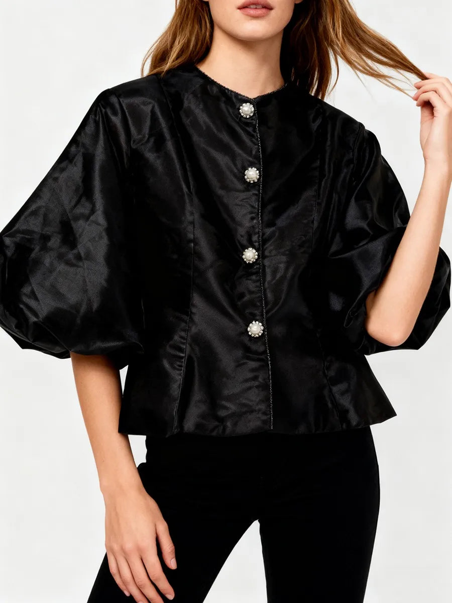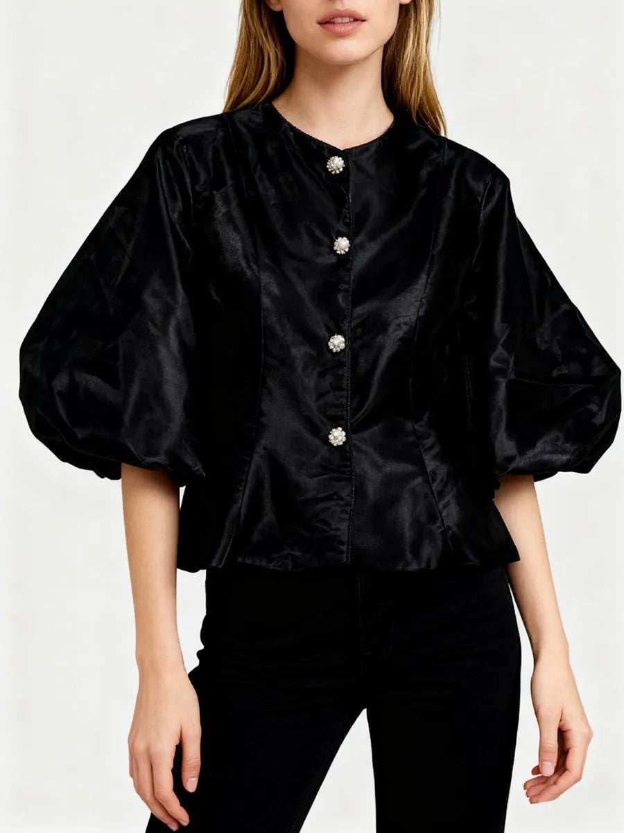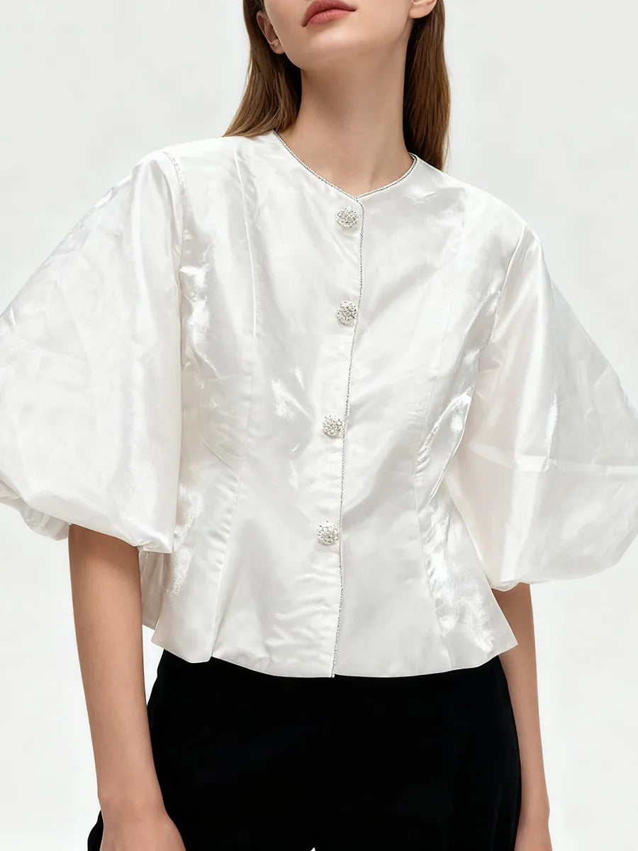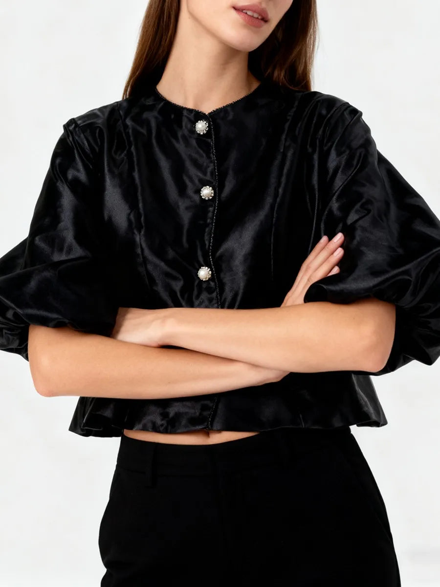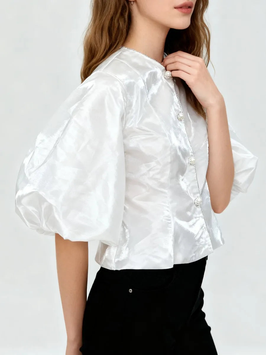Trend4us Pearl-Button Puff Sleeve Satin Blouse