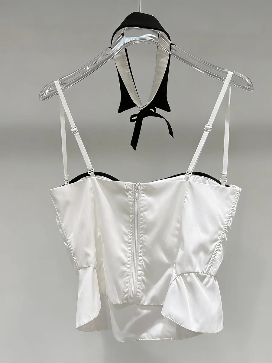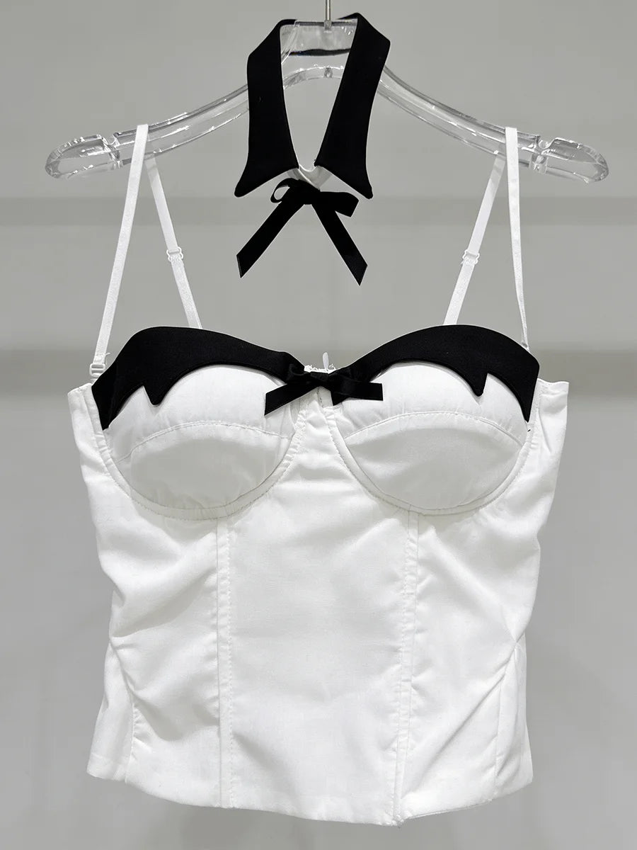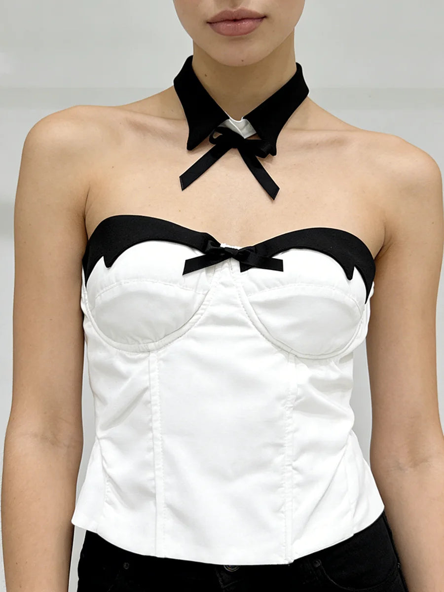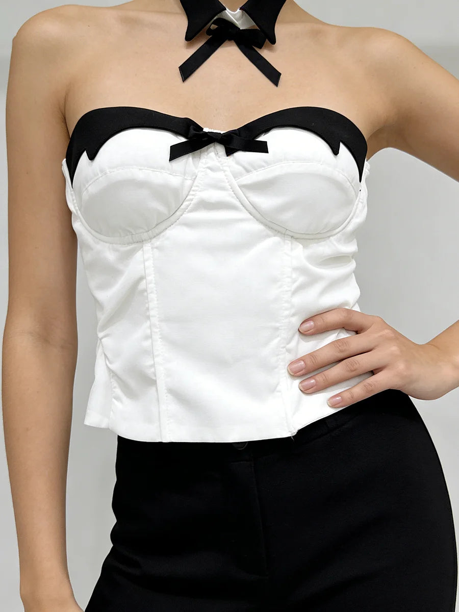 The bold black contrast detailing outlines the bust and neckline, finished with a delicate bow accent for a playful, feminine touch. A detachable matching collar accessory adds versatility — wear it bold or keep it sleek and strapless. Adjustable straps allow for a personalized fit, making this top a standout essential for styling with tailored pants, skirts, or leather looks.