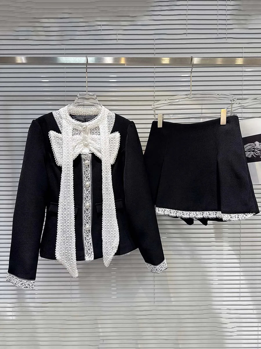 Trend4us Elegant Lace Bow-Collar Blazer & Shorts Set