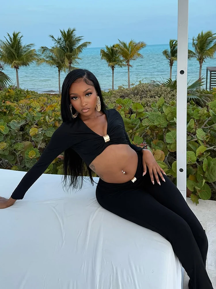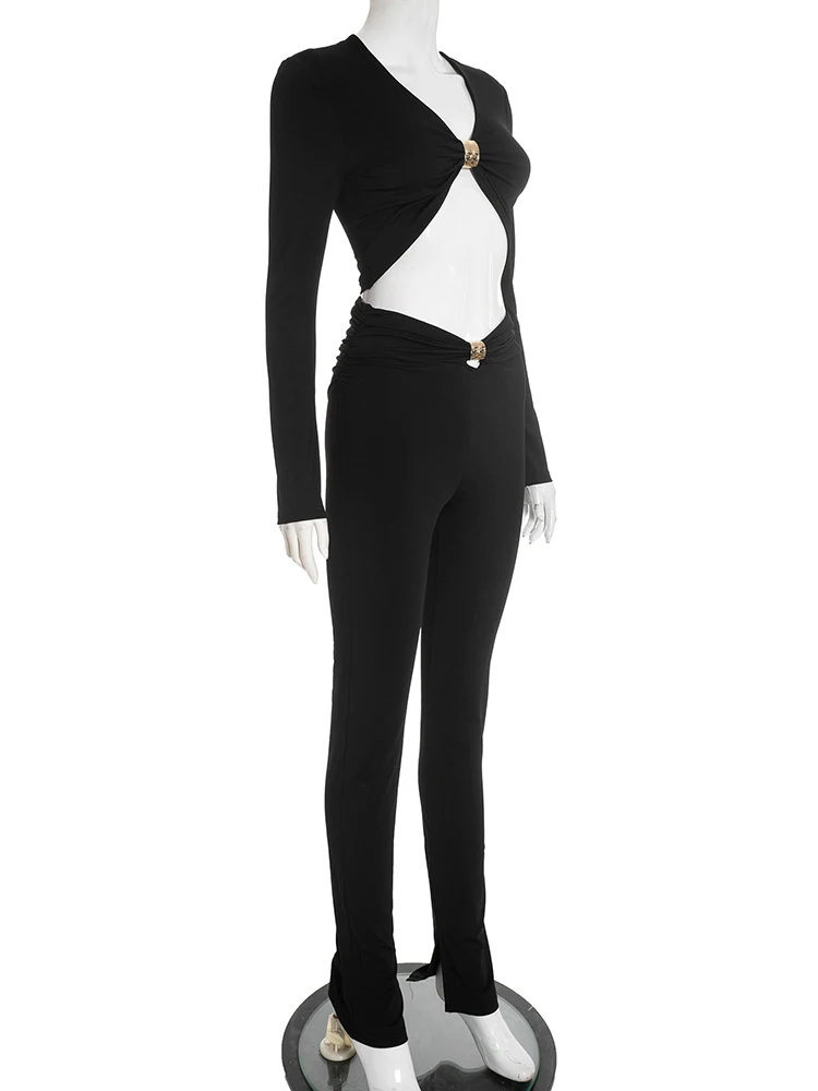 Step into the spotlight with our Trend4us Glam Metal Accent Cutout Lounge Set — designed for confident, modern style. This two-piece outfit features a long-sleeve crop top with a striking midriff cutout and luxe gold-tone ring hardware that enhances your shape. The matching high-waist slim pants sculpt your silhouette with a smooth stretch fit and elegant ankle front slits, perfect for showcasing heels.
