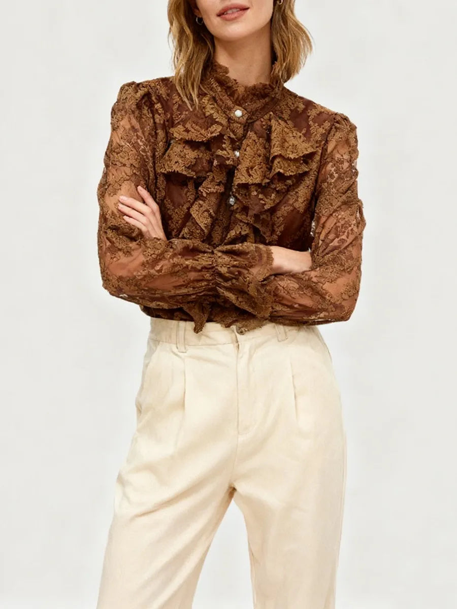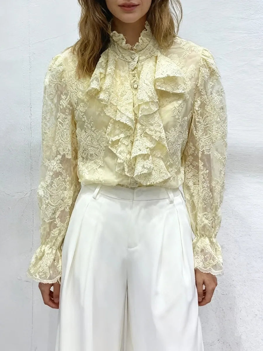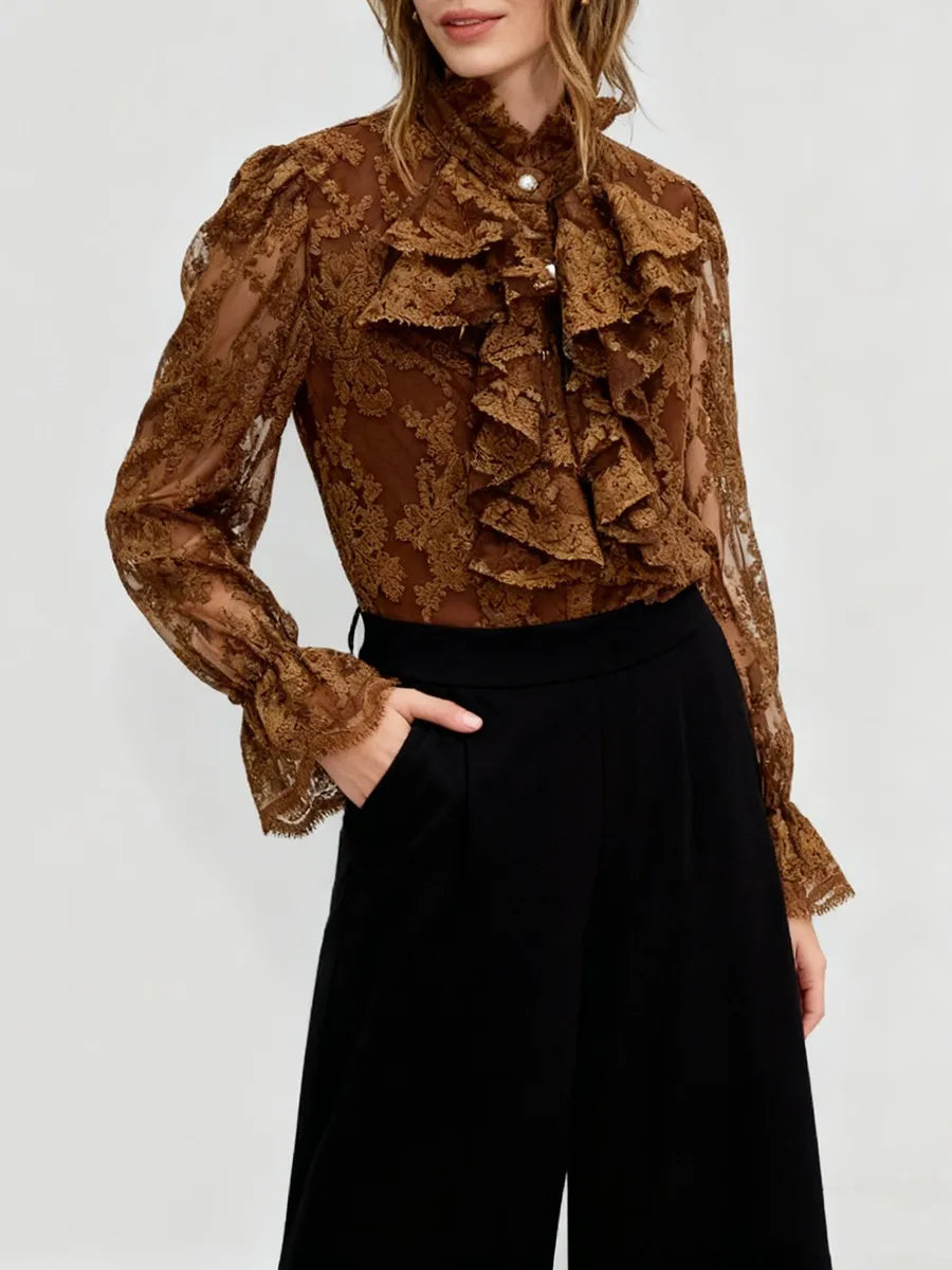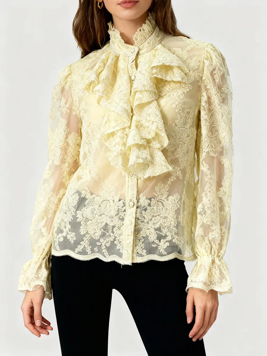 Indulge in timeless elegance with the Trend4us Luxe Embroidered Ruffled Lace Blouse — a statement piece crafted for the sophisticated and feminine wardrobe. Featuring a beautifully embroidered floral lace overlay, this blouse exudes romantic charm with every detail. The high ruffled Victorian neckline and cascading front flounces deliver a dramatic yet graceful silhouette, while the sheer sleeves and delicate scalloped edges add a touch of allure.